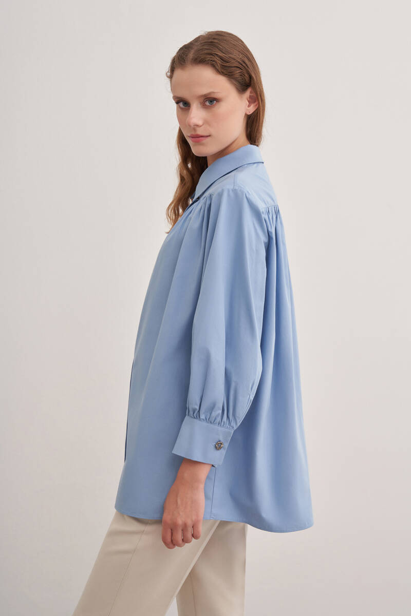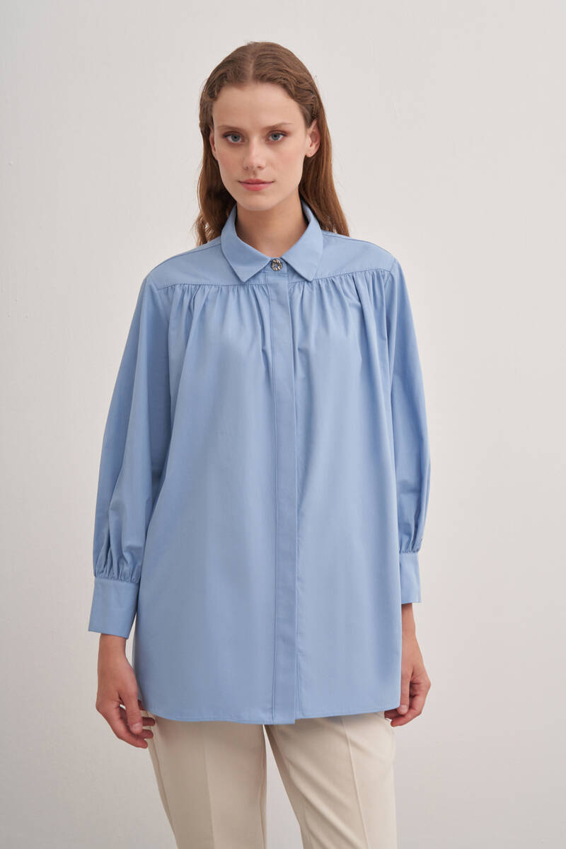 Saks Ön Göğüs Kısmı Pile ve Parça Detaylı Bluz