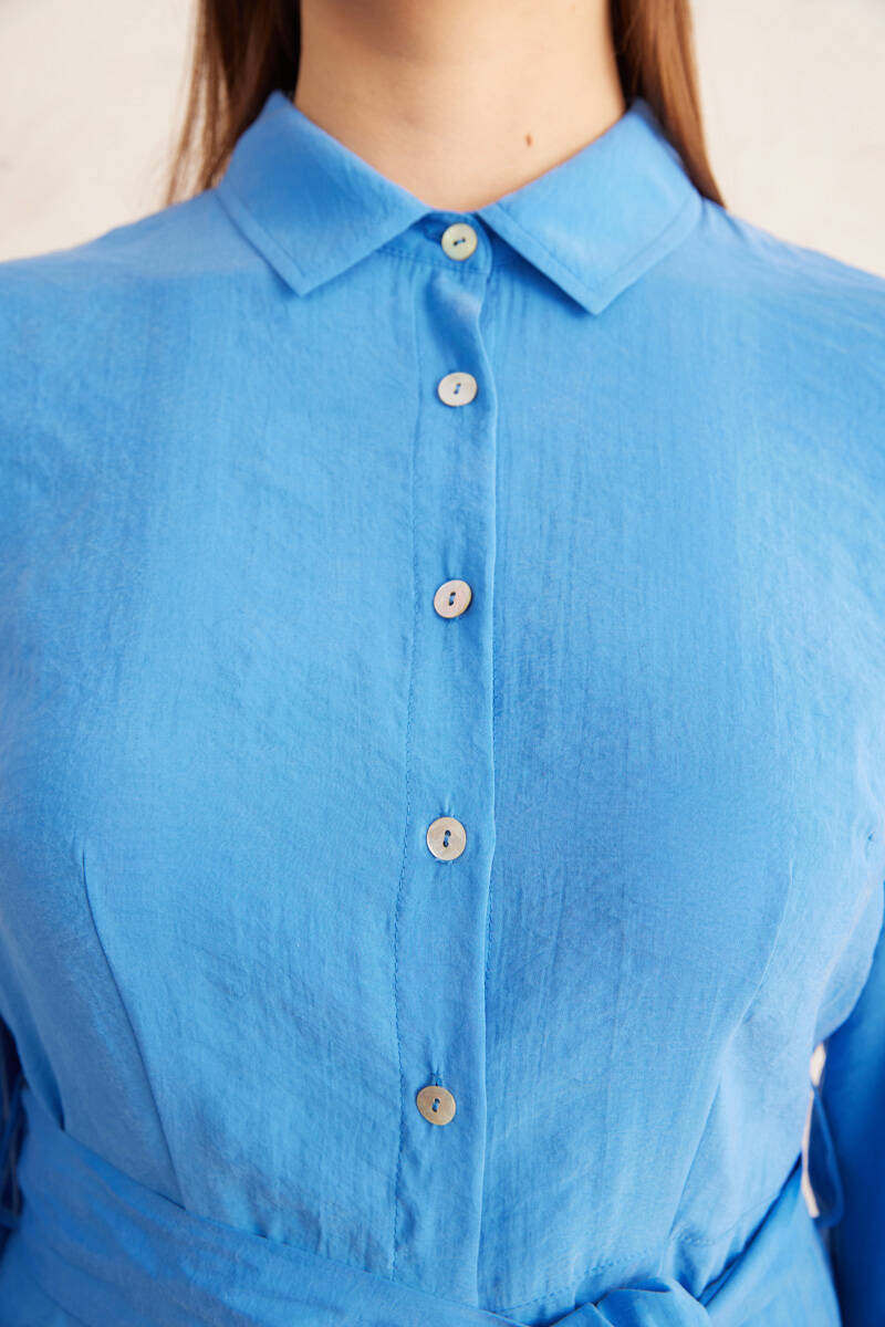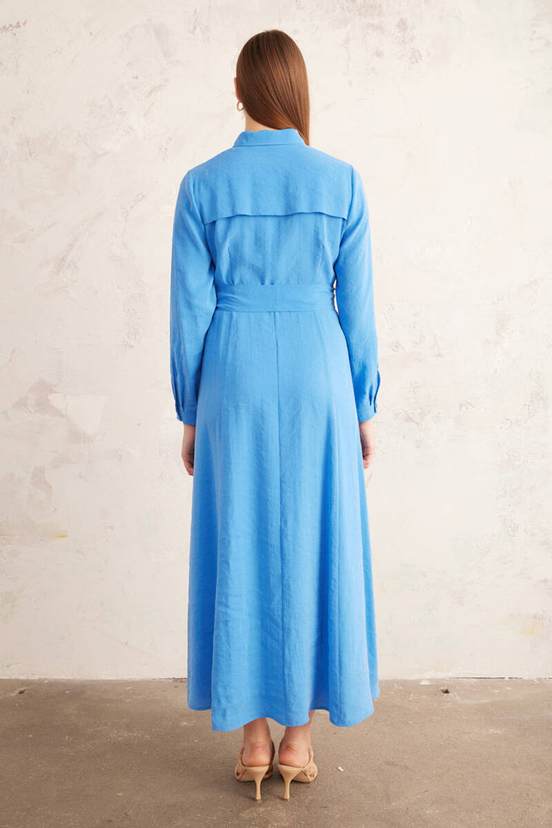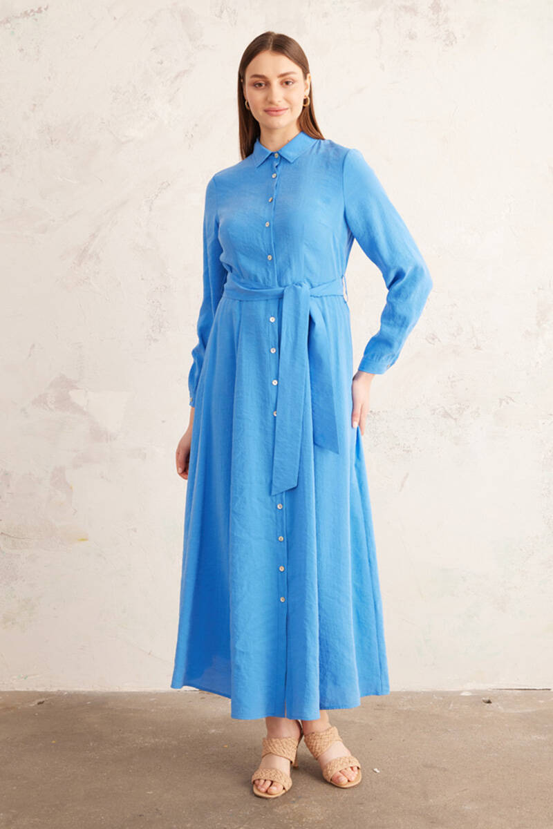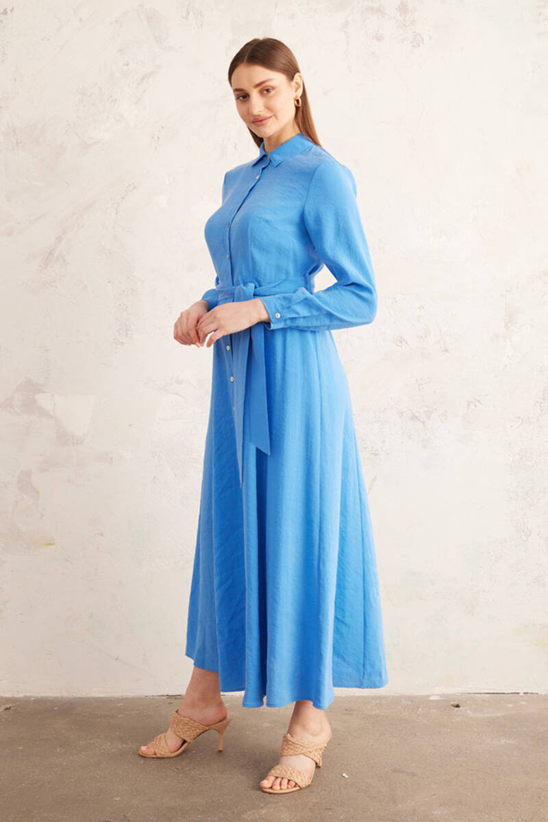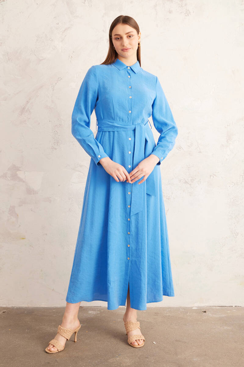 Mavi Belden Oturan Yakalı Elbise