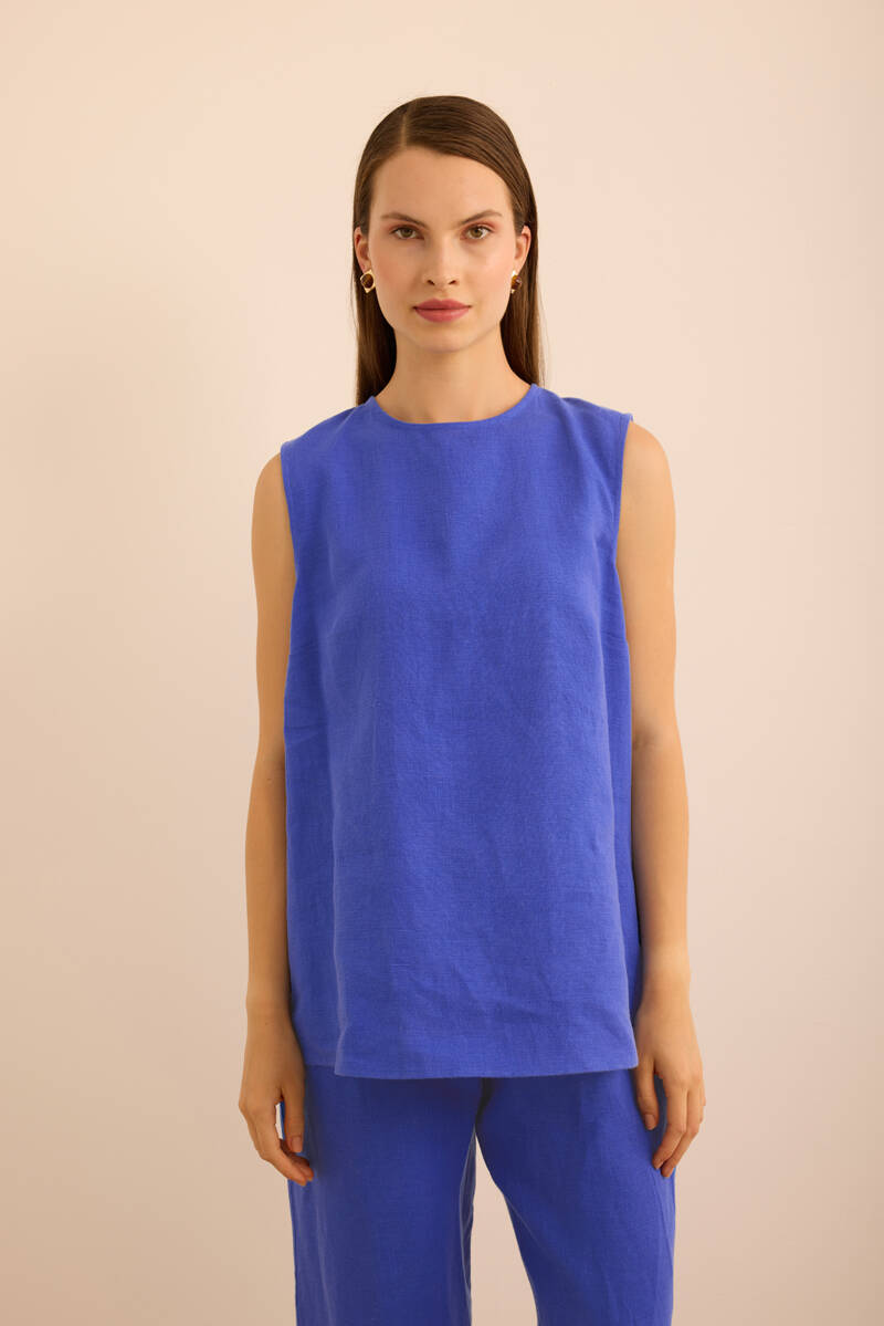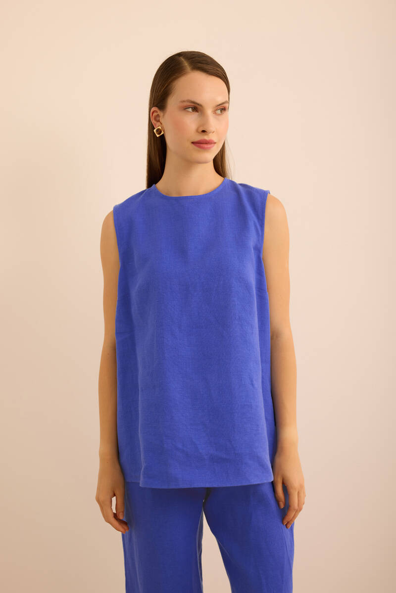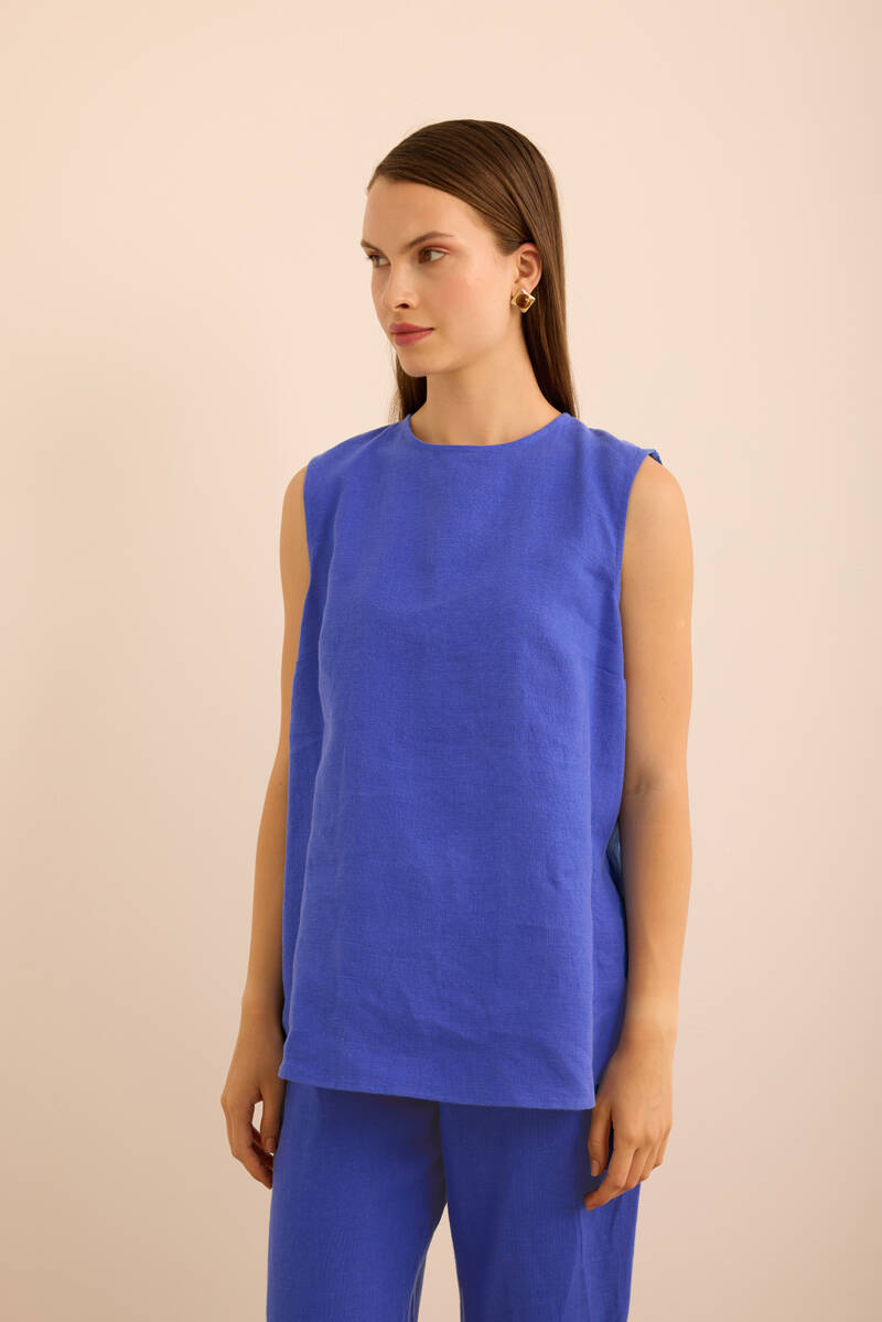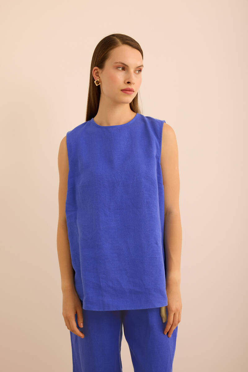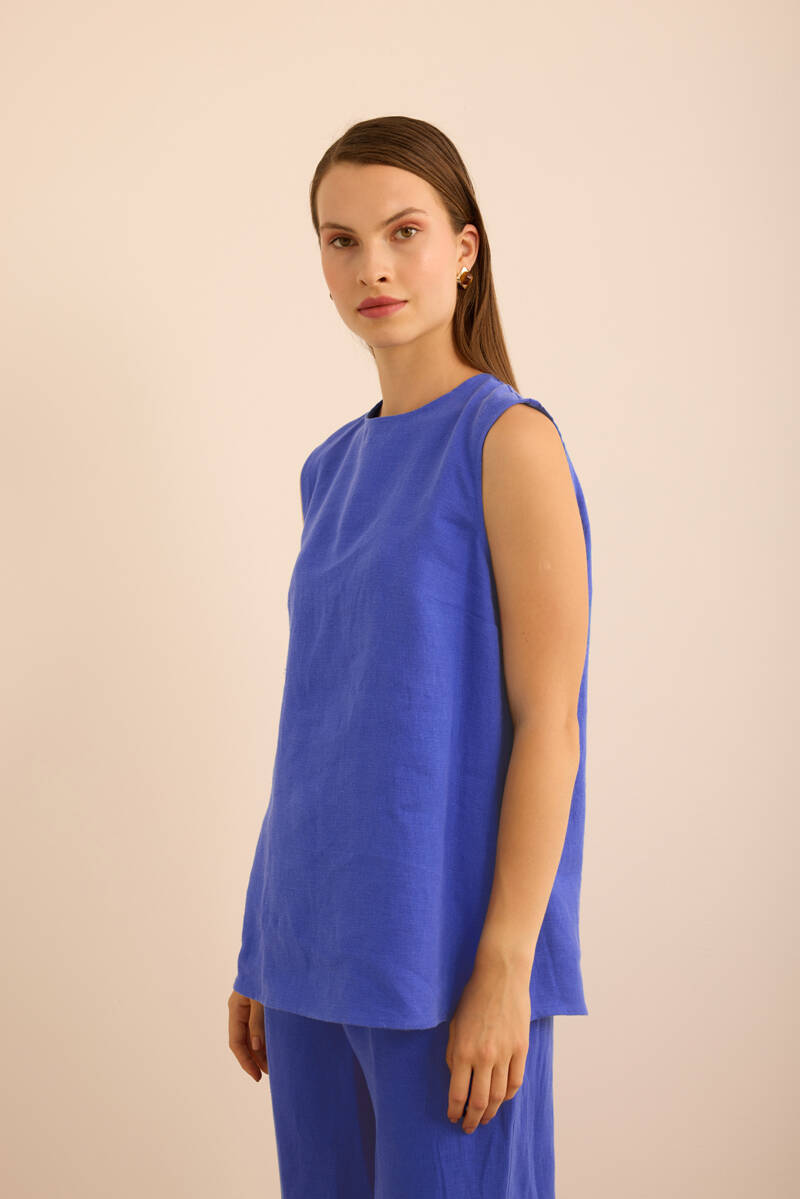 Ekru Omuzları Büzgü Detaylı Dokuma Kolsuz Bluz