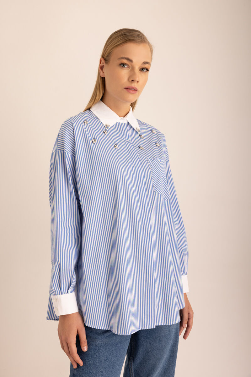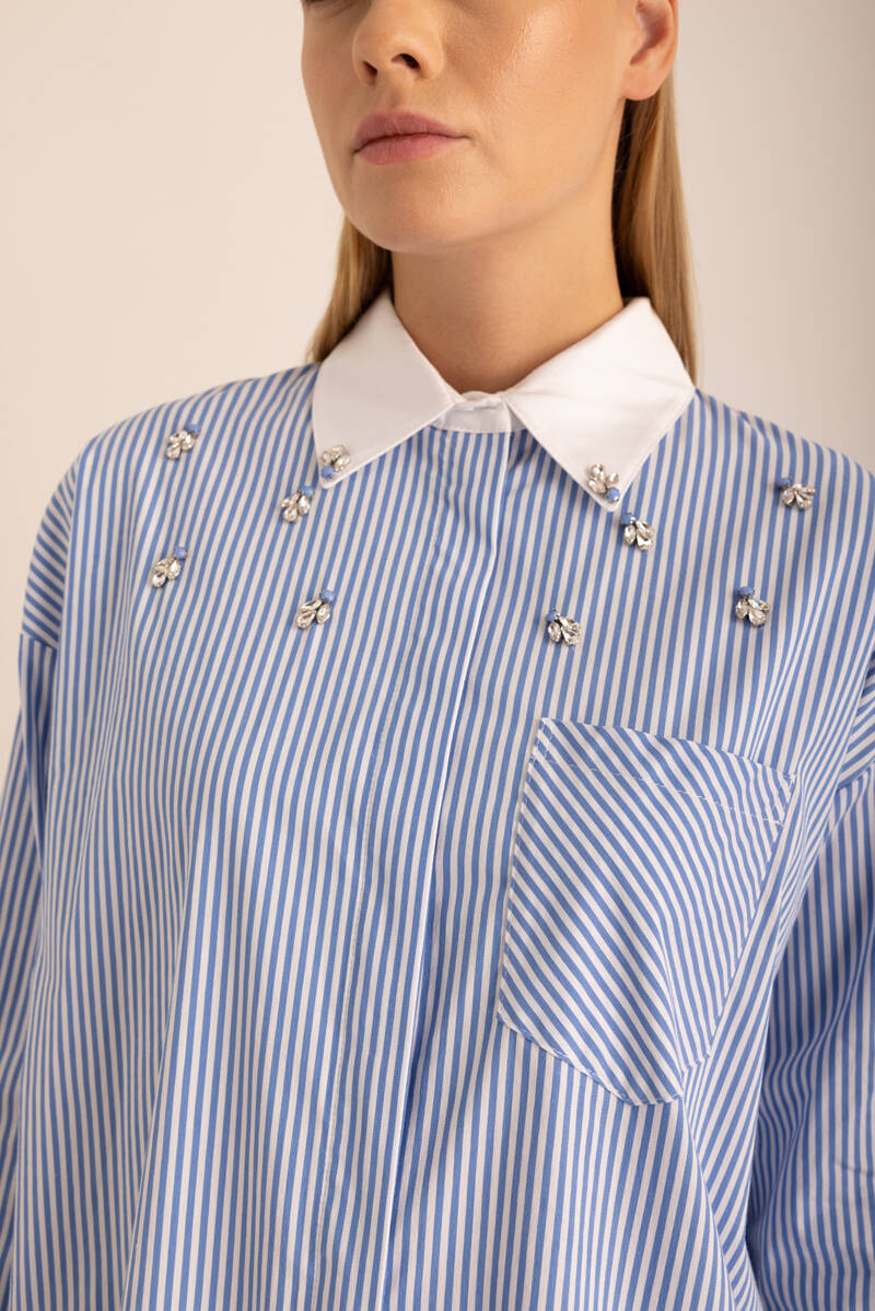 Mavi Çizgili Cotton Taş İşlemeli Gömlek