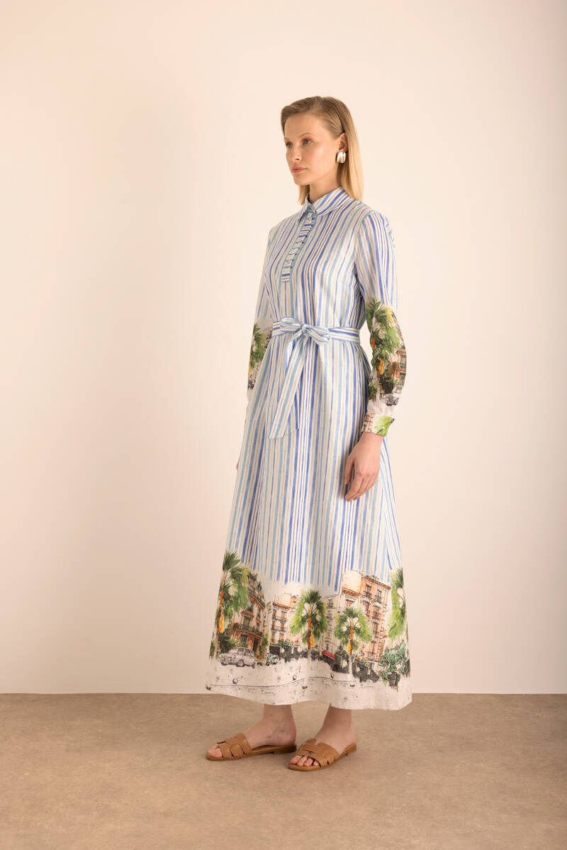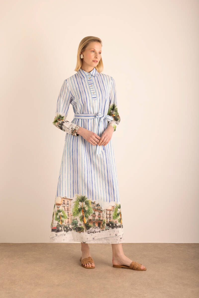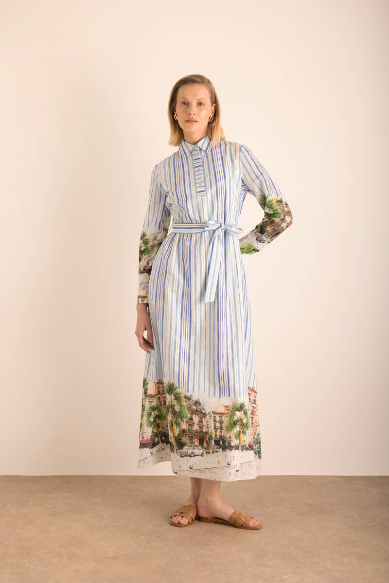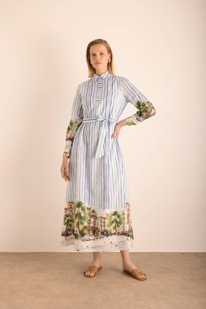 Mavi Çizgi Desenli Cotton Elbise
