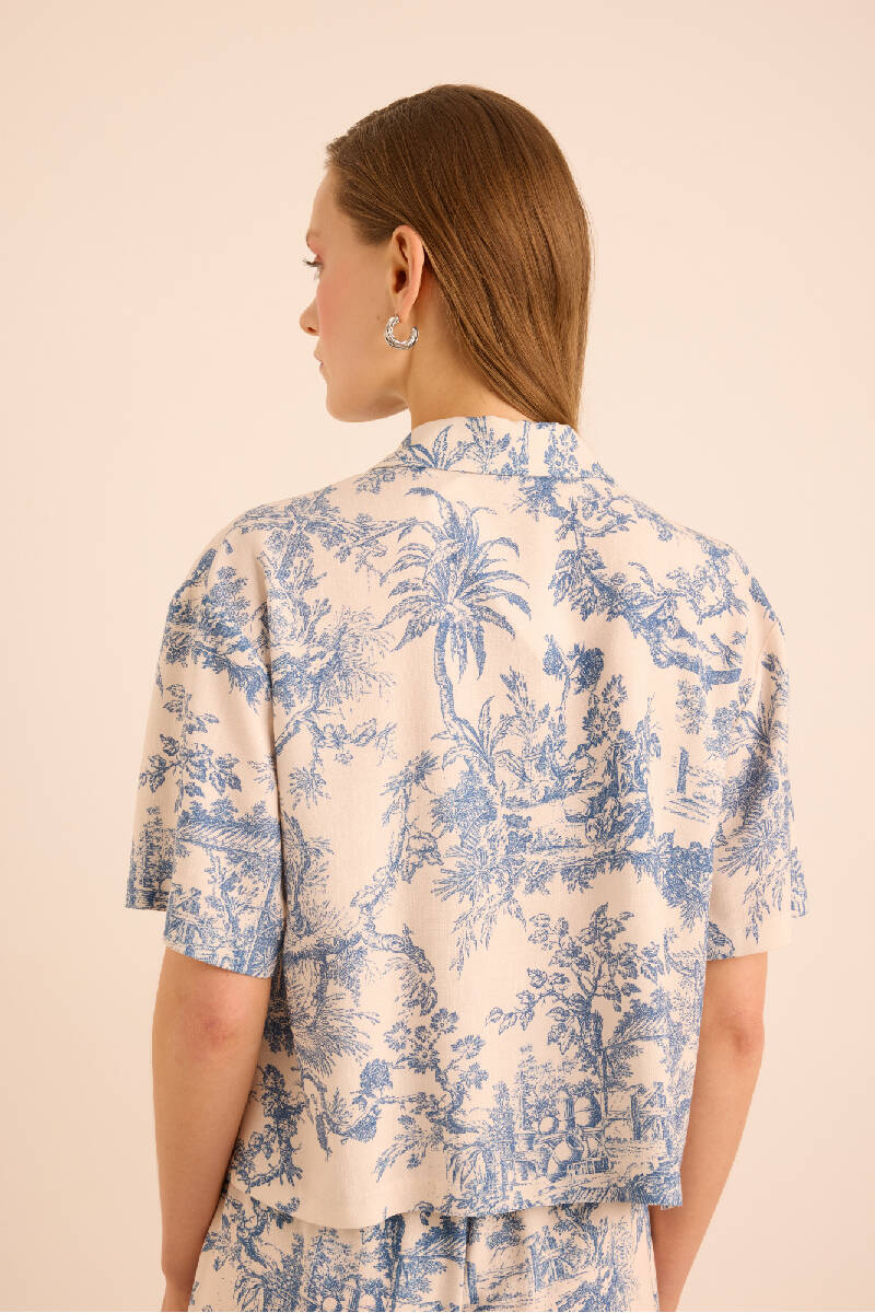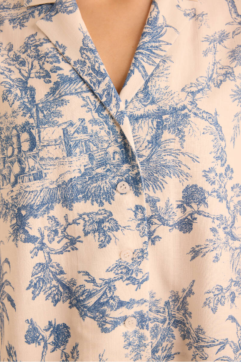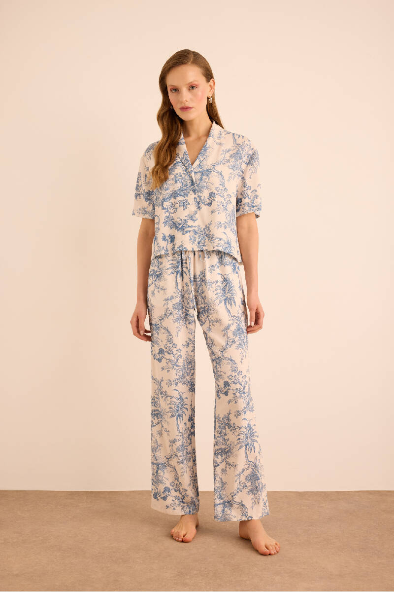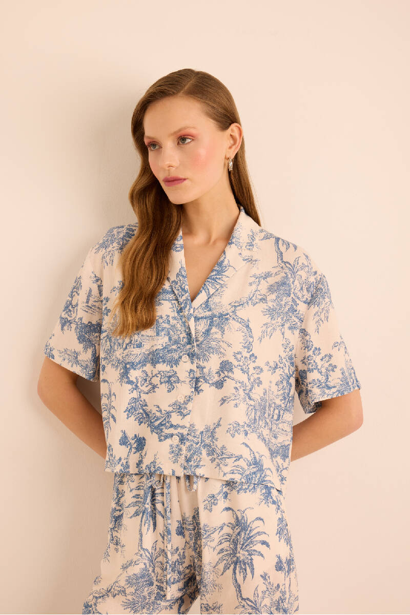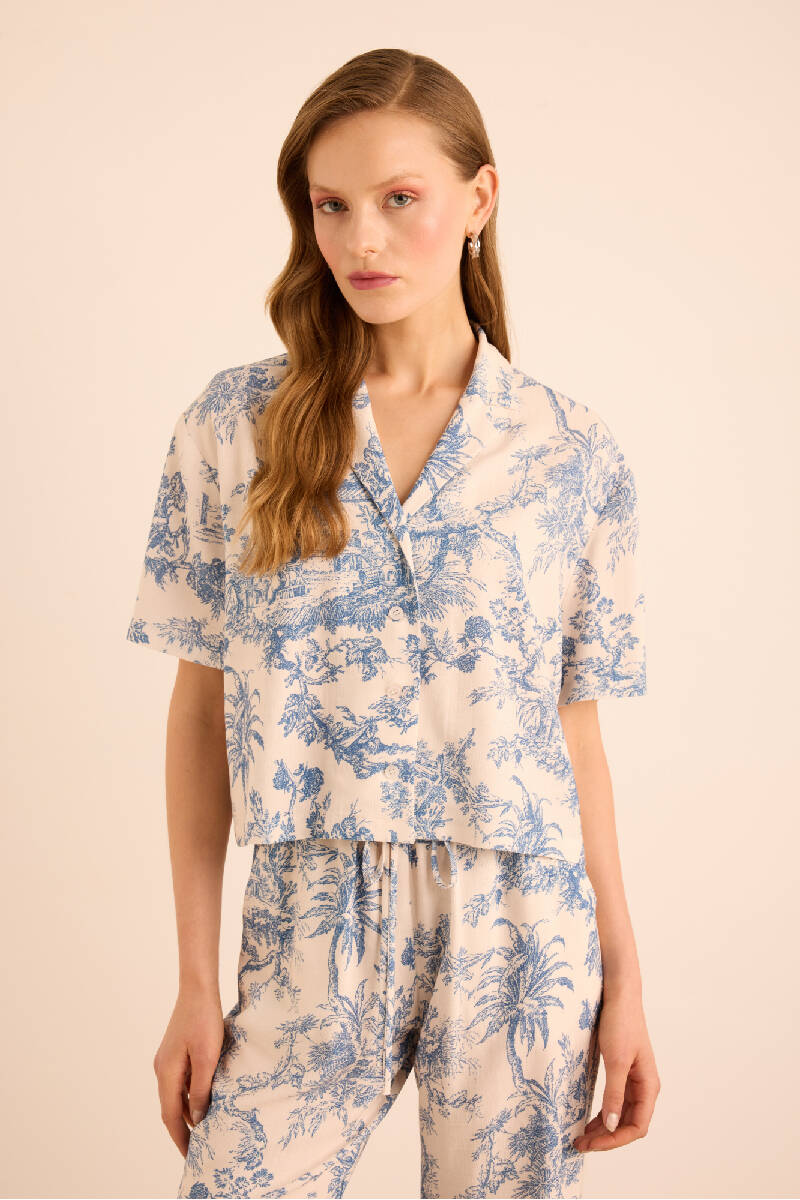 Mavi Desenli Viscon Keten , Önden Düğmeli Pijama Üstü