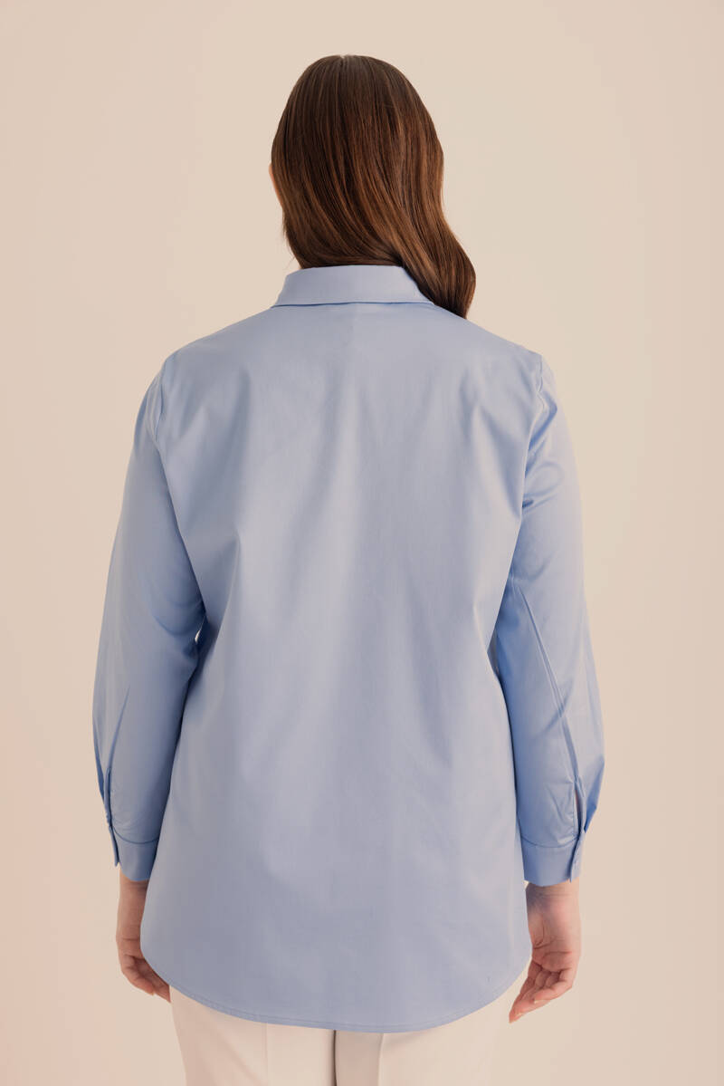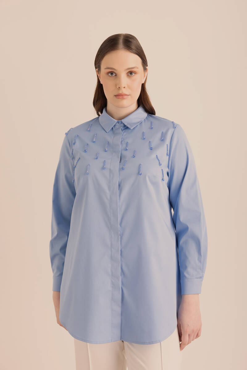 Mavi Yakası İşleme Detaylı Dokuma Gömlek