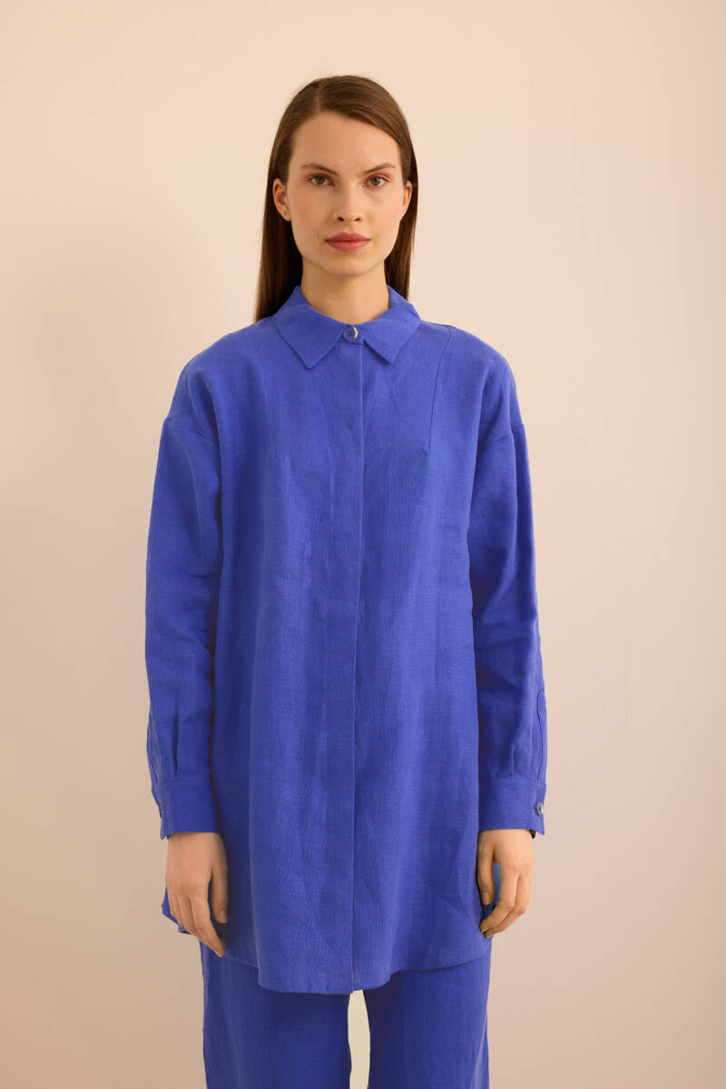 Mavi Bisiklet Yaka Kolsuz Keten Bluz