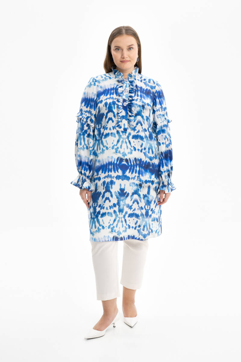 Mavi Yakası Ve Kolları Detaylı Desenli Tunik