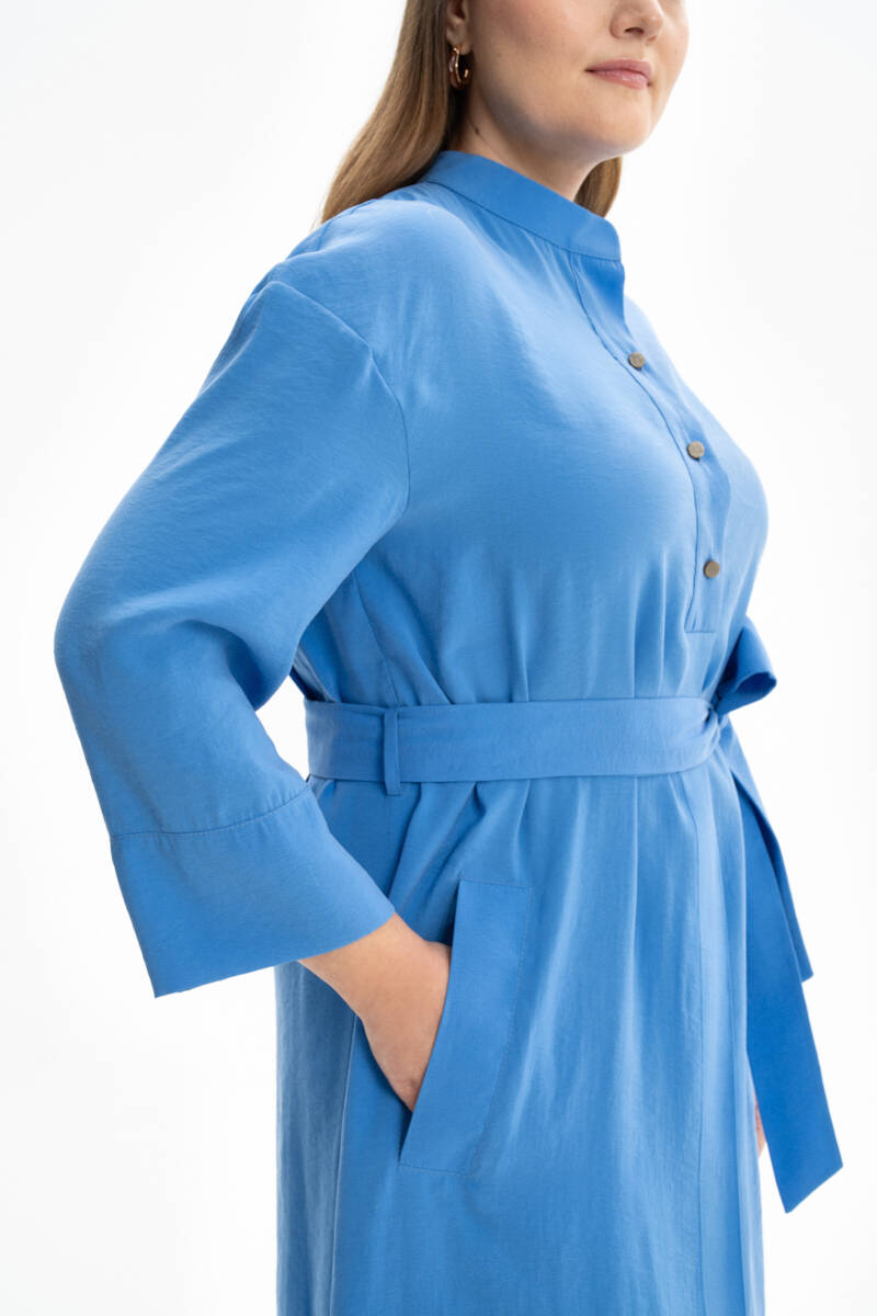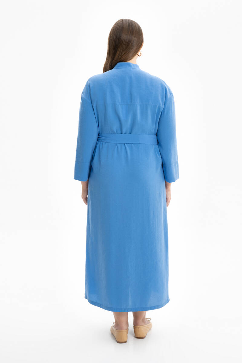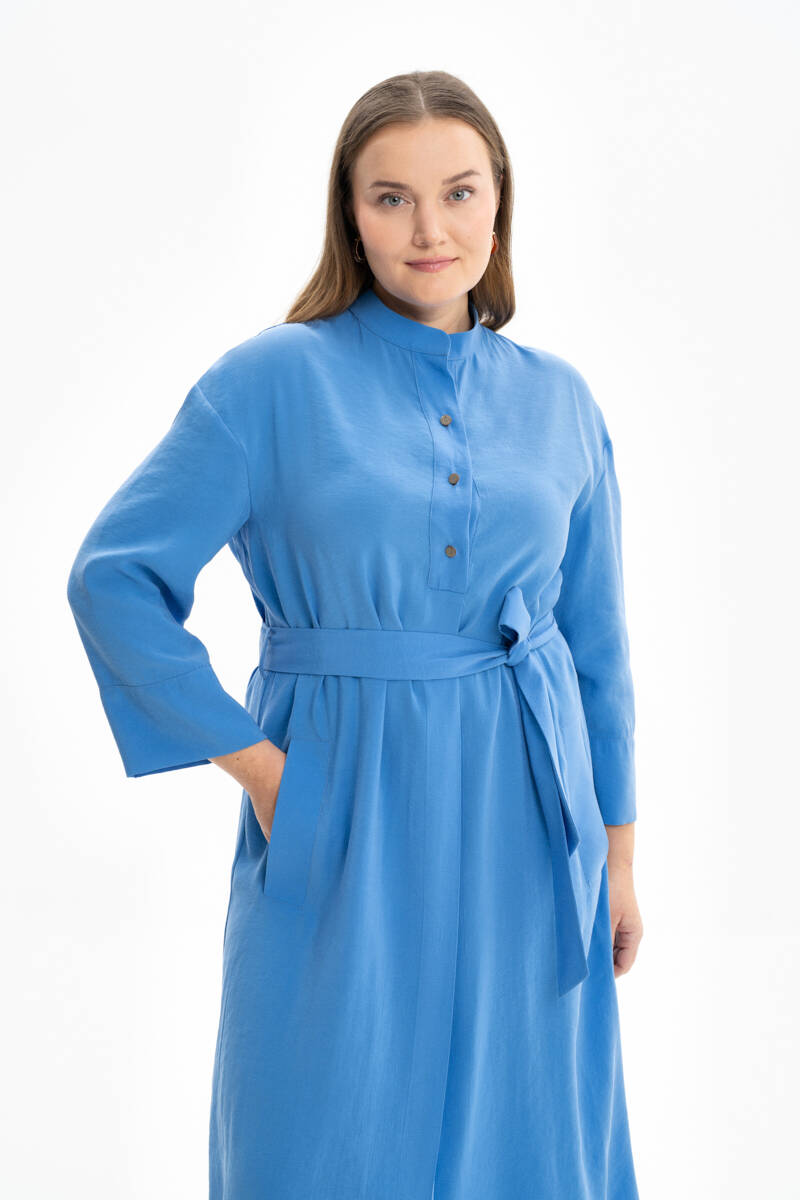 Mavi Yarım Pat Detaylı Belden Kuşaklı Elbise