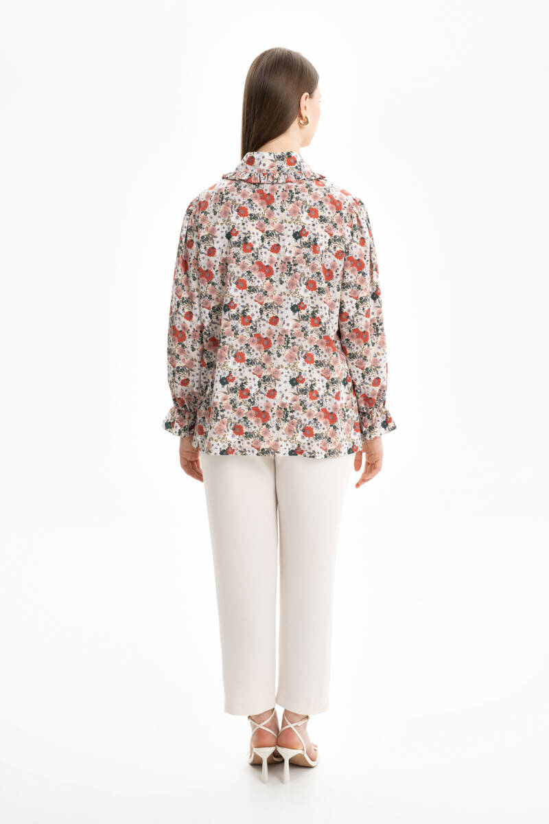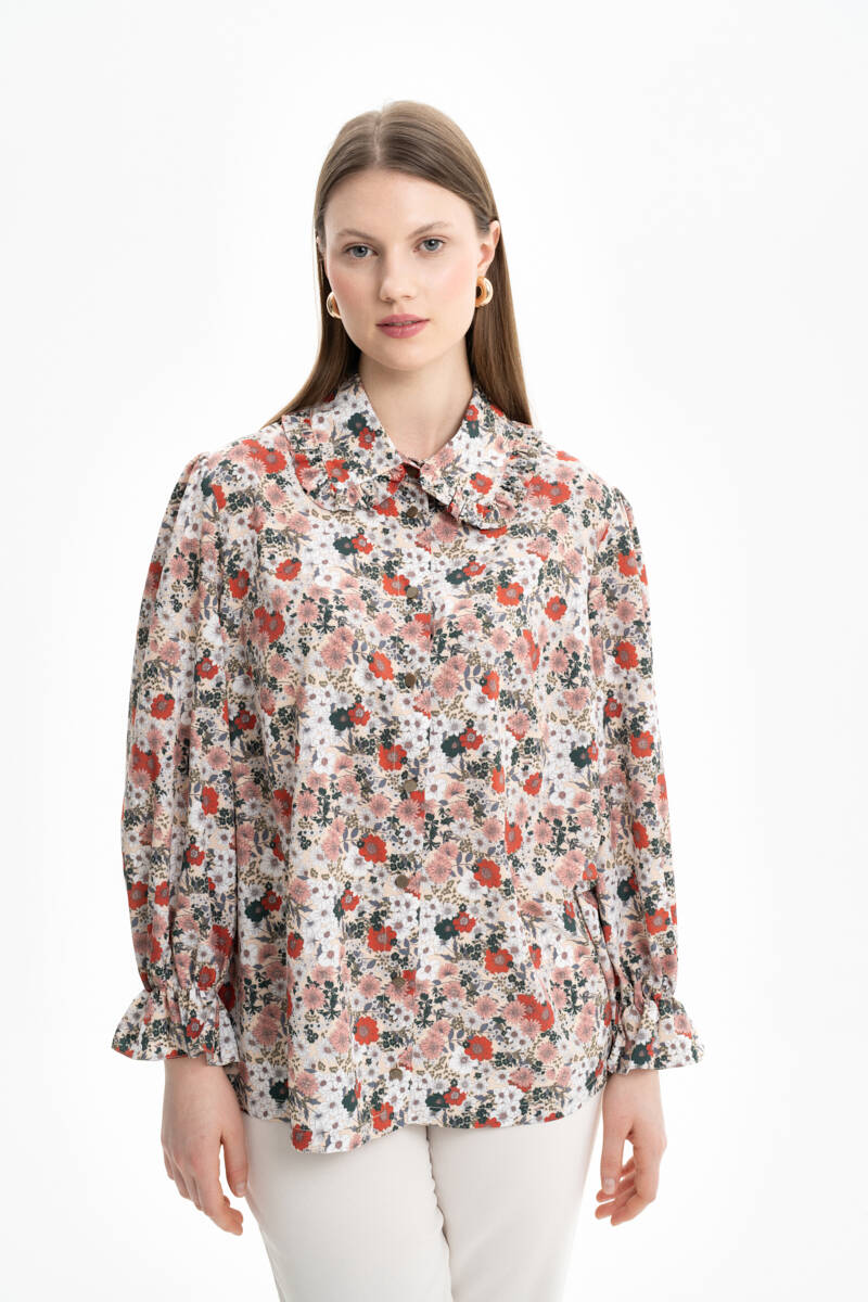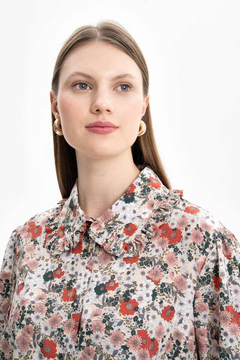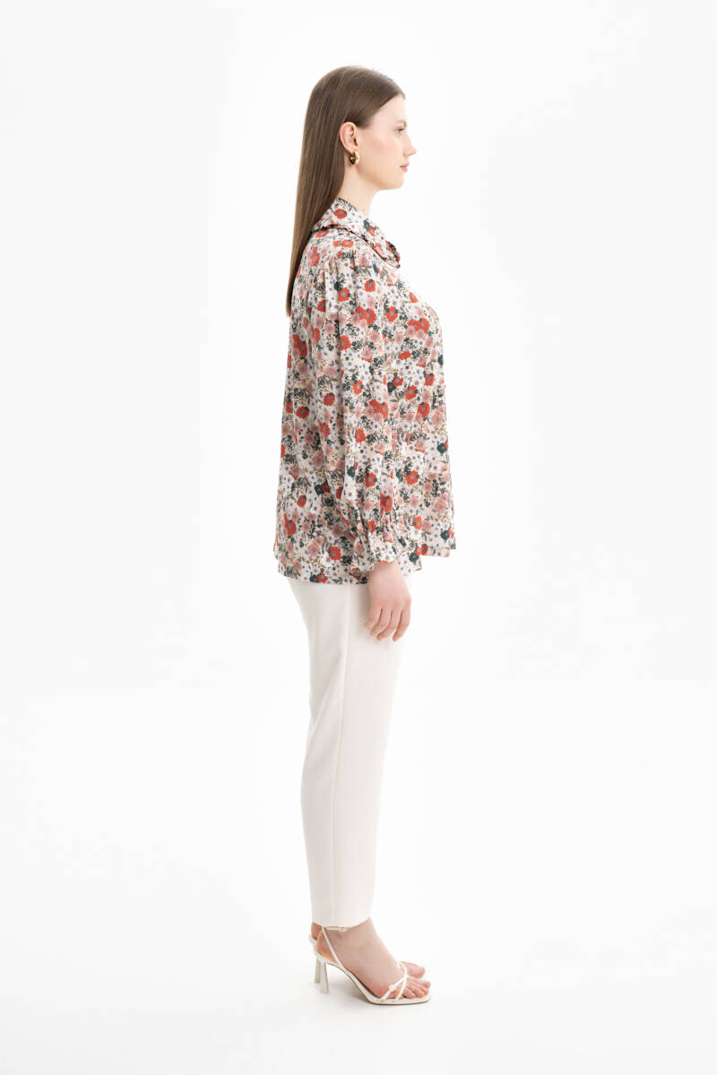 Mint Yakası Ve Kolları Detaylı Desenli Bluz