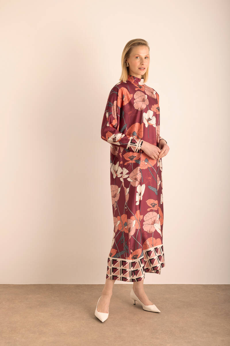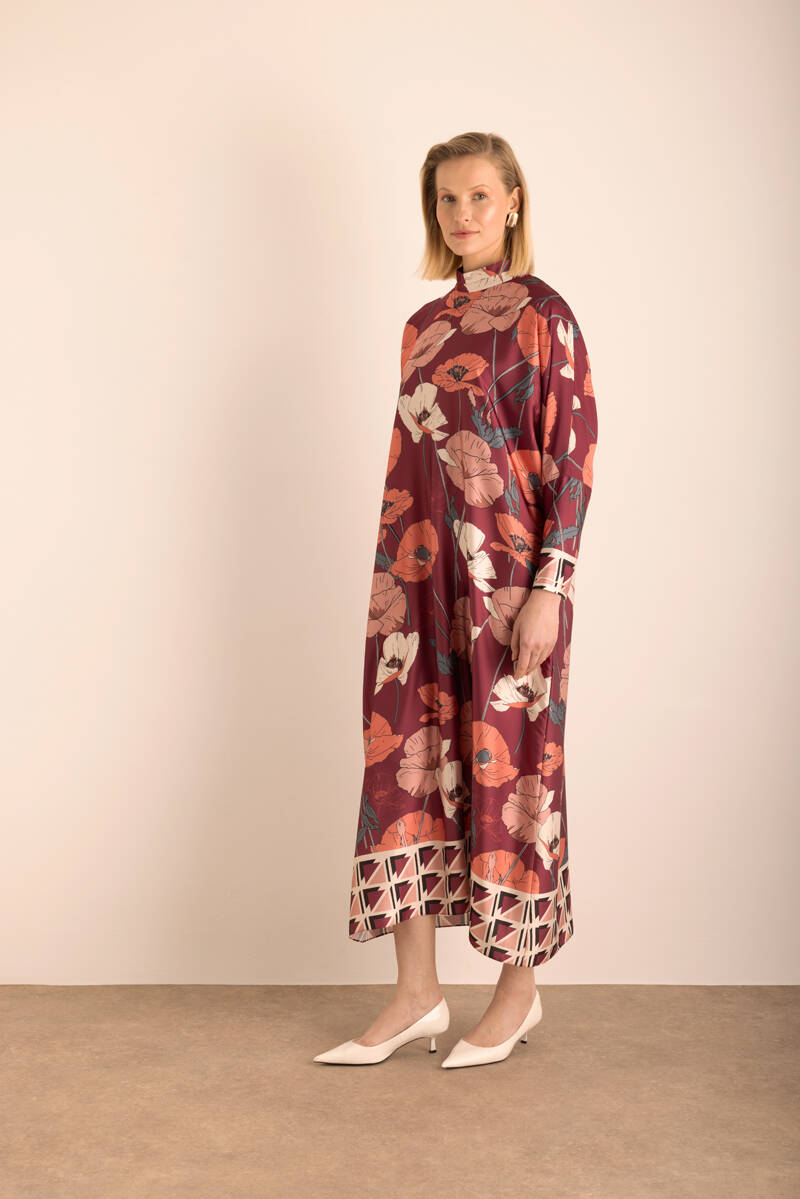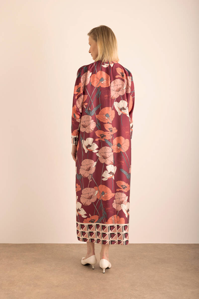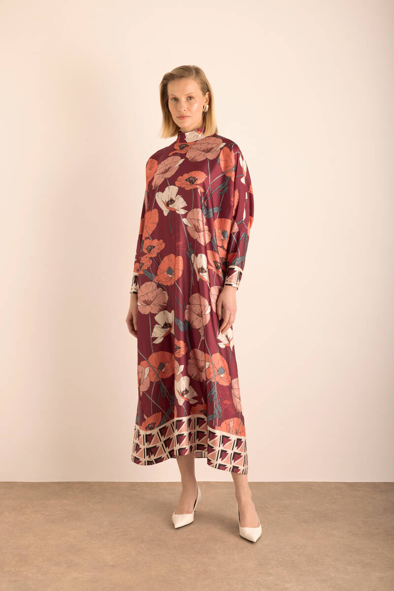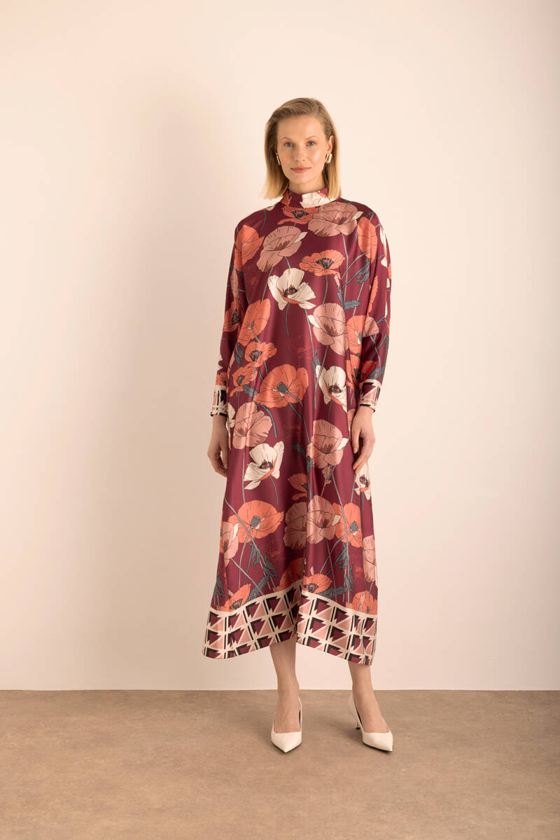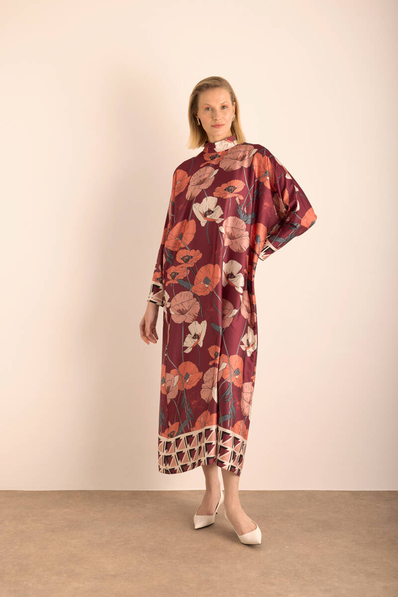 Kırmızı Çiçek Desenli İnce dokuma Elbise