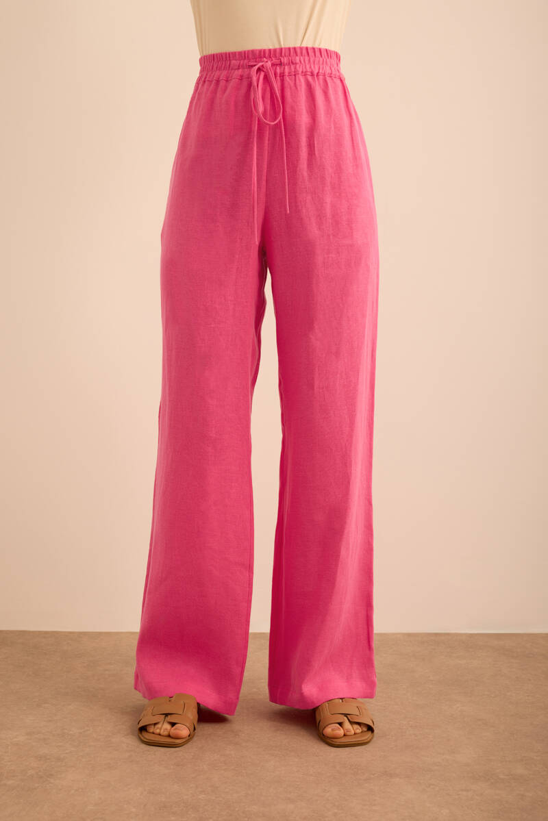Fuşya Beli ve Paçası Lastikli Balon Form Keten Pantolon