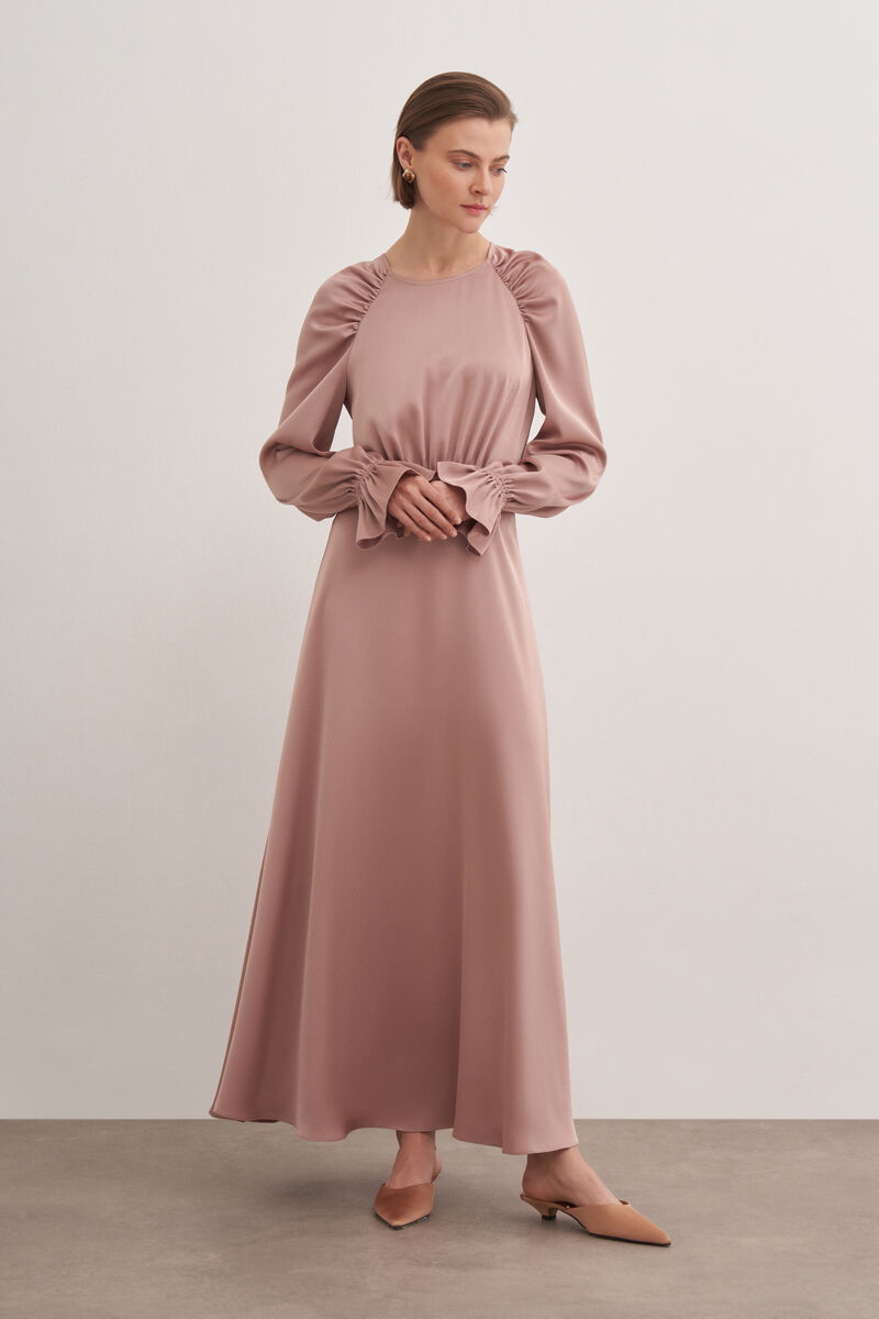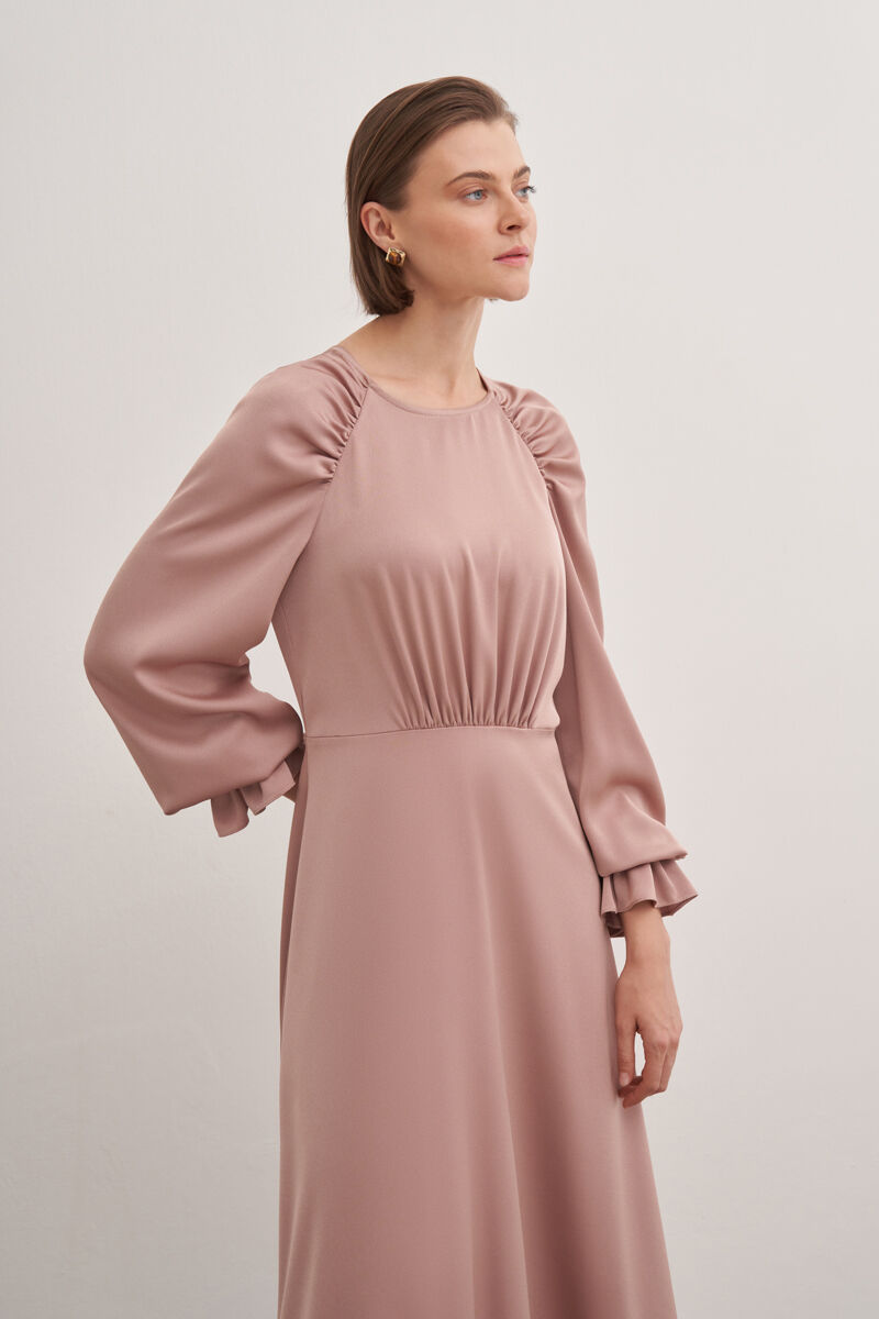 Bej Hacimli Cotton Brode Elbise