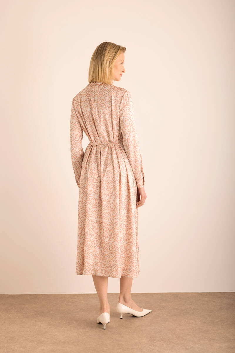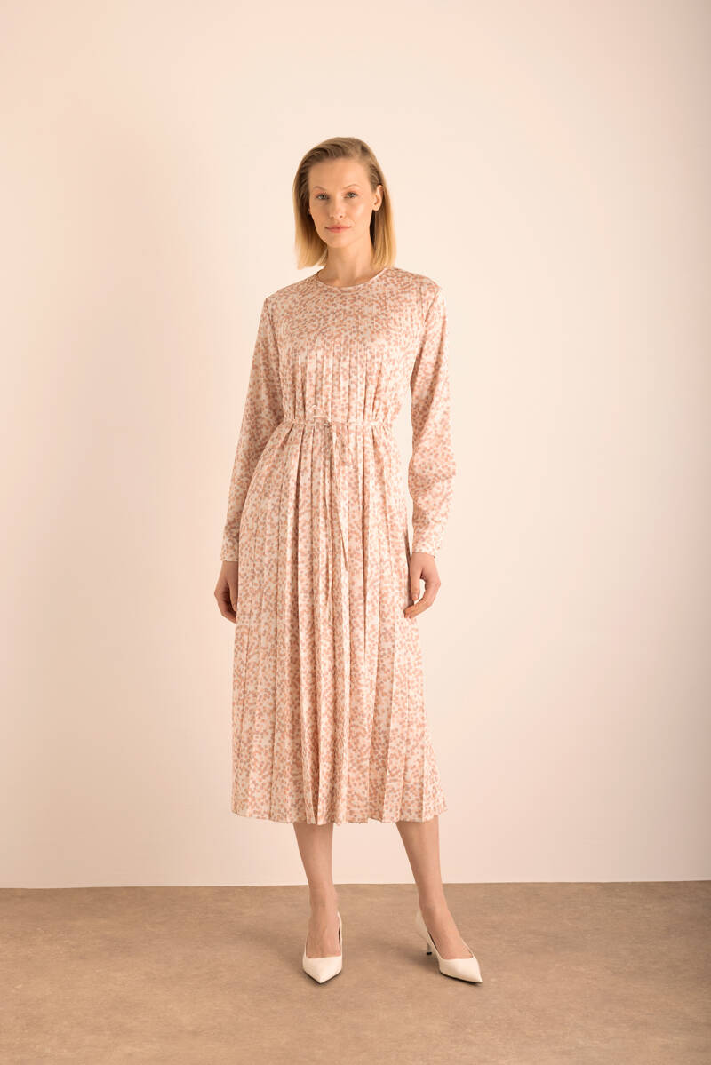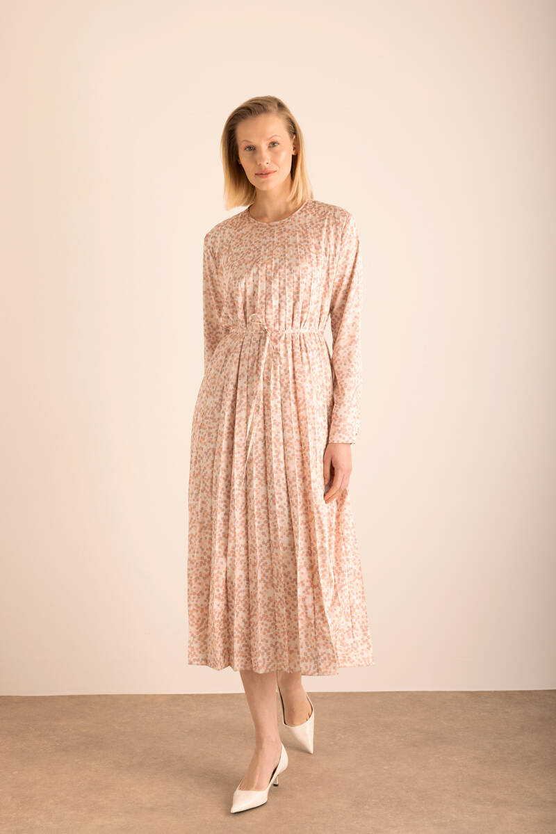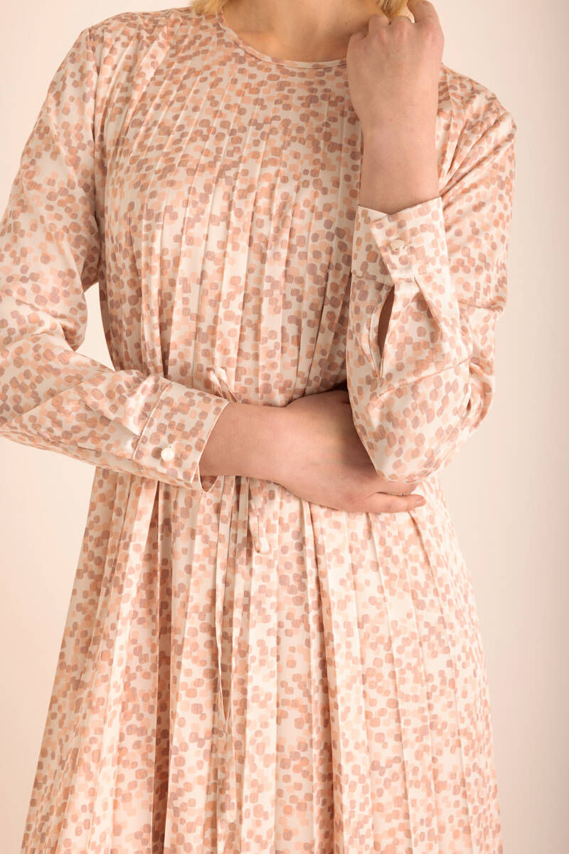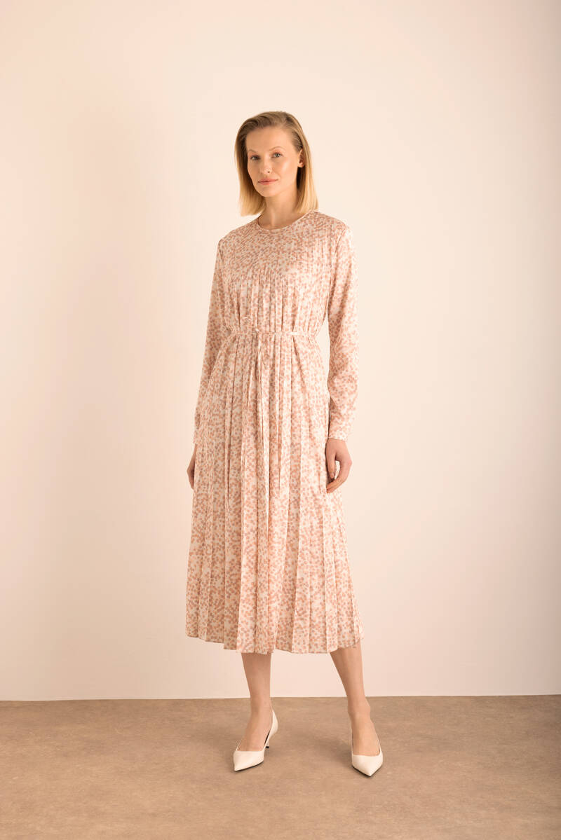 Pudra Kare Desenli Pilisoley Detaylı Bağlamalı Elbise