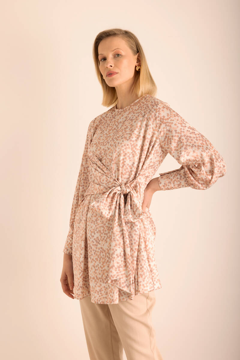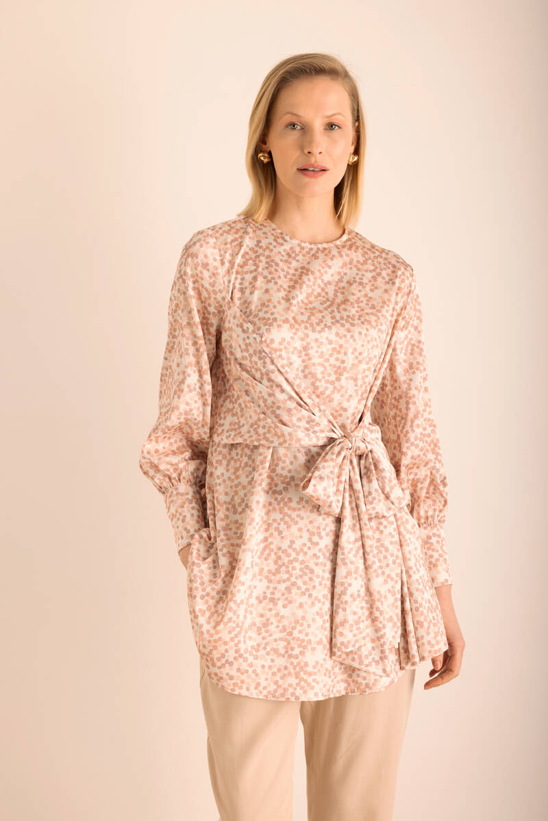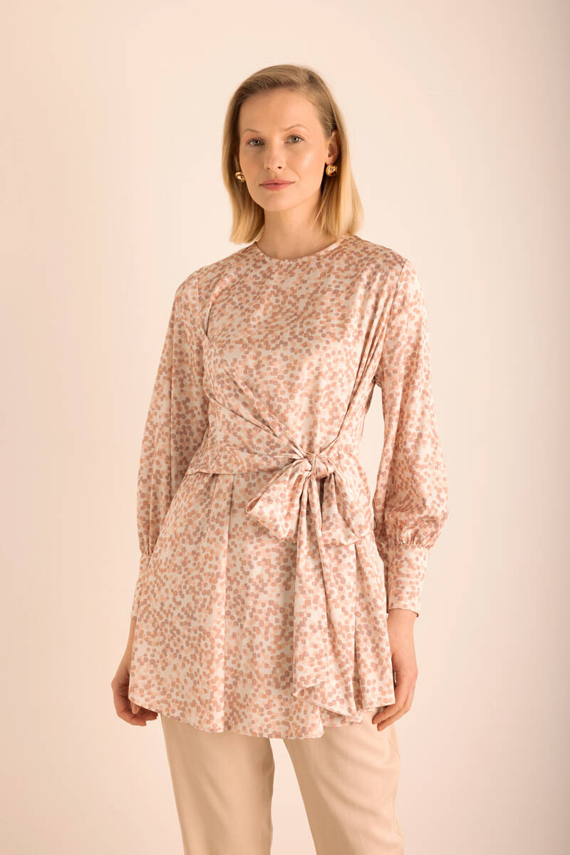 Pudra Küçük Kare Desenli Beli Bağlama Detaylı Bluz