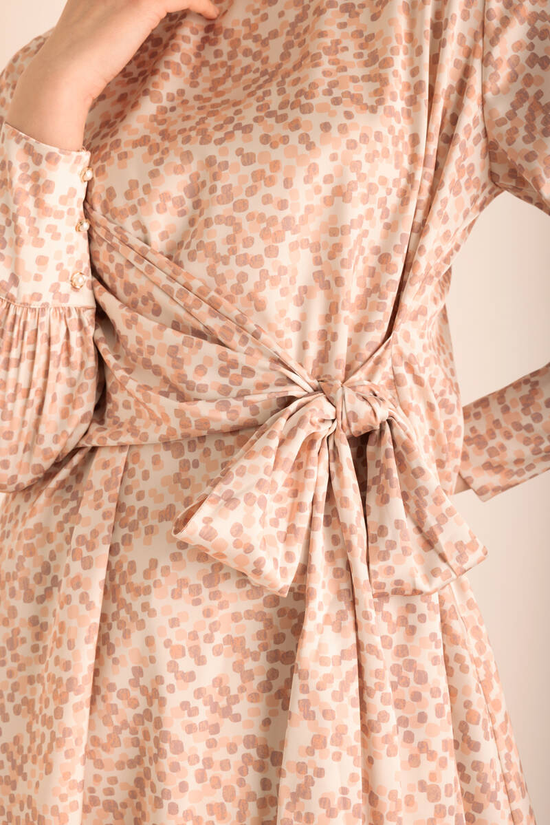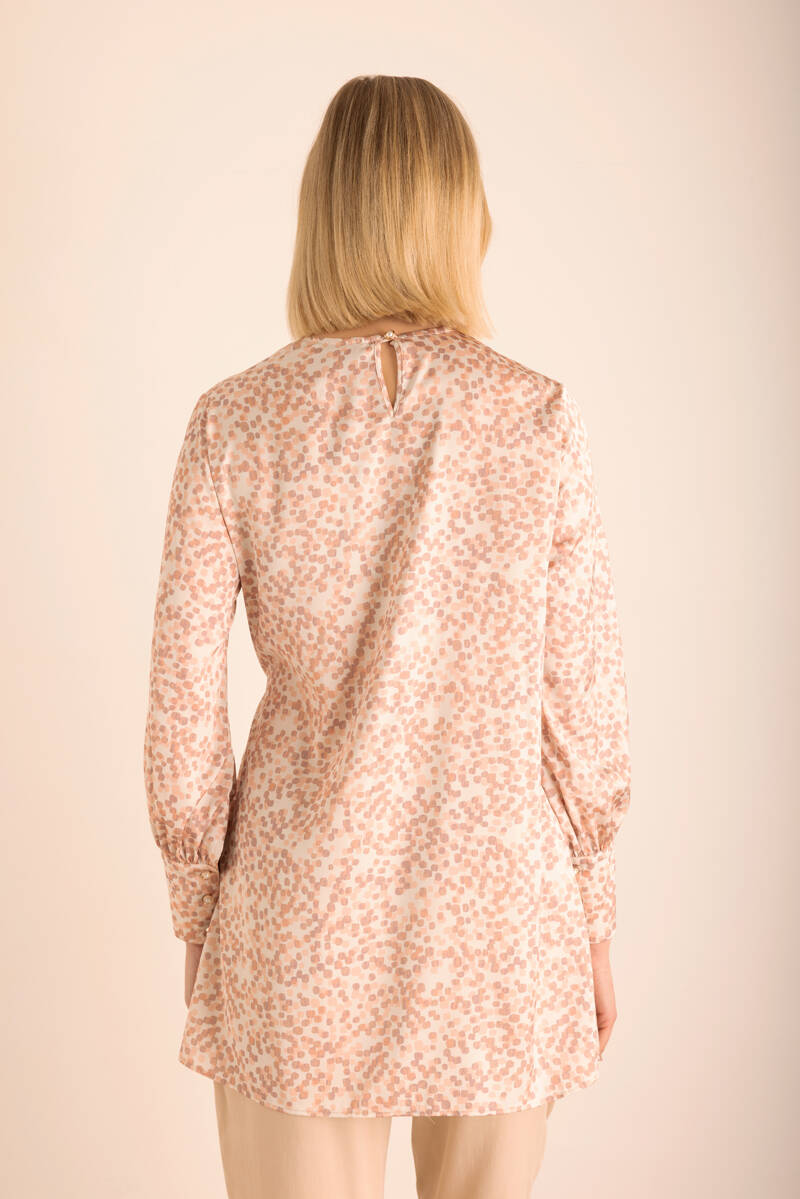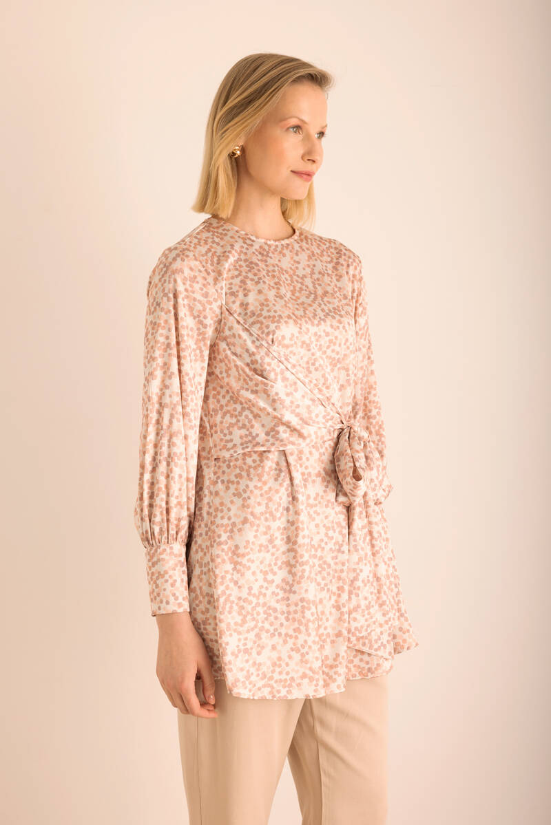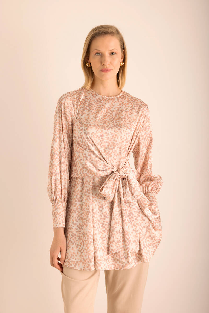 Pudra Küçük Kare Desenli Beli Bağlama Detaylı Bluz