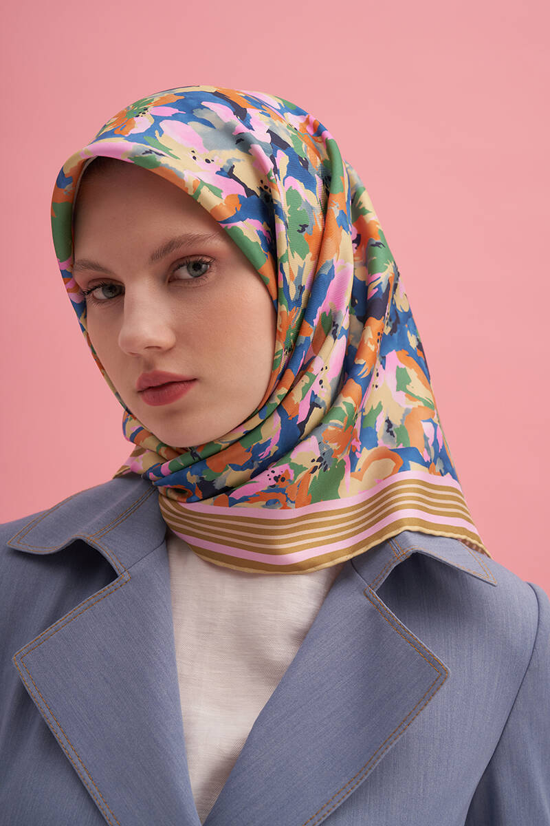 Çiçek Desenli 90X90 İpek Krep Saten Eşarp