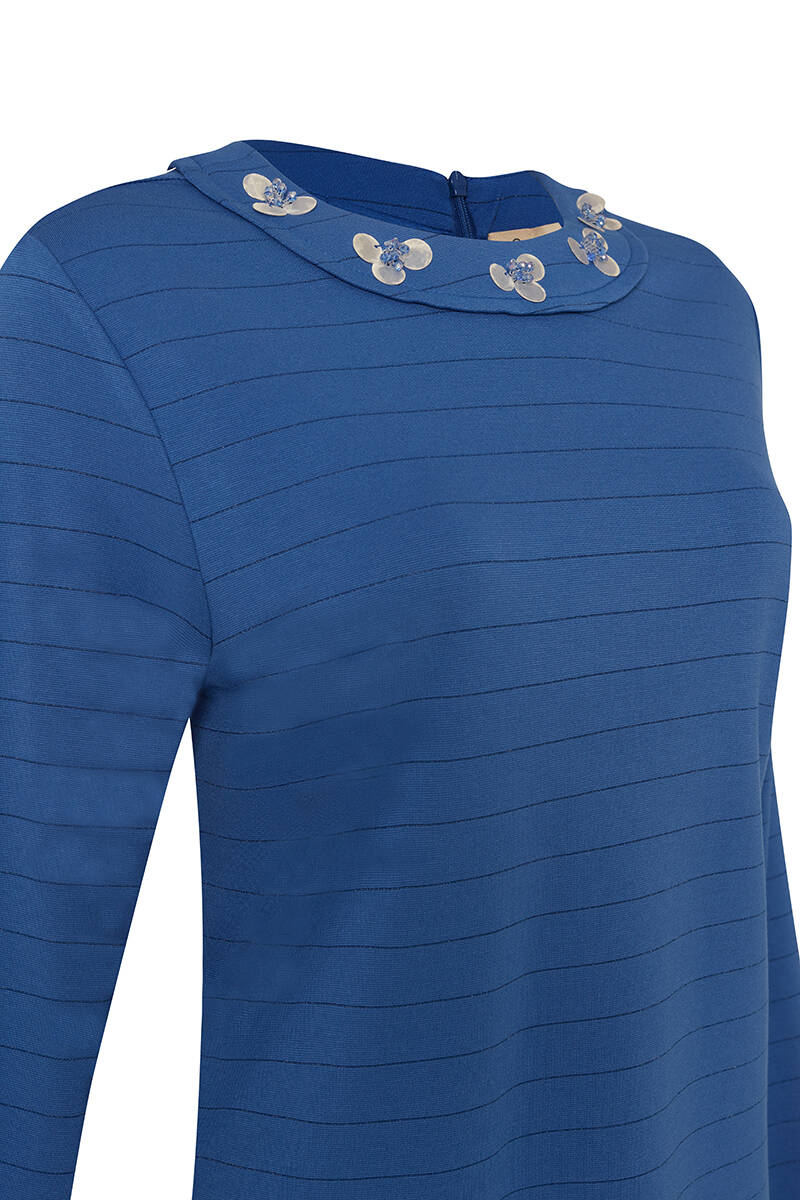 Saks Yakası İşleme Detaylı Çizgili Bluz