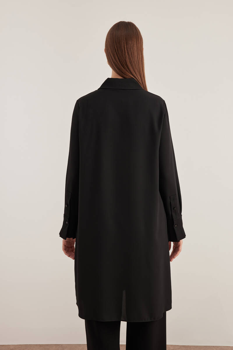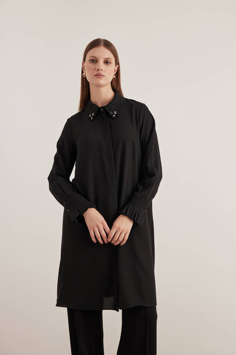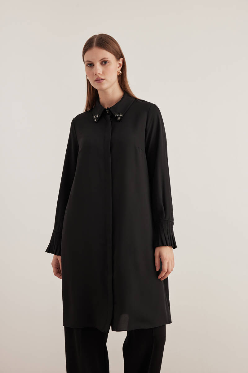 Siyah Yakası Fermuarlı Keten Tencel Tunik