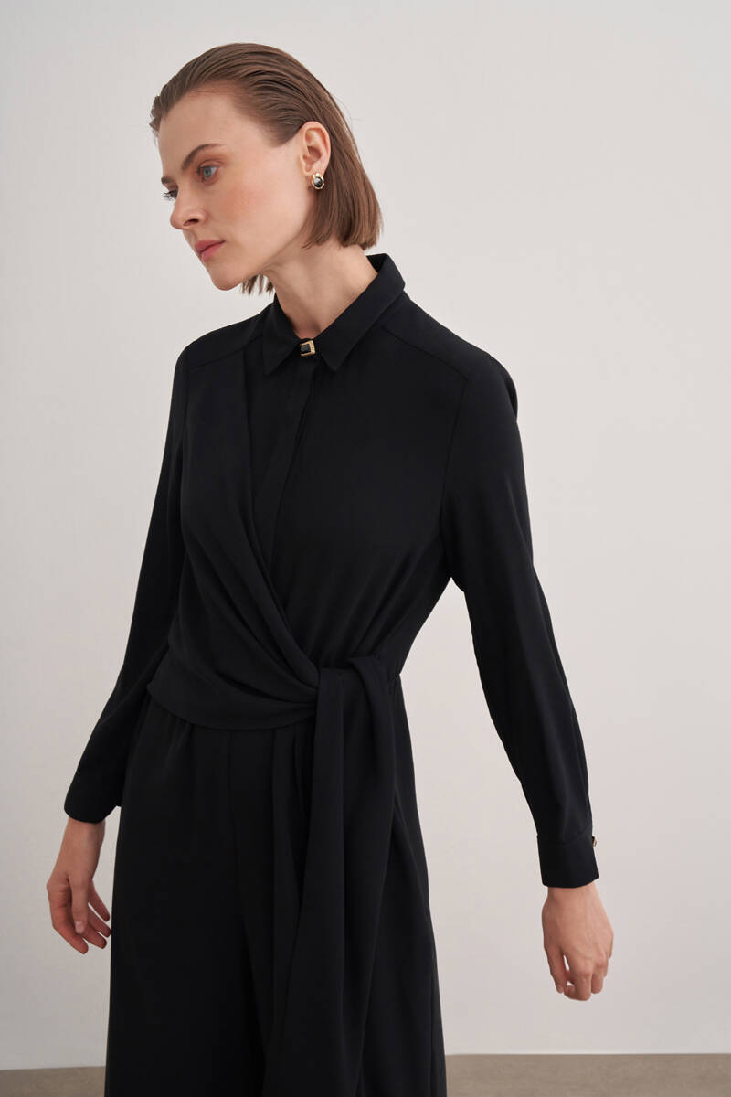 Siyah Belden Bağlama Detaylı Dokuma Tulum