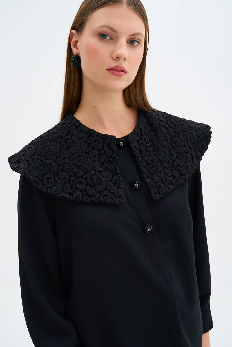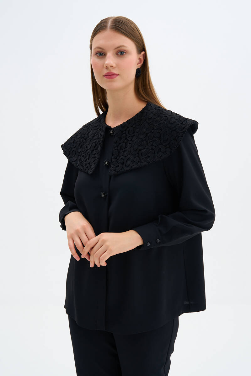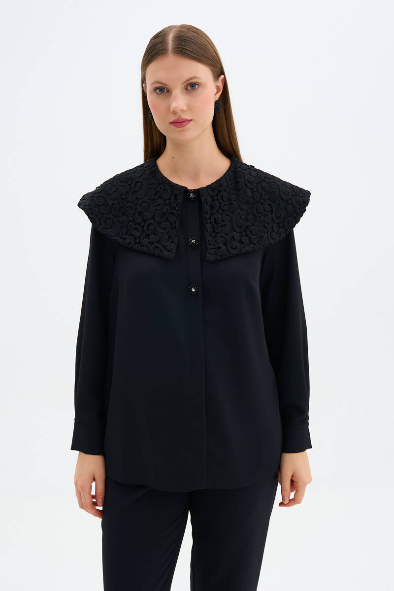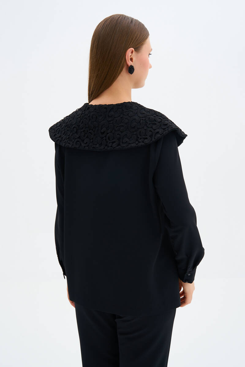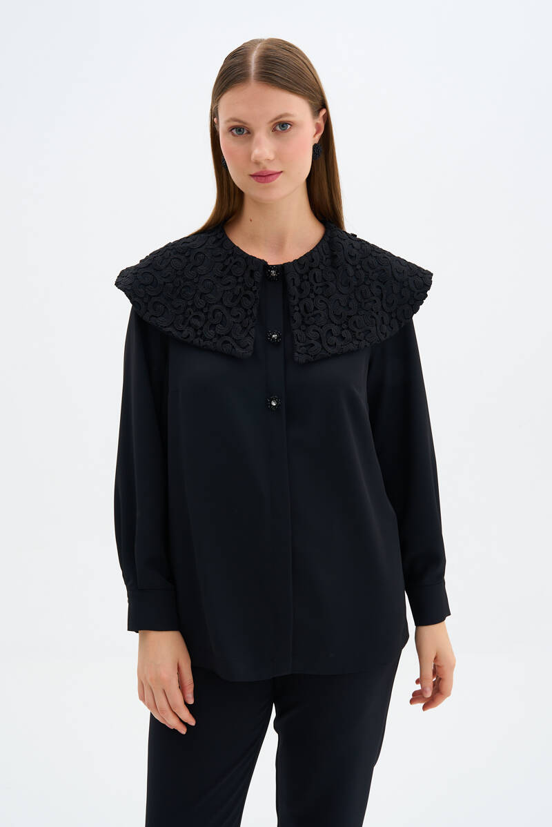 Antrasit Yaka İşlemeli Çizgili Bluz