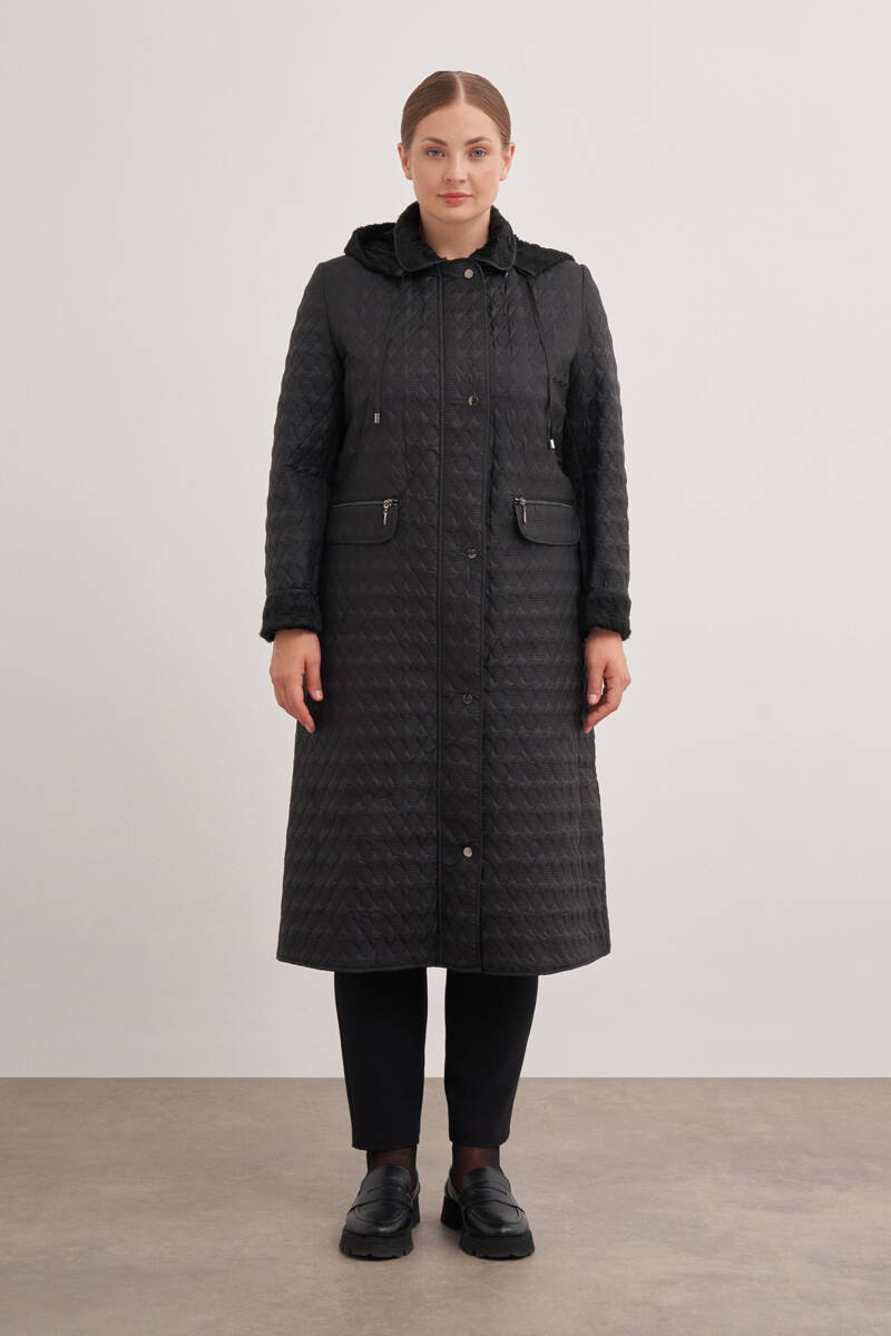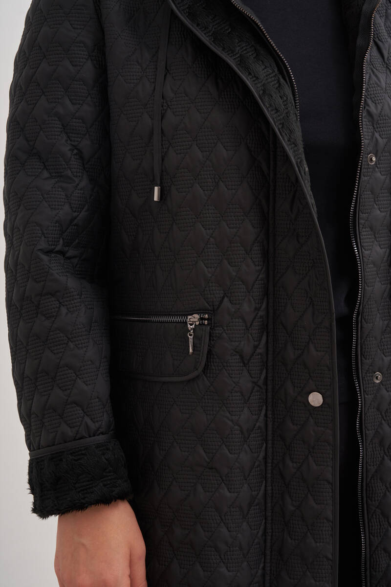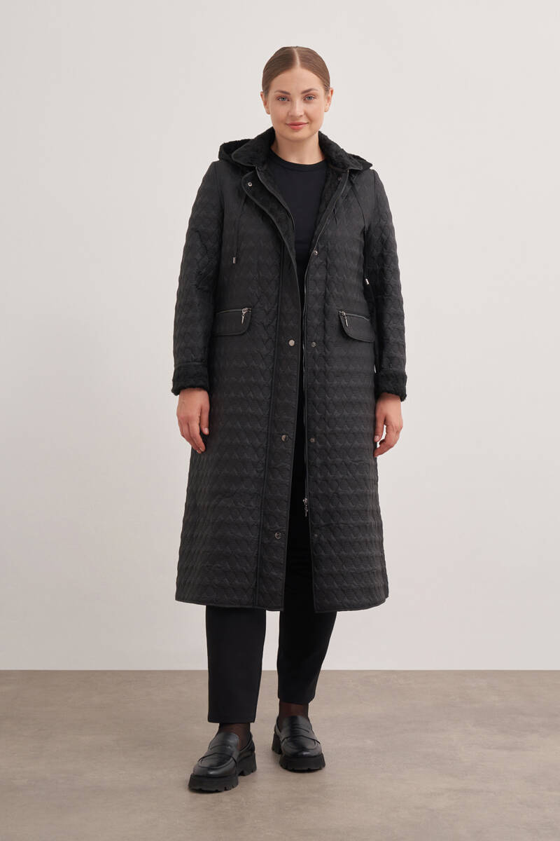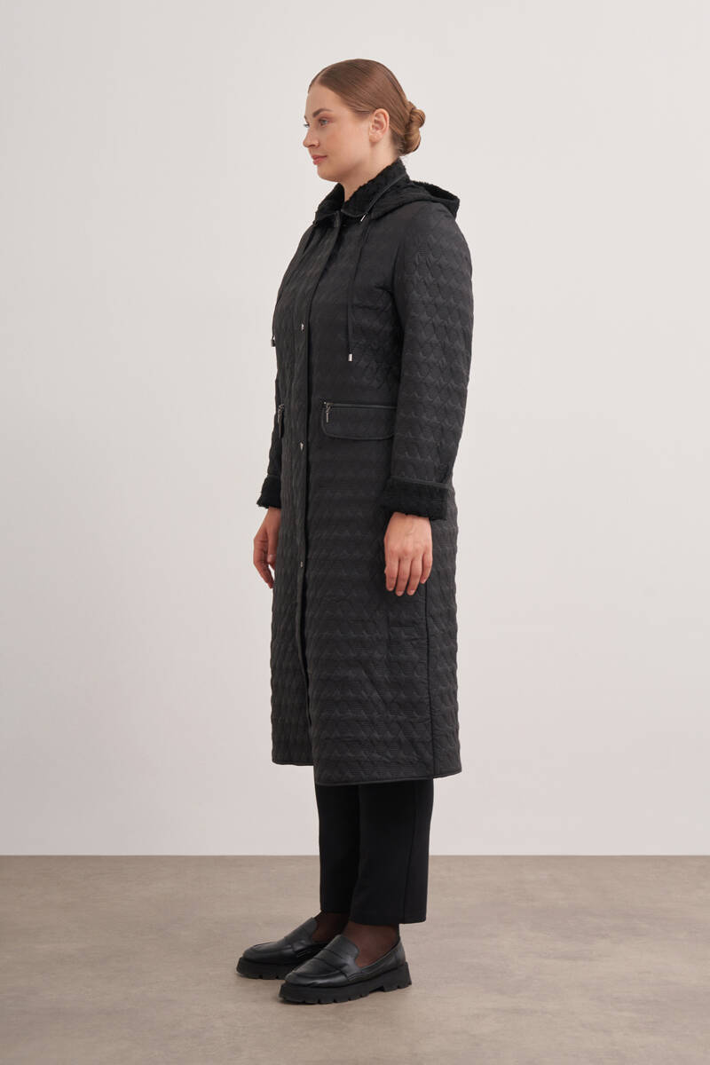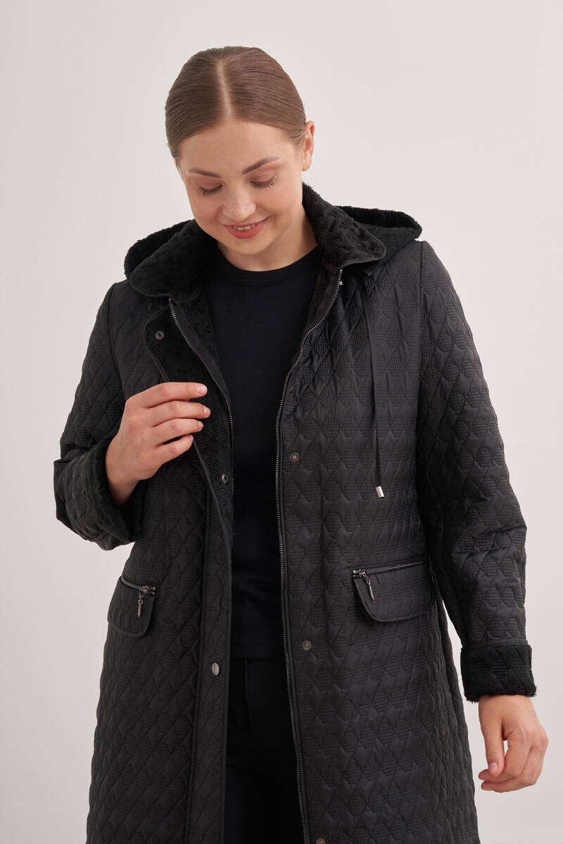 Siyah İçi Kürk Seyyar Kapüşonlu Kapitone Mont