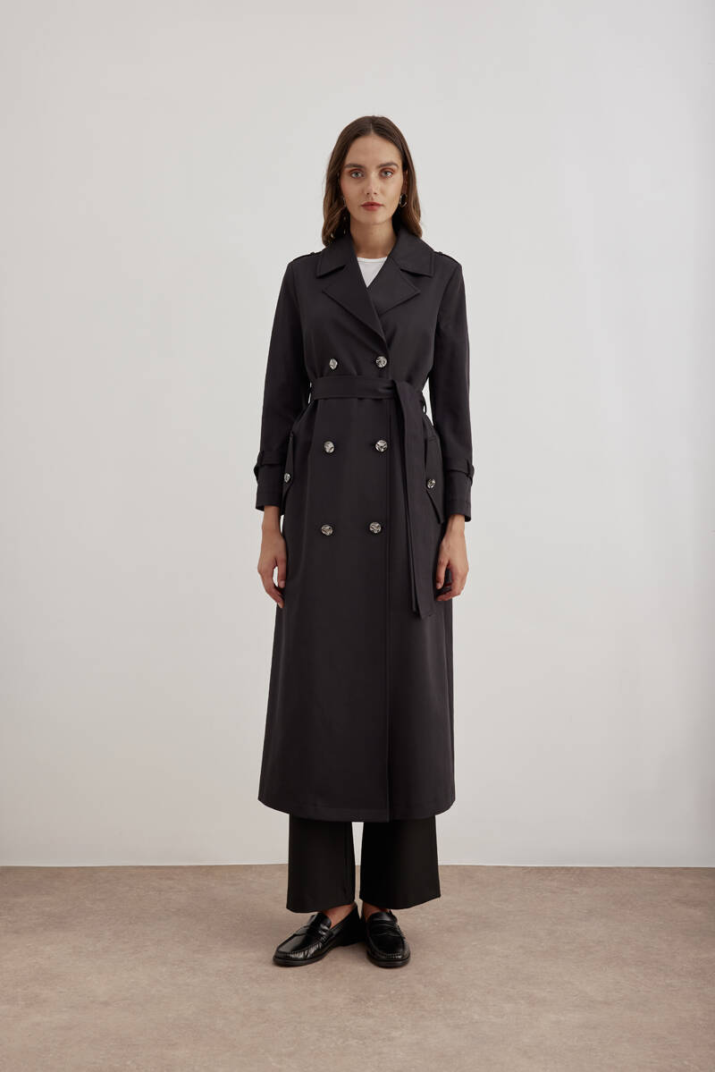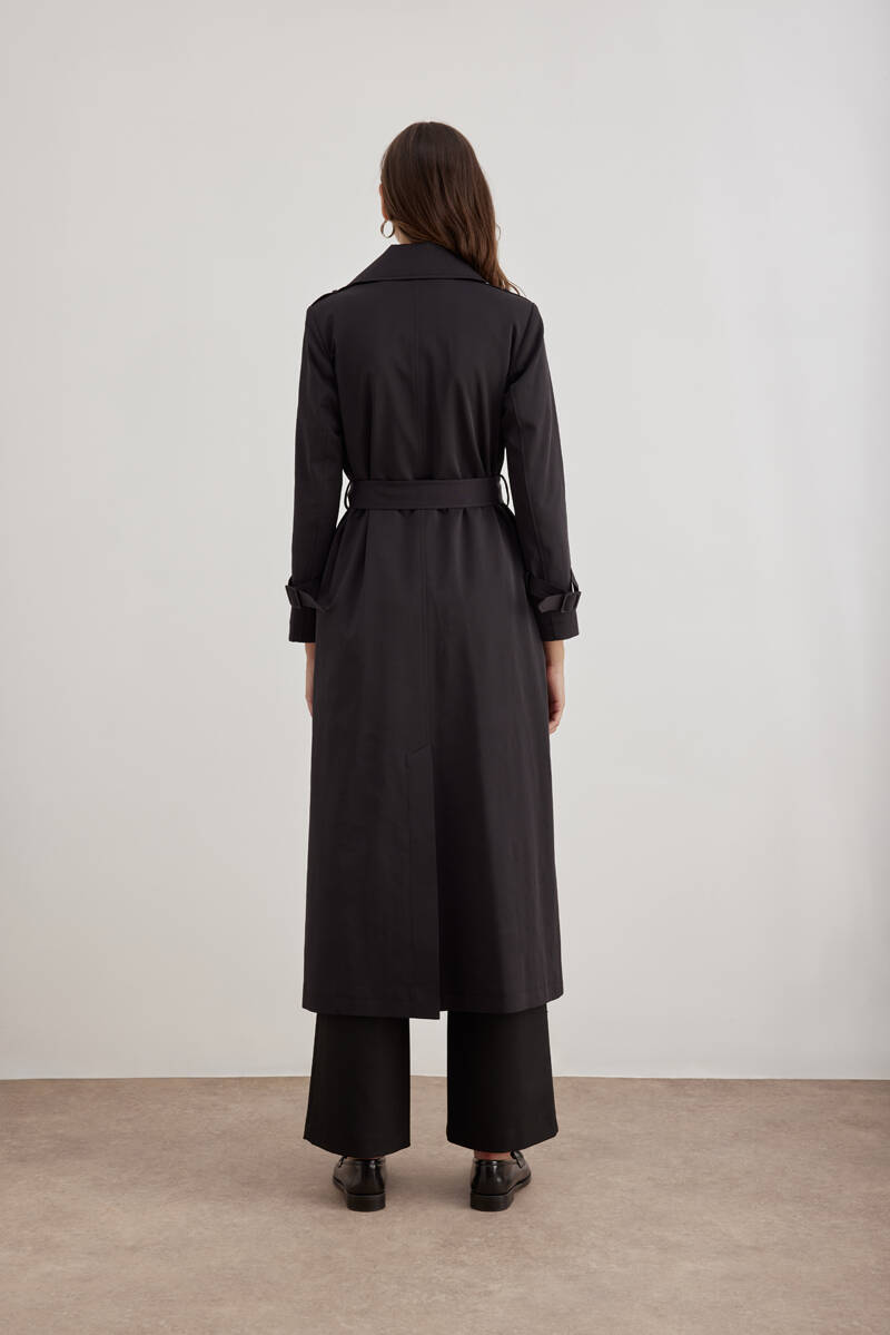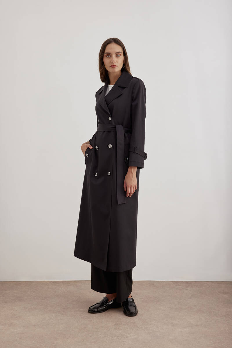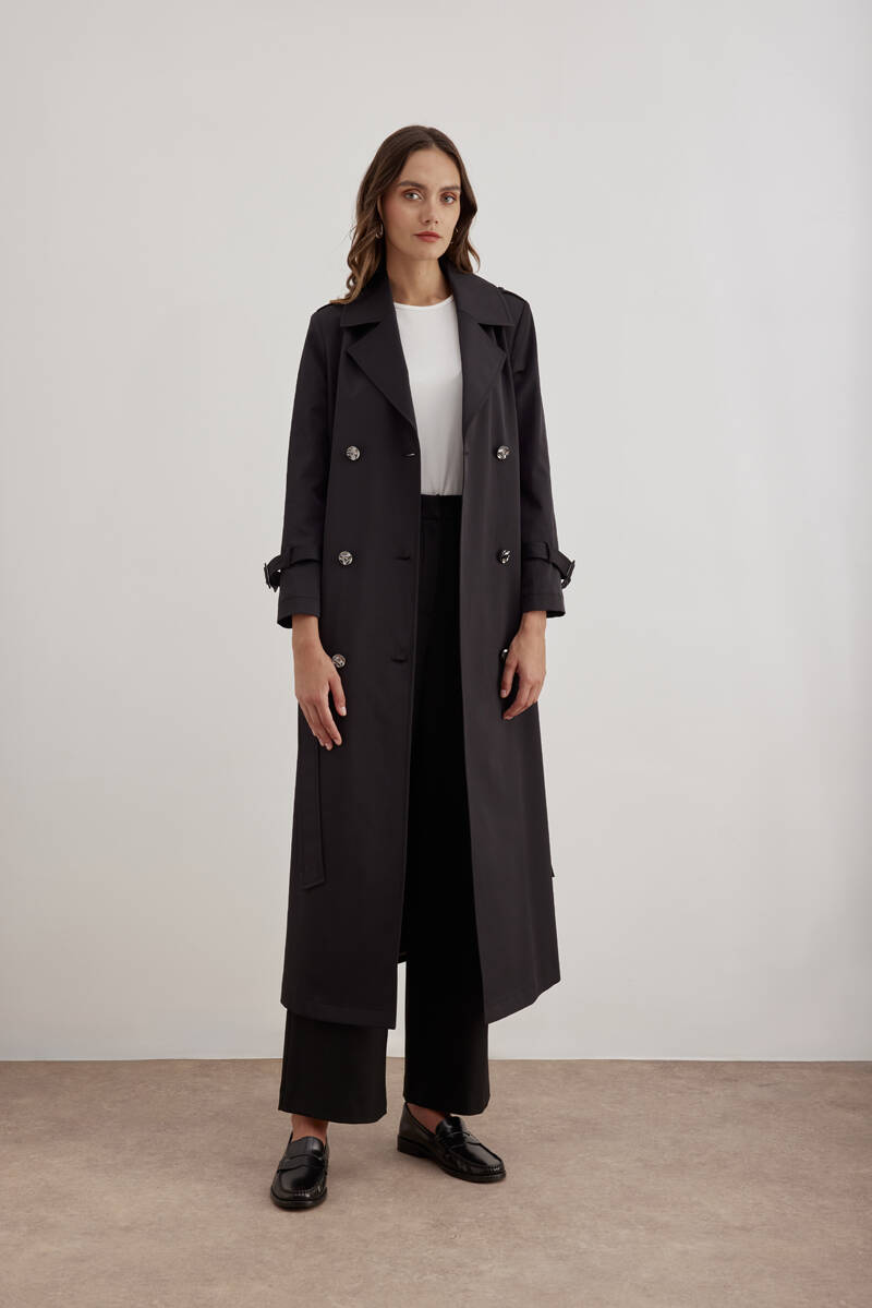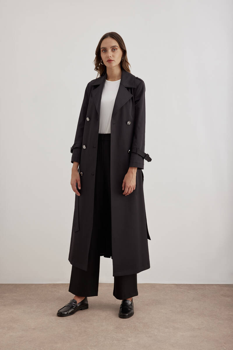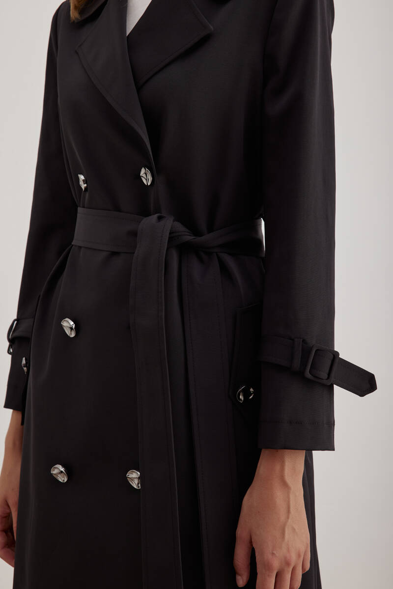 Siyah 18178111 Düğmeli Kruvaze Trençkot