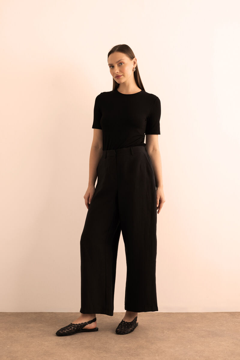 Siyah Beli Lastikli Keten Pantolon