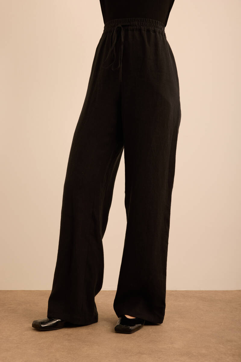 Siyah Beli ve Paçası Lastikli Balon Form Keten Pantolon