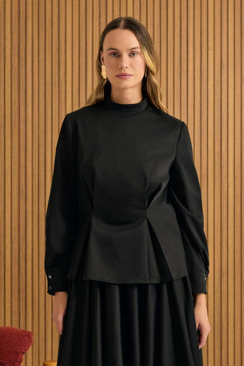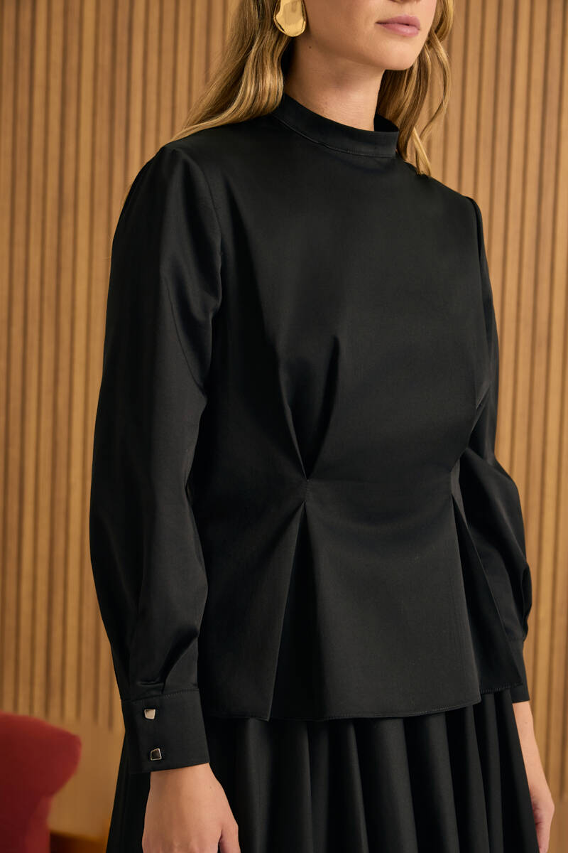 Saks Ön Göğüs Kısmı Pile ve Parça Detaylı Bluz