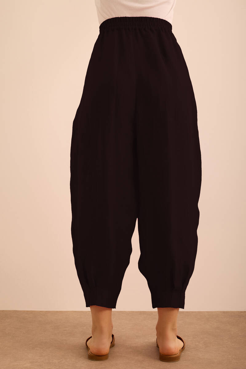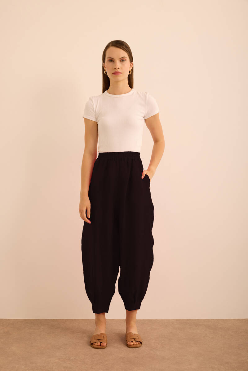 Siyah Beli ve Paçası Lastikli Balon Form Keten Pantolon