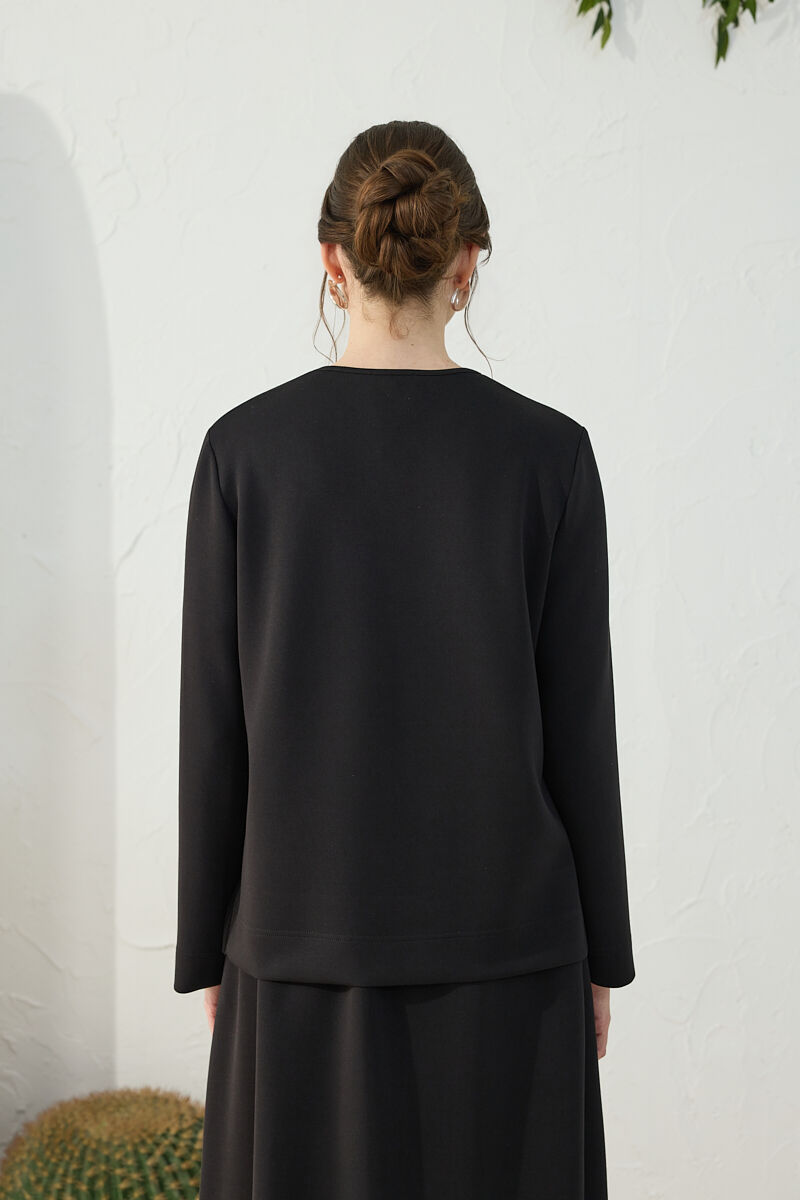 Lacivert Yandan Pili ve İşleme Detaylı Dokuma Bluz