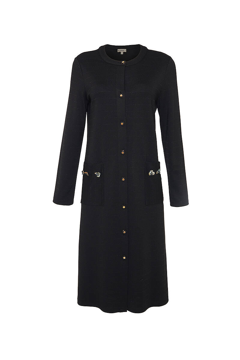 Siyah Cepleri İşleme Detaylı Örme Uzun Hırka