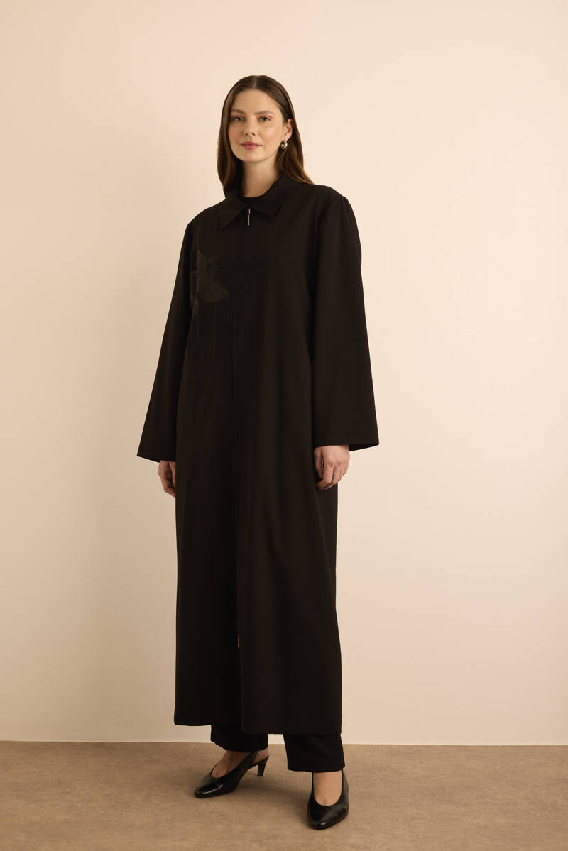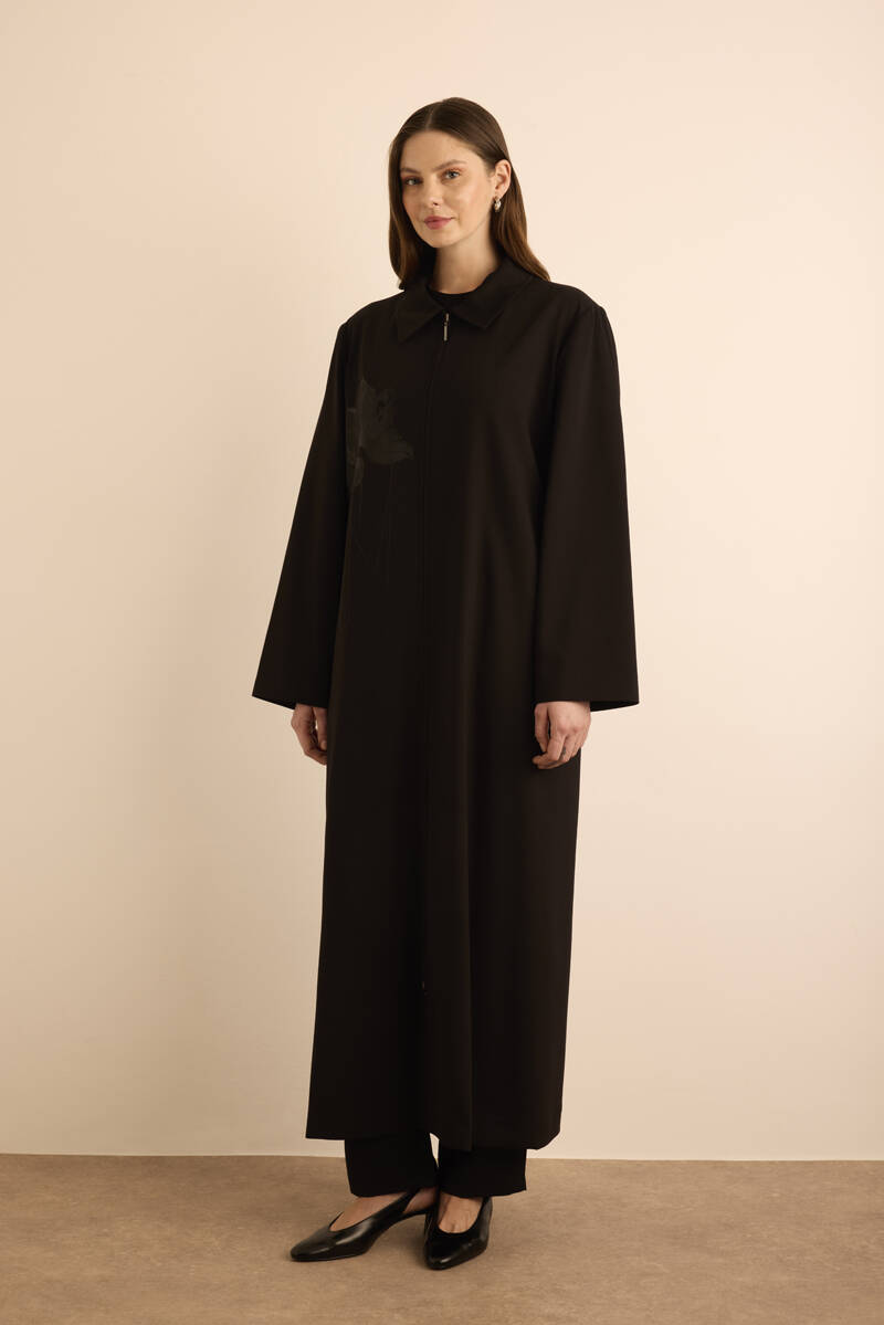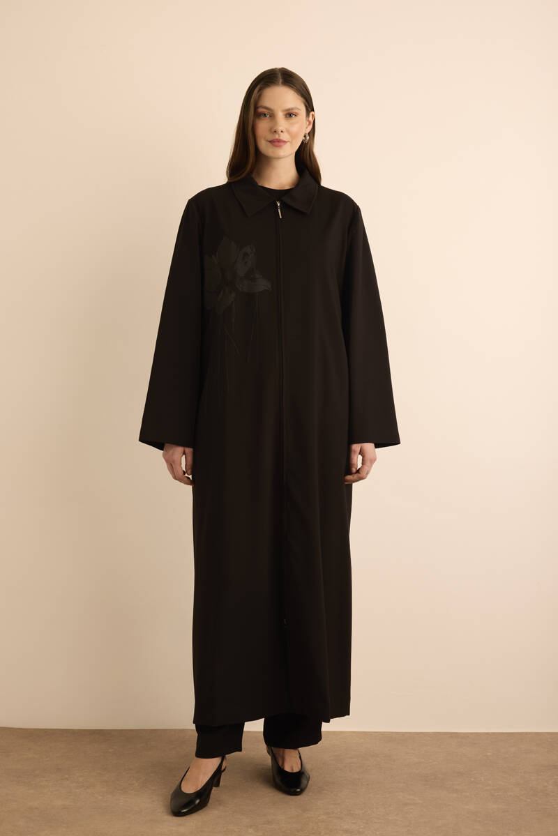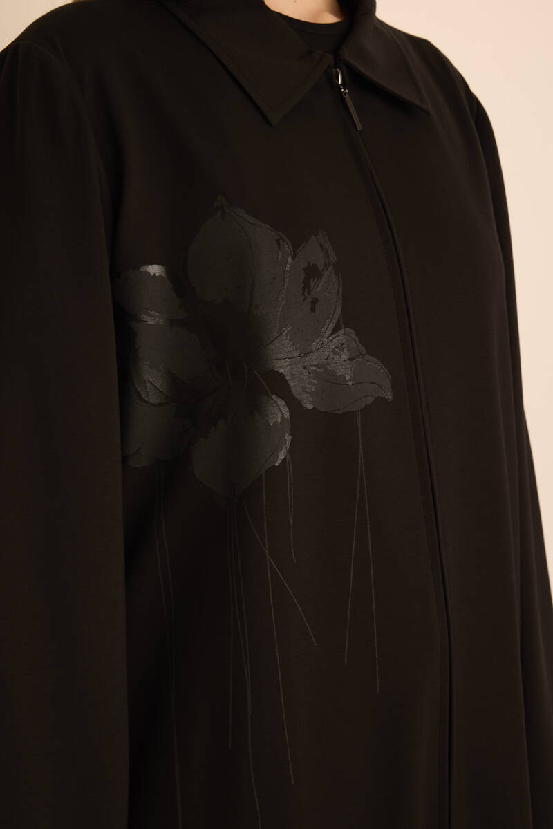 Siyah Çicek Baskı Detaylı Fermuarlı Ferace