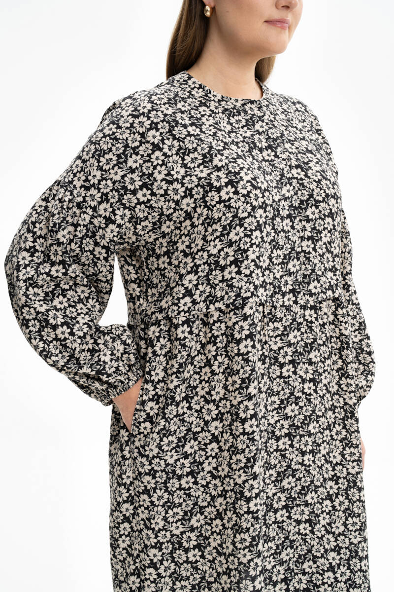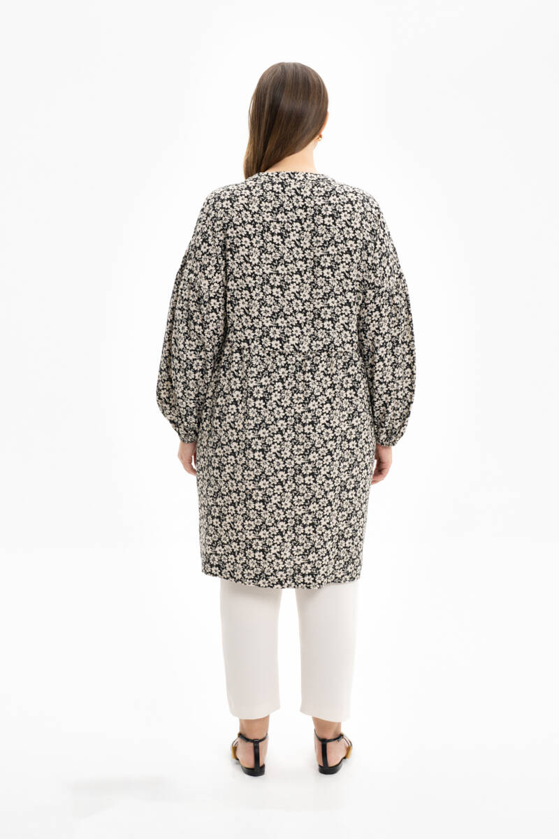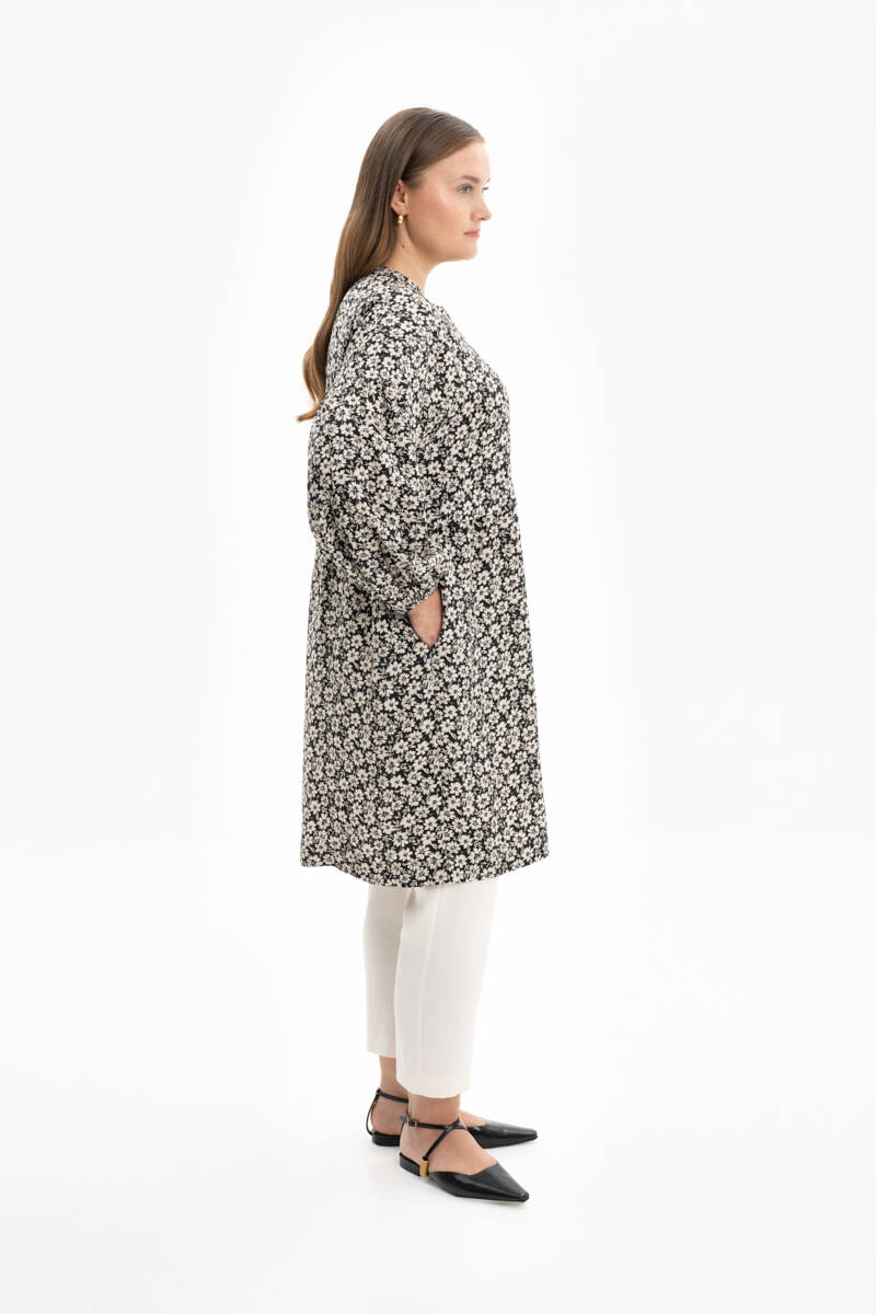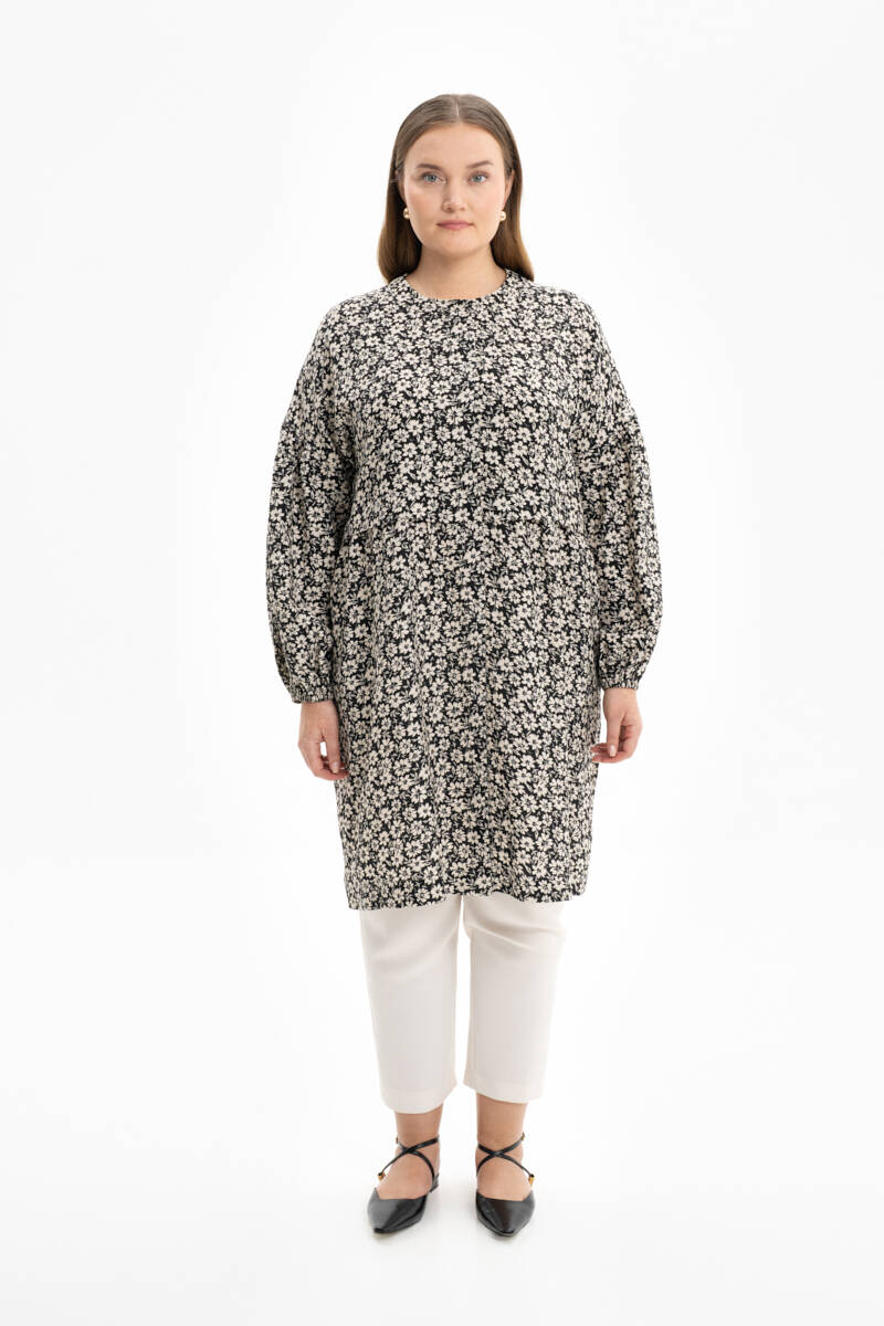 Siyah Çiçek Desenli Rahat Kesim Tunik