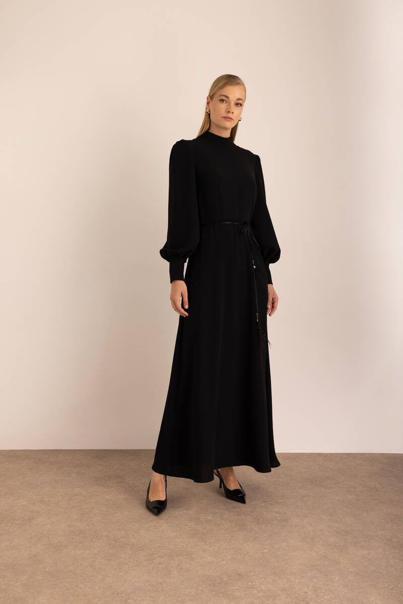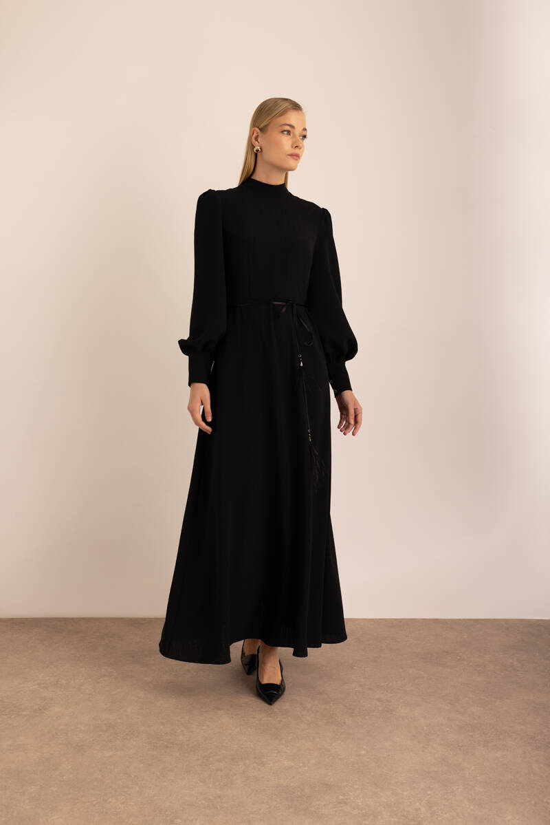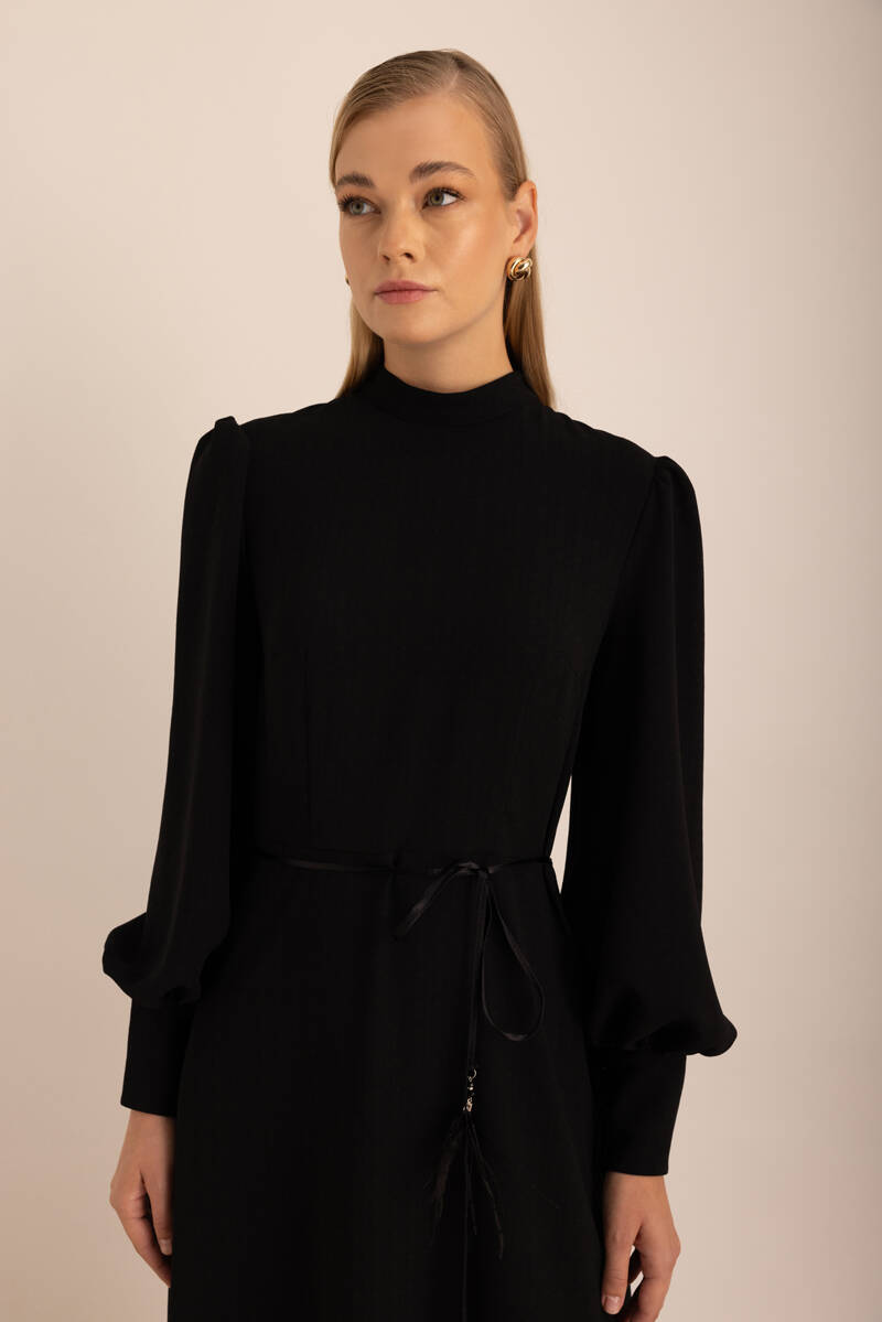 Siyah İşlemeli Bağcık Detaylı Dokuma Elbise