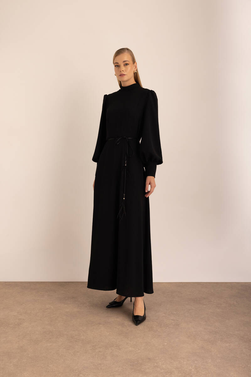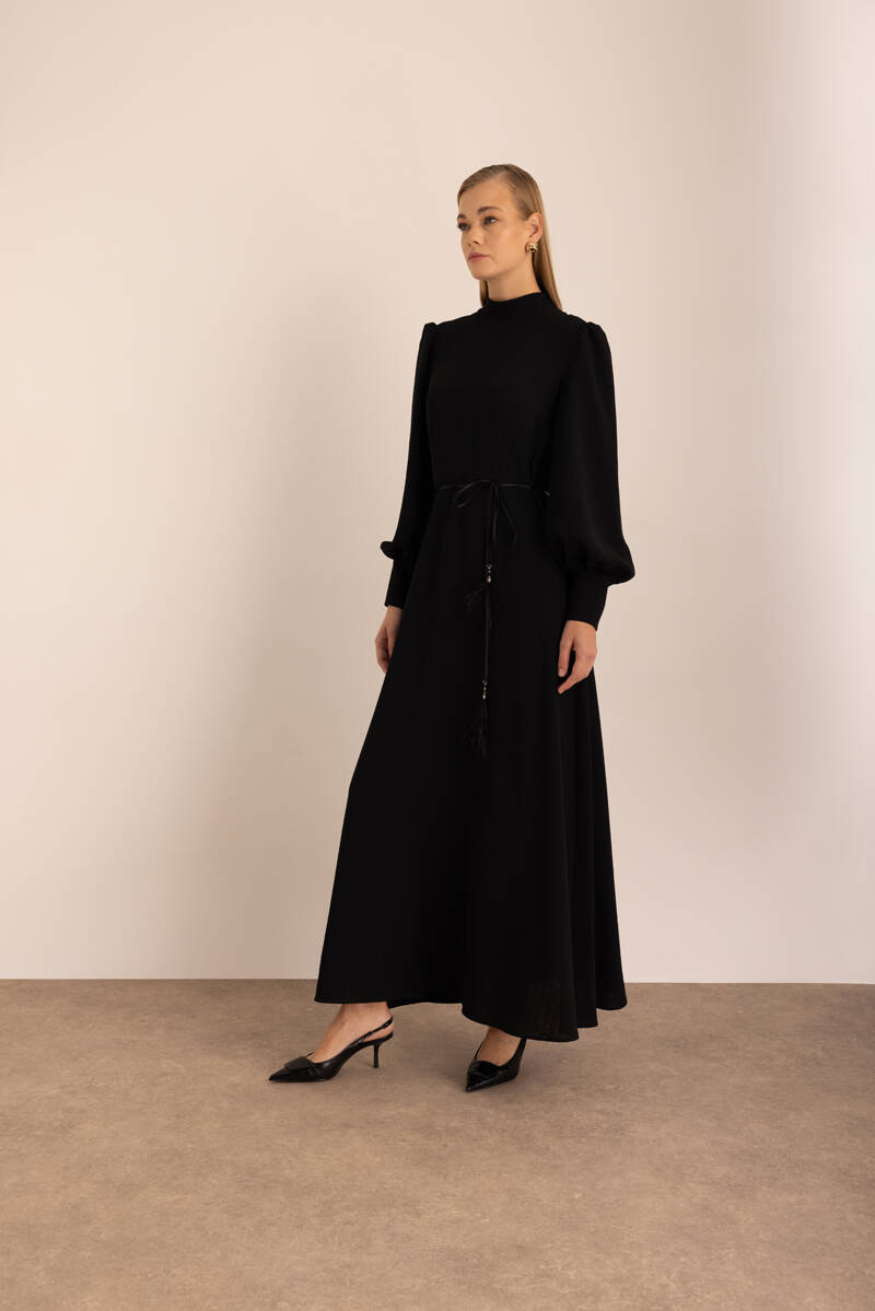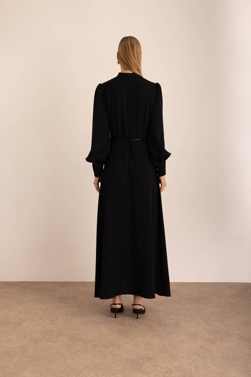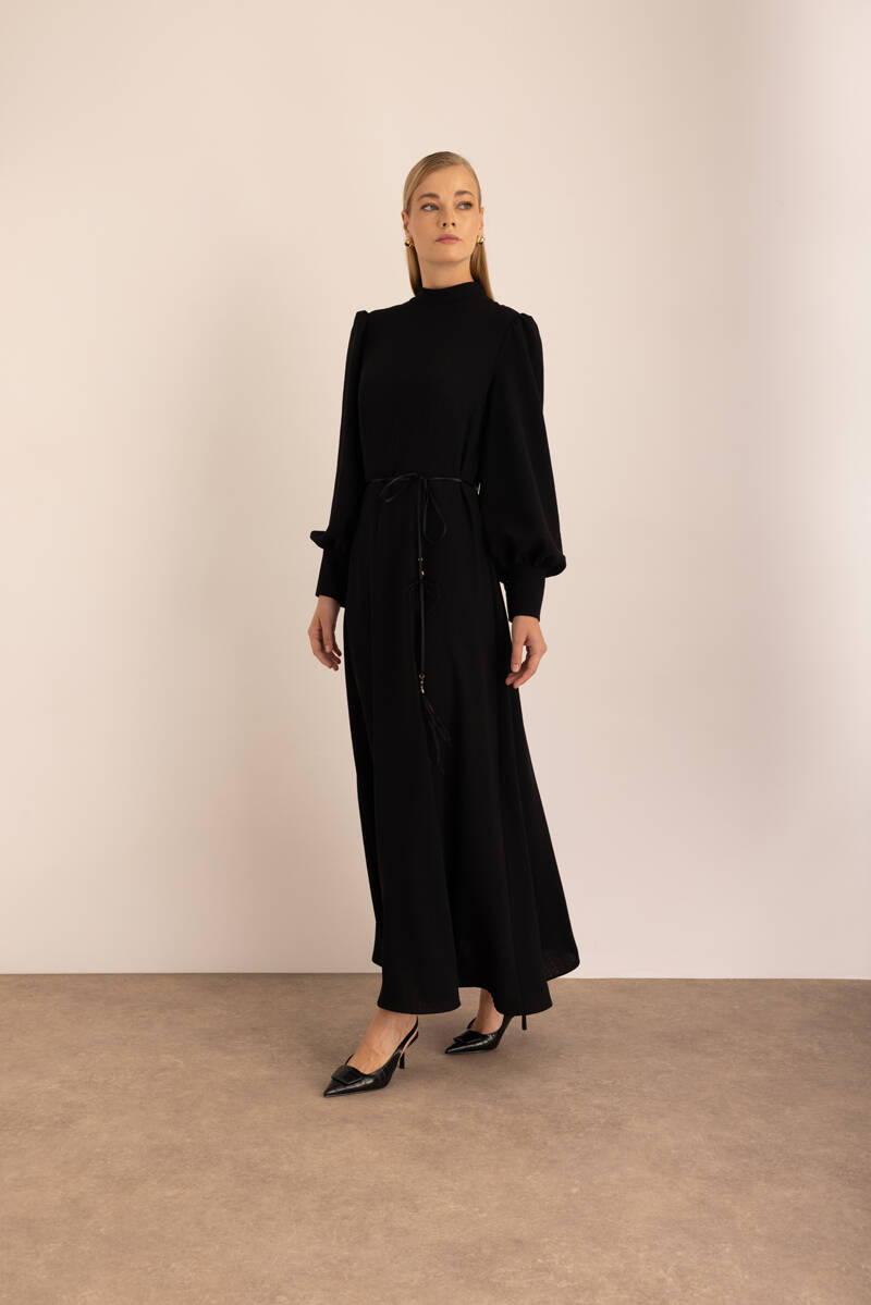 Siyah İşlemeli Bağcık Detaylı Dokuma Elbise