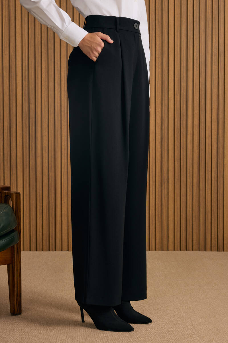Siyah Belden Metal Toka Bağlama Detaylı Dokuma Pantolon