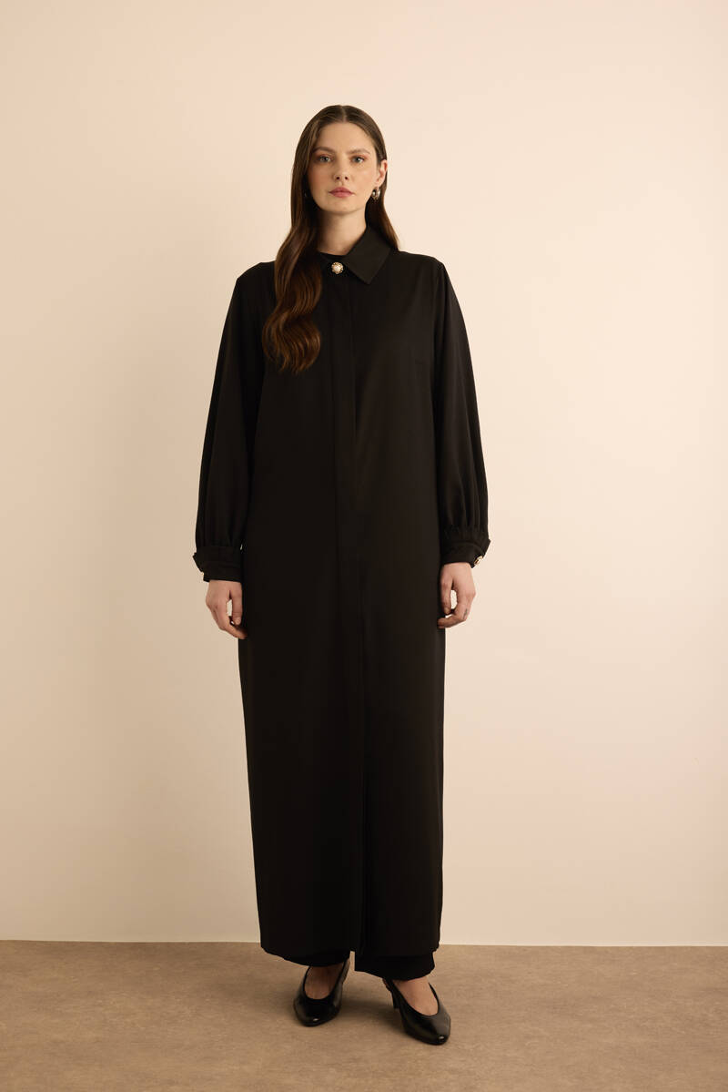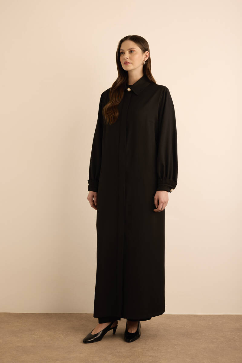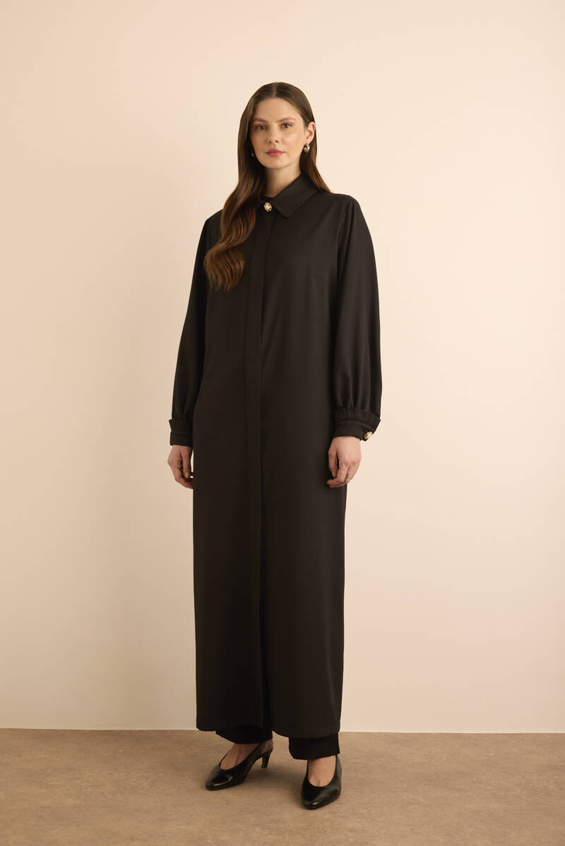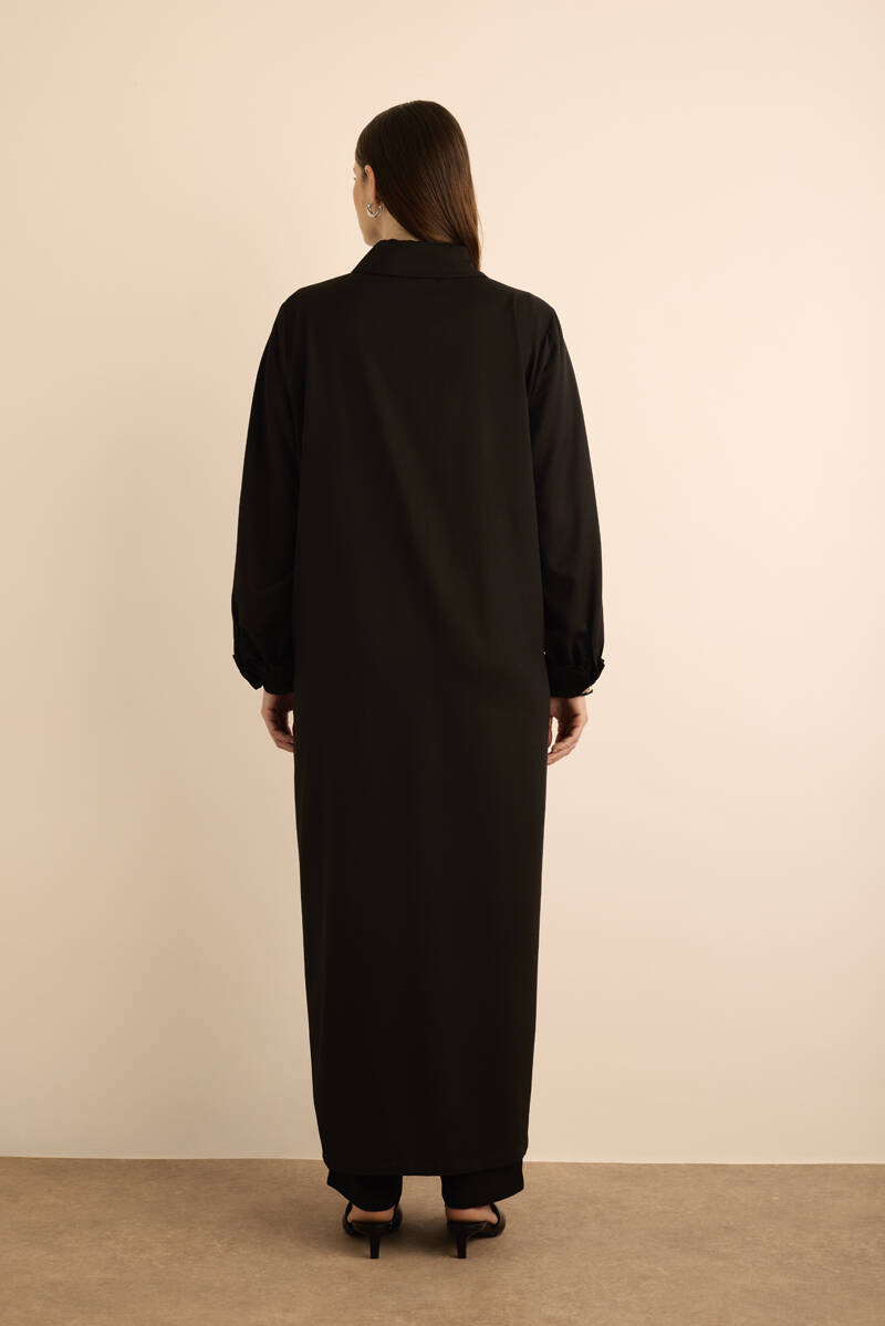 Siyah Özel Dokulu Kumaş Pardösü