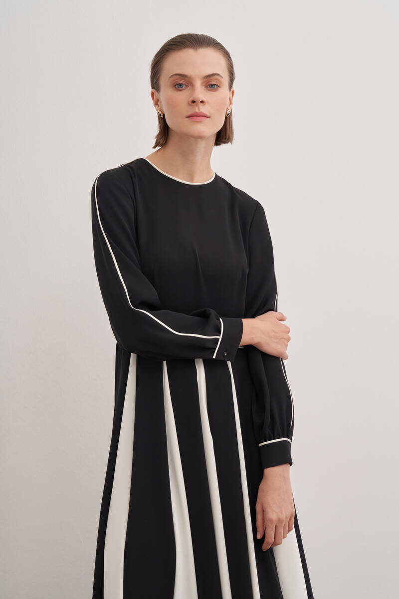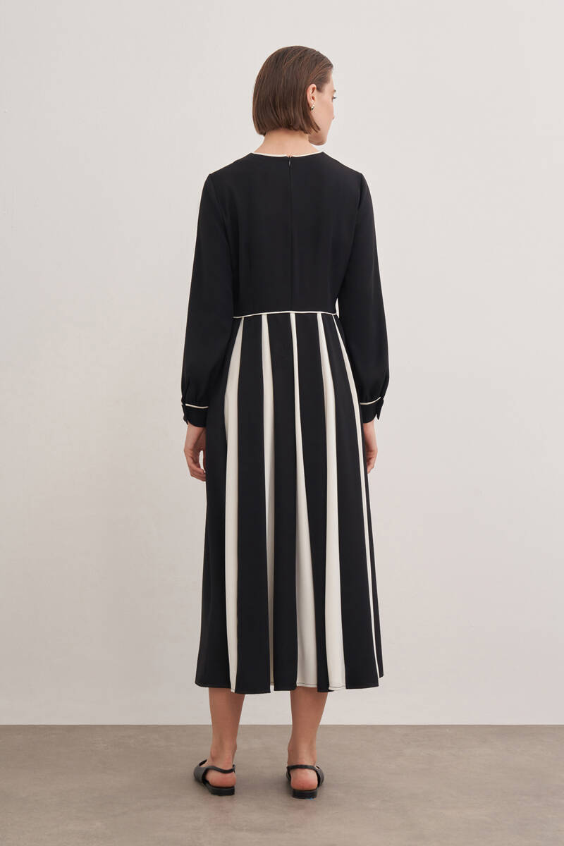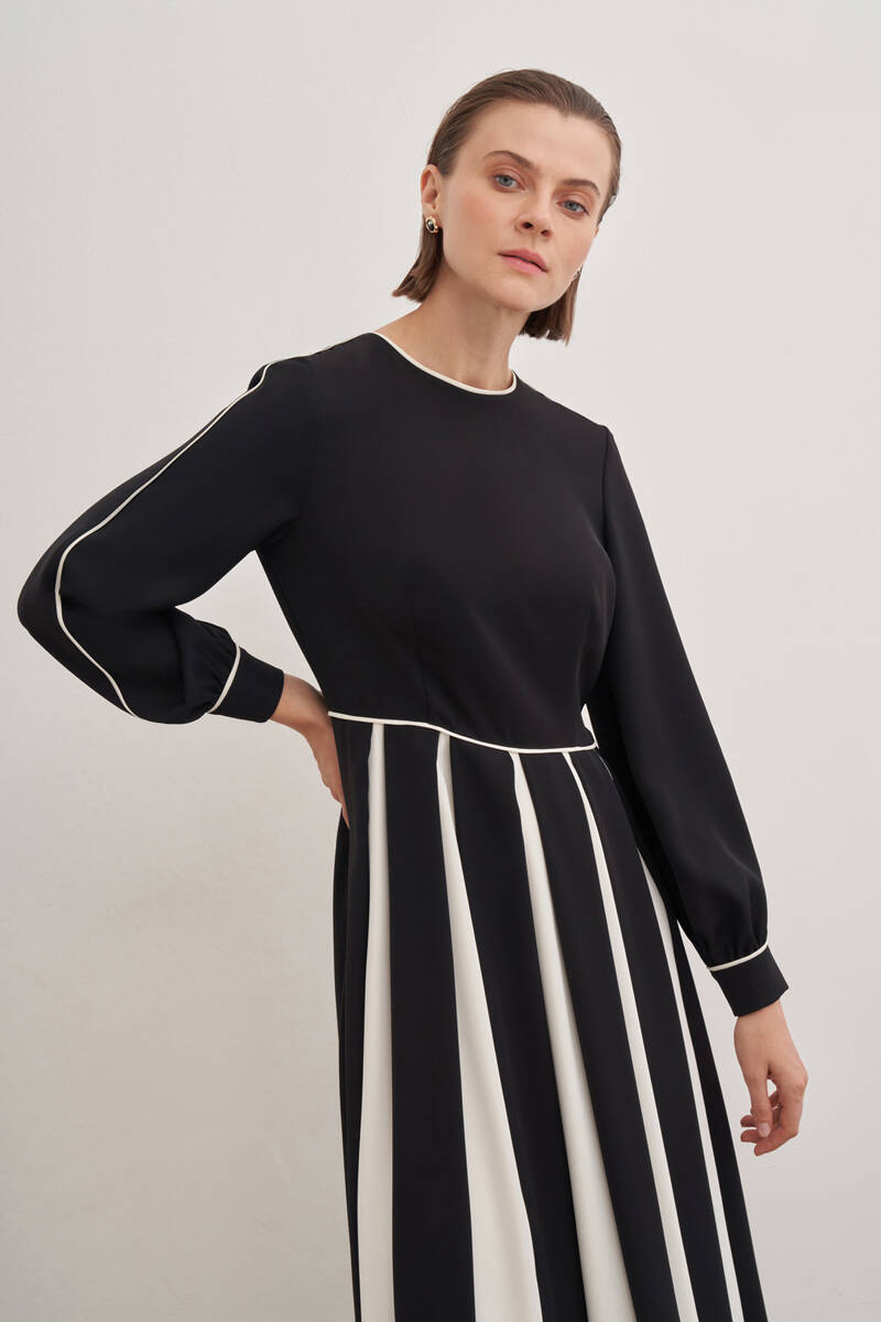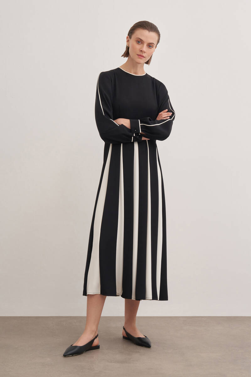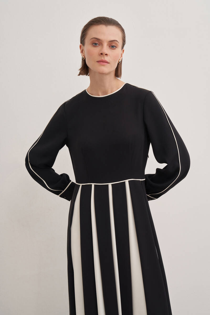 Siyah Desenli Pile Detaylı Elbise