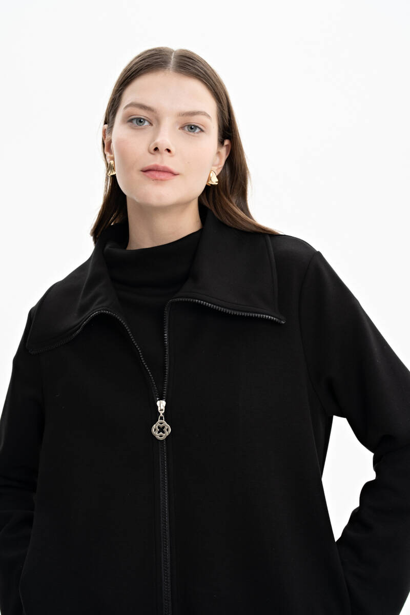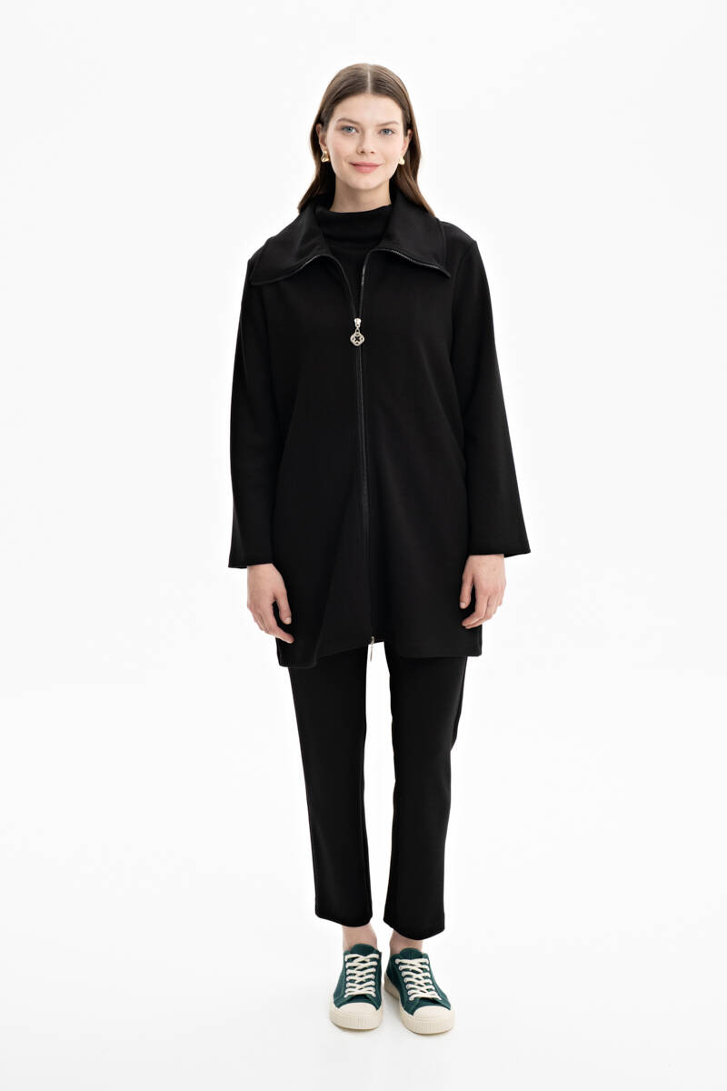 Siyah Cepleri İşleme Detaylı Örme Uzun Hırka
