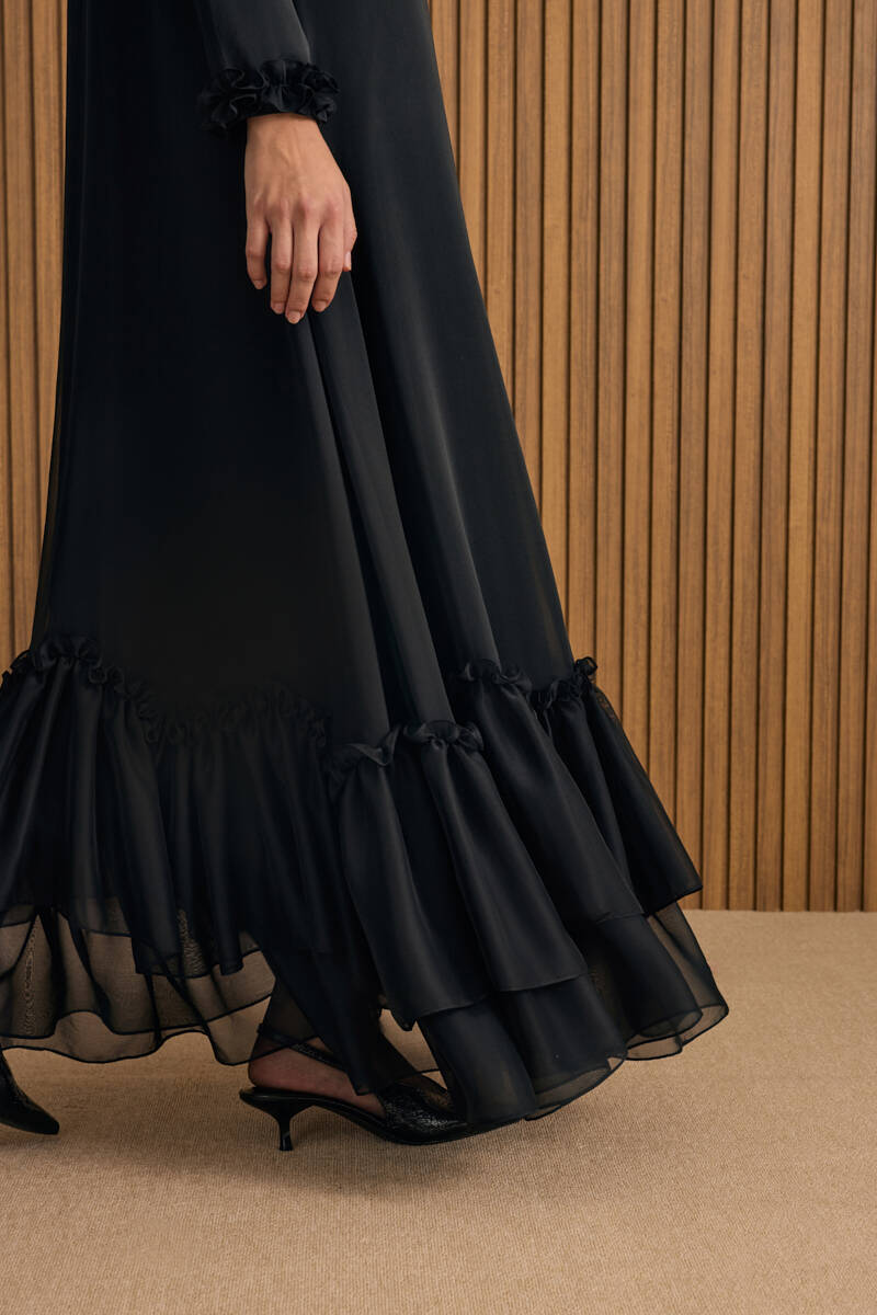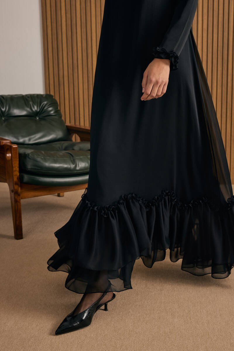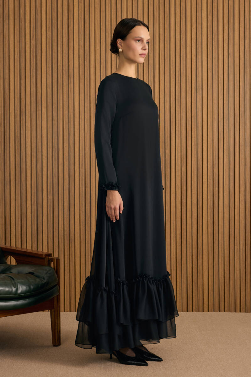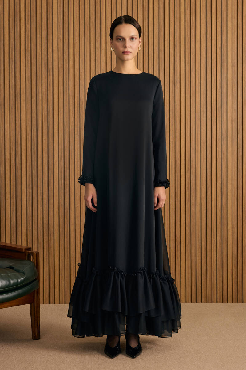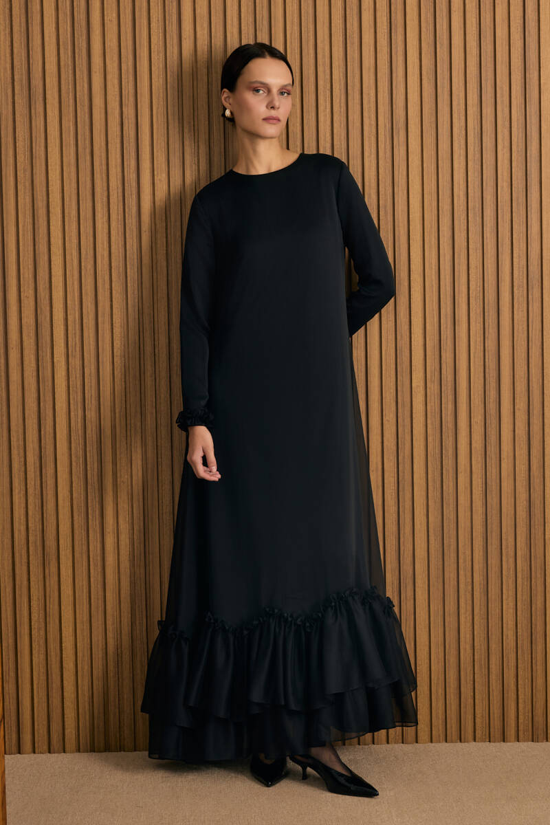 Siyah Etek Ucu Kontrast Nakış Detaylı Elbise