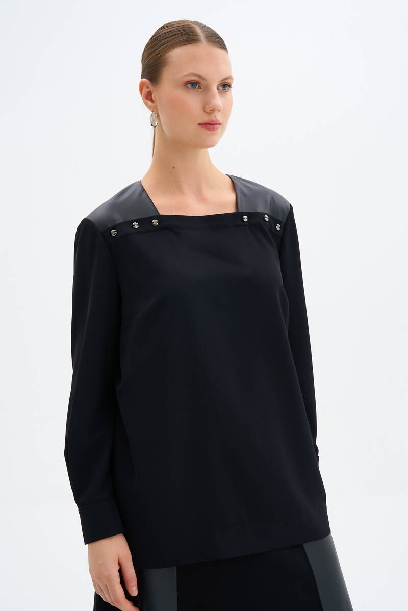 Antrasit Yaka İşlemeli Çizgili Bluz