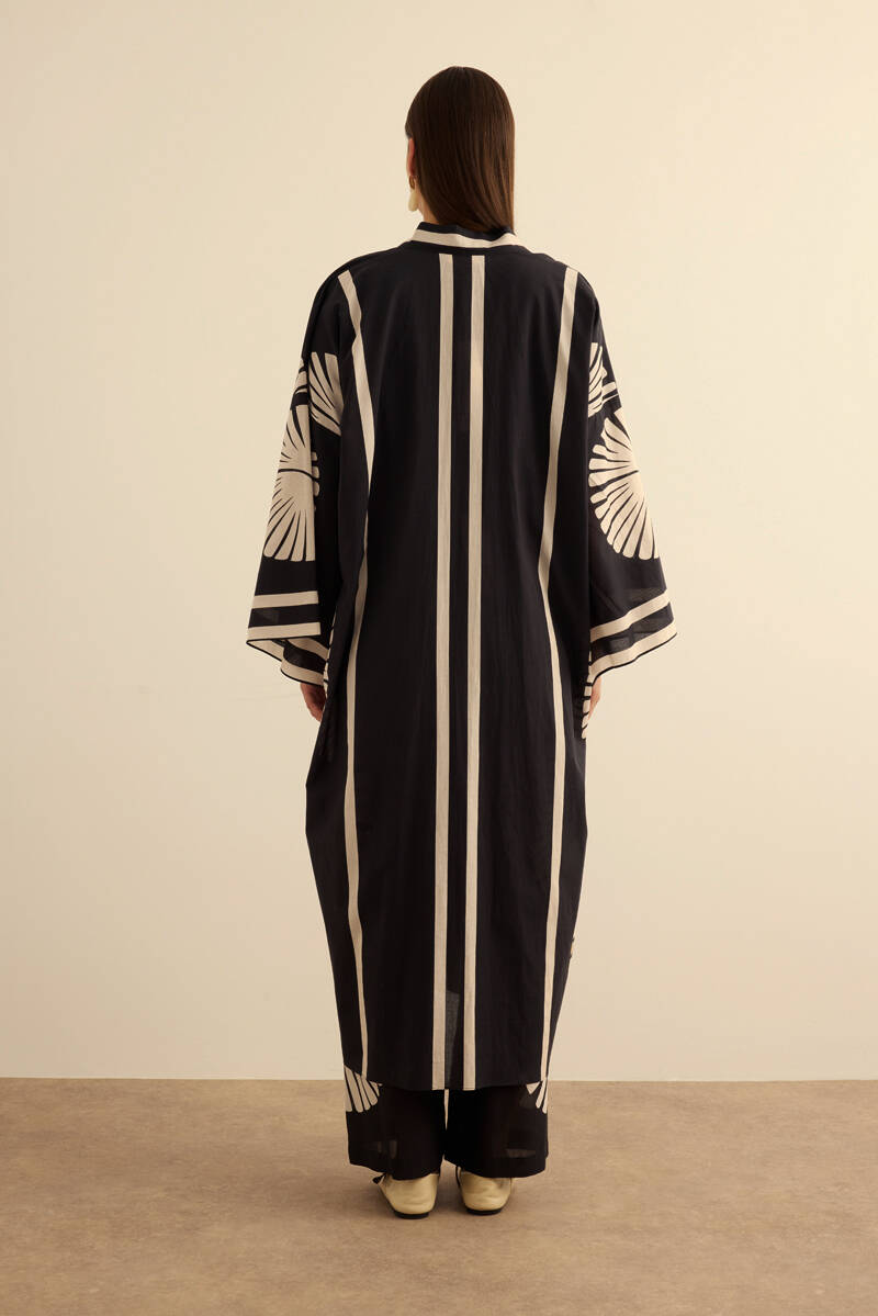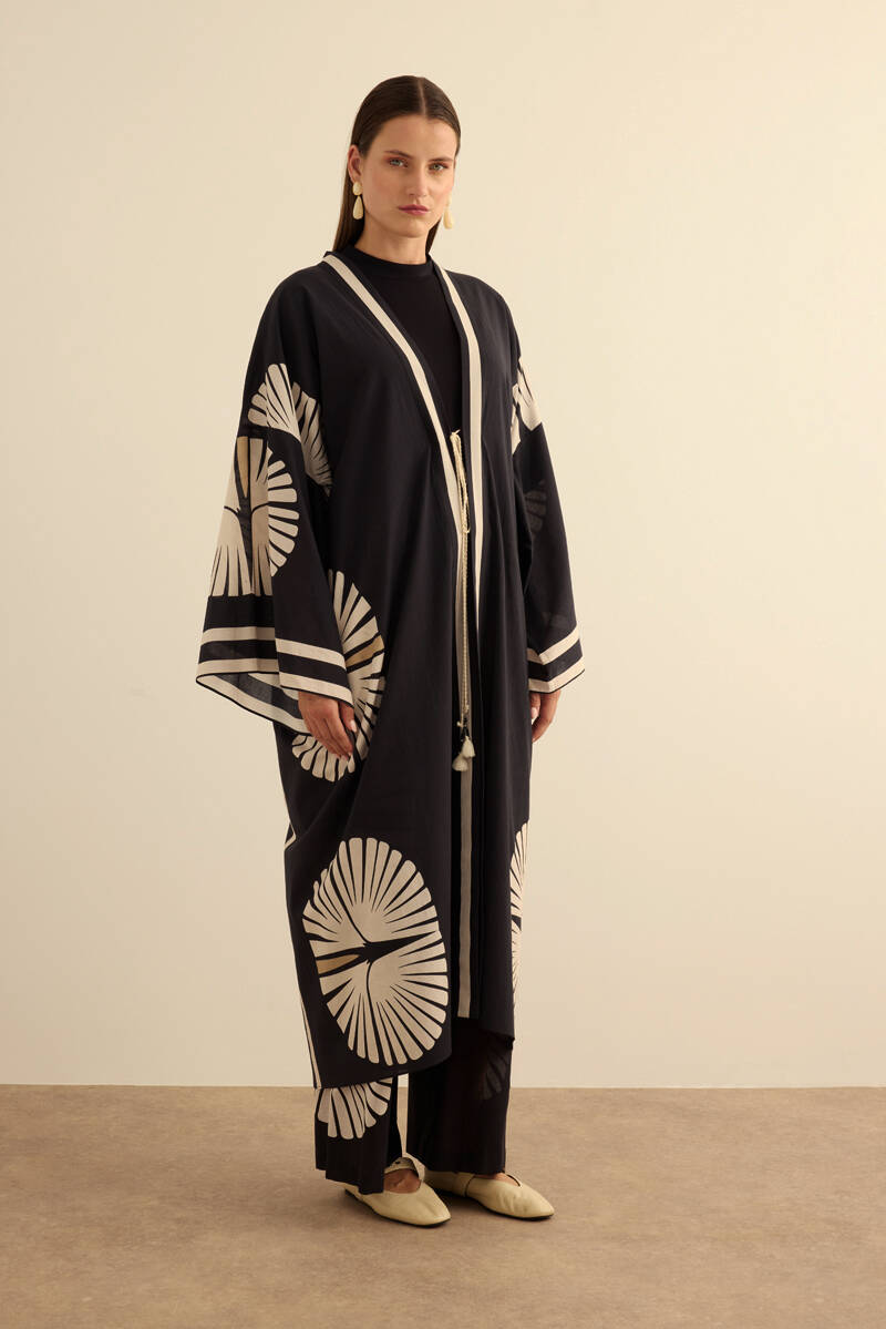 Ekru Yaprak Desenli Keten Yandan Bağlamalı Kimono