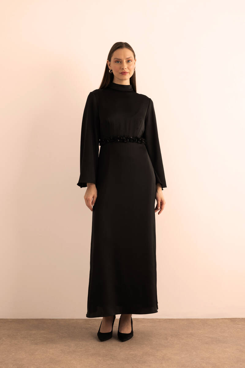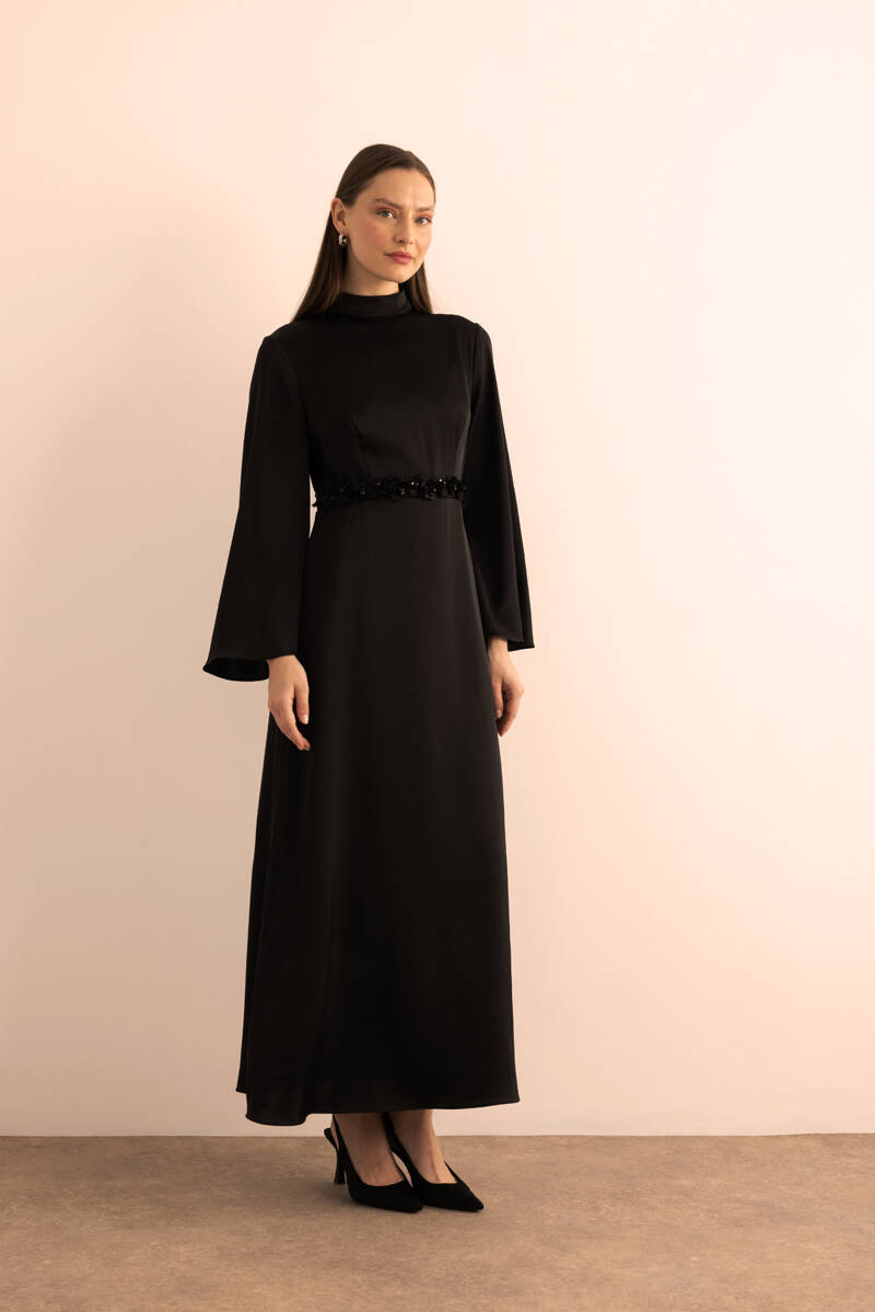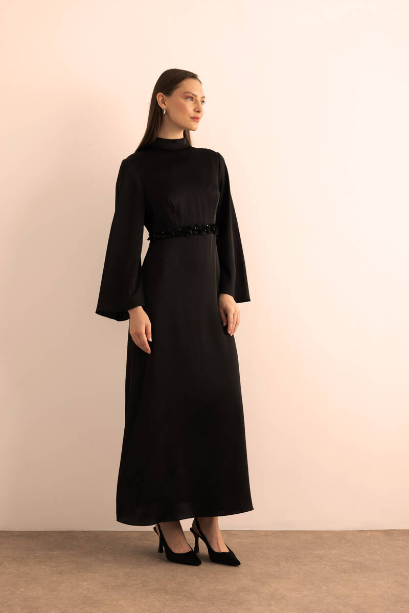 Siyah Kemeri İşlemeli Kolları Bol Abiye Elbise