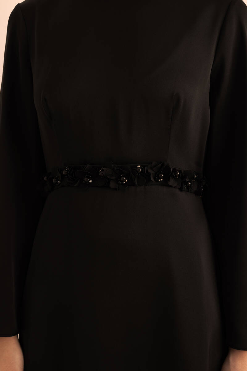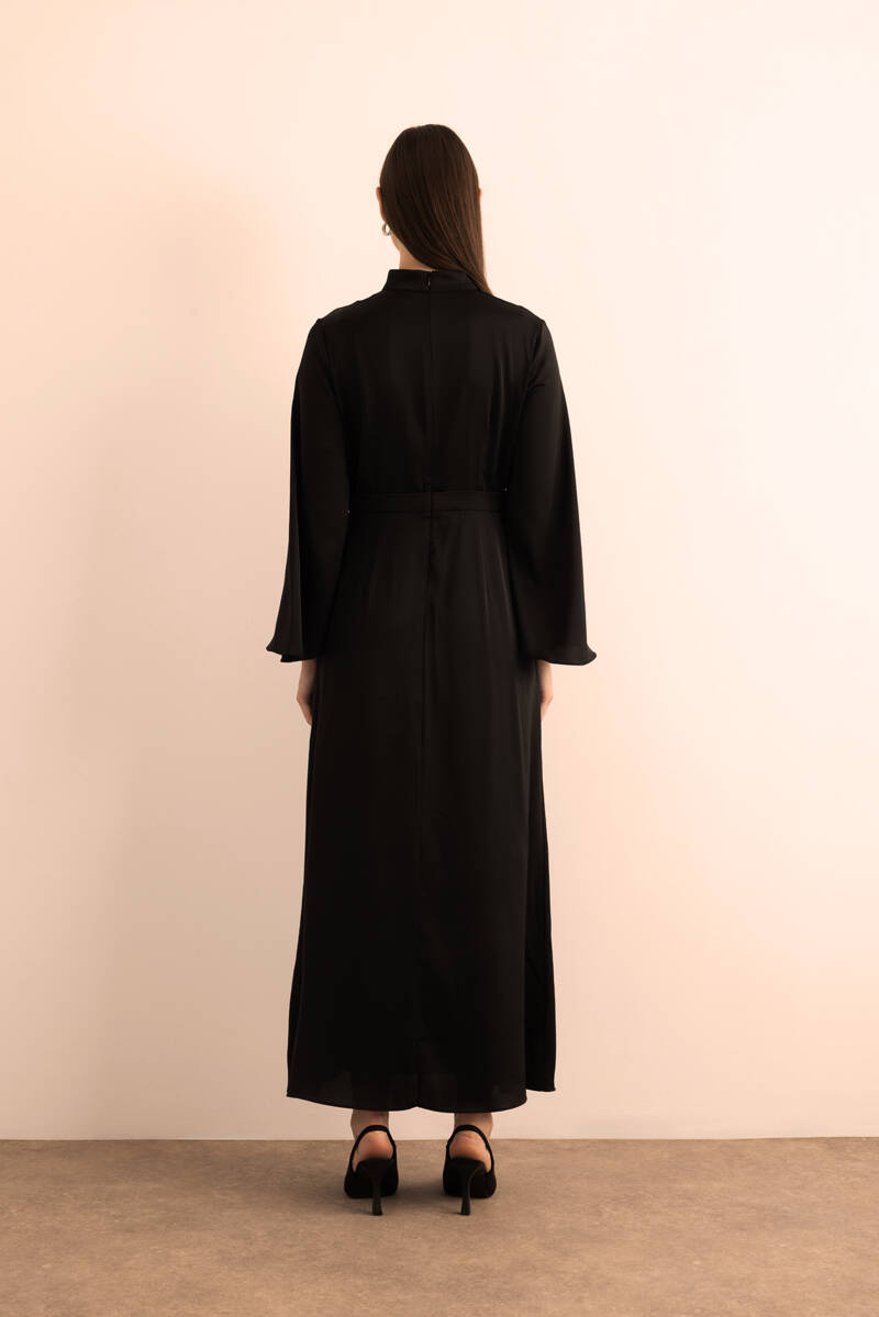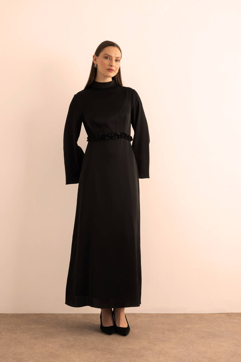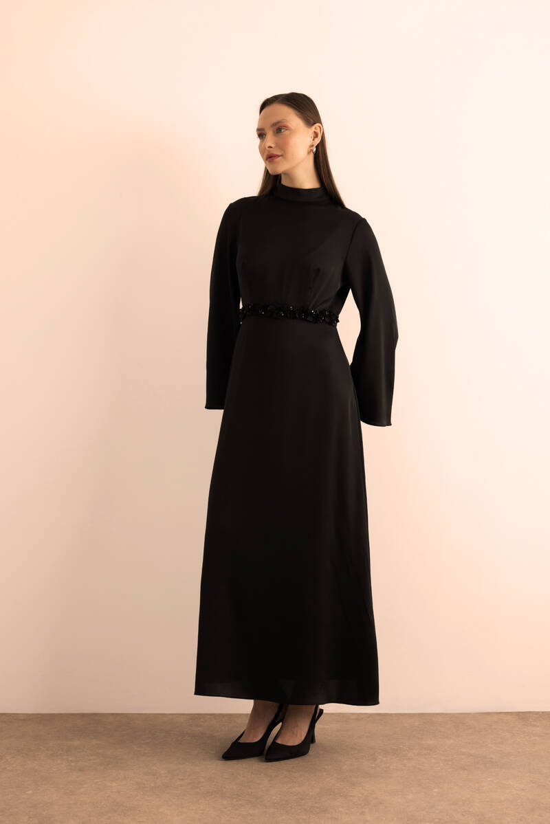 Siyah Kemeri İşlemeli Kolları Bol Abiye Elbise