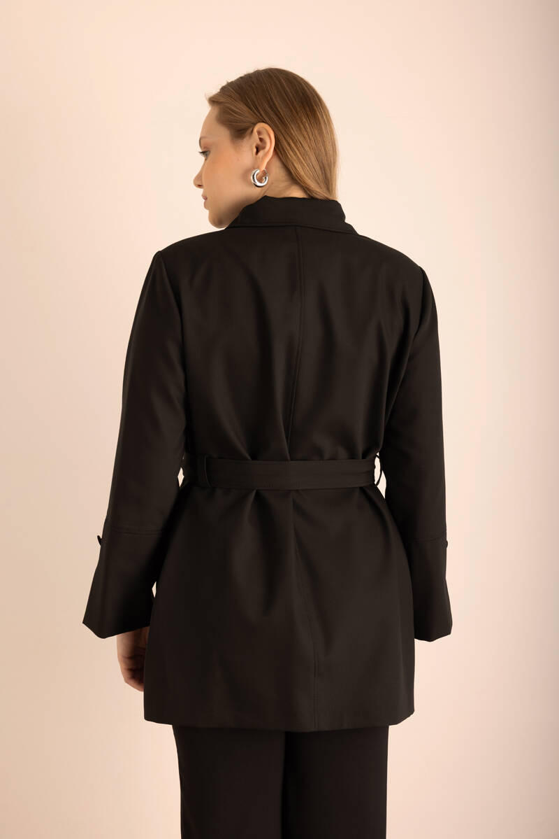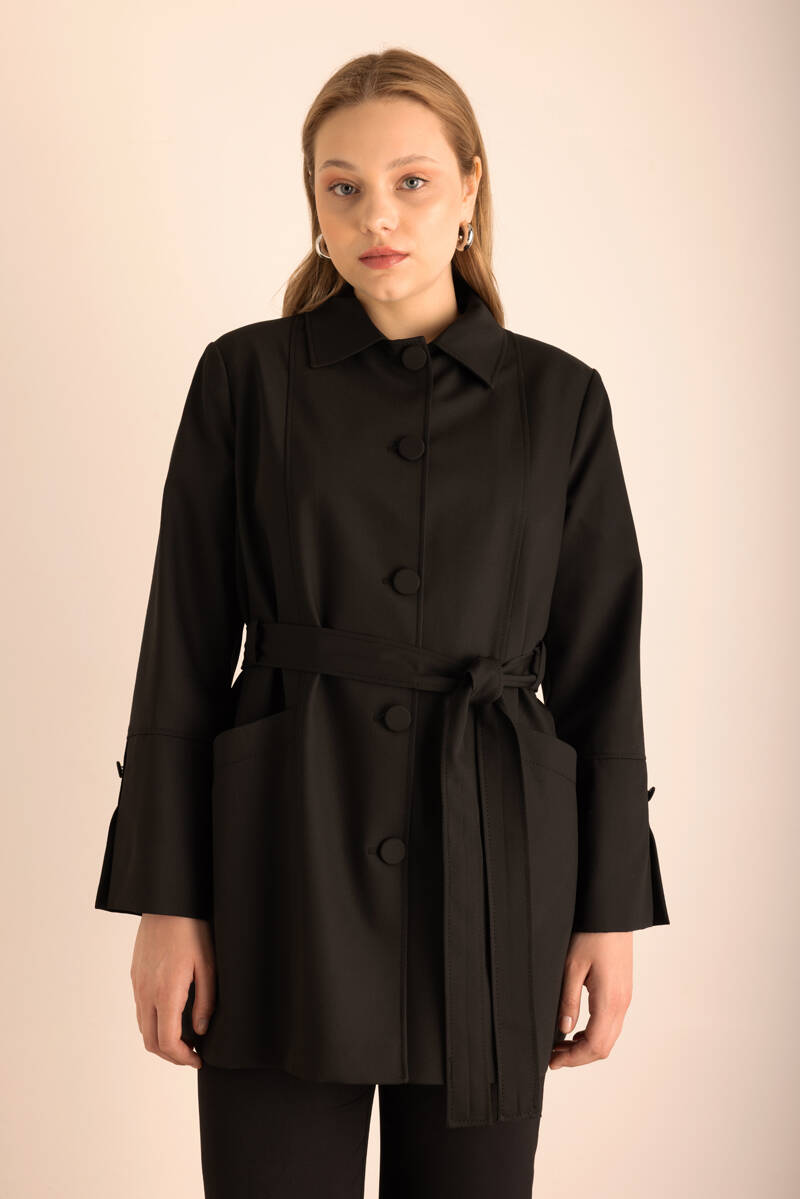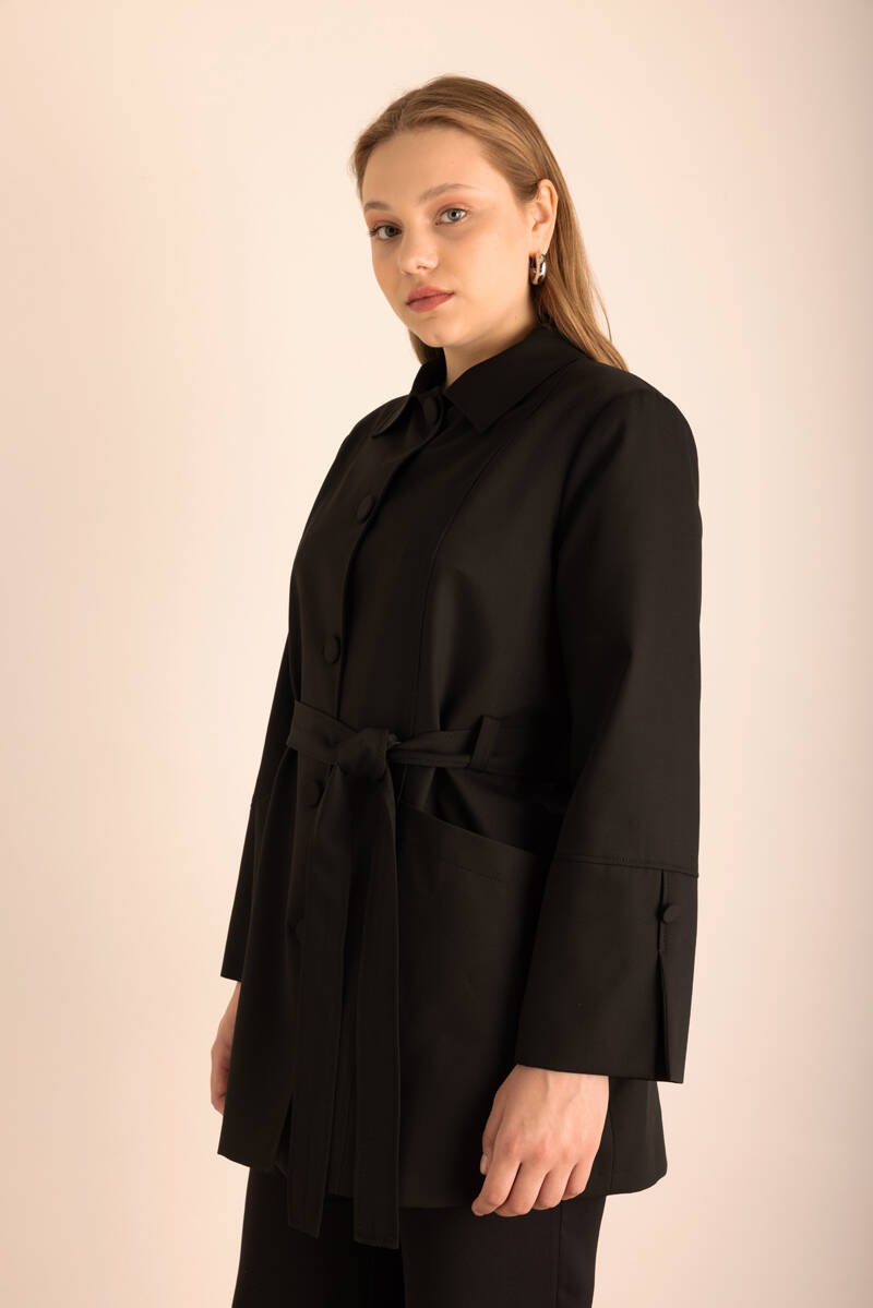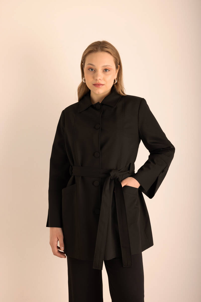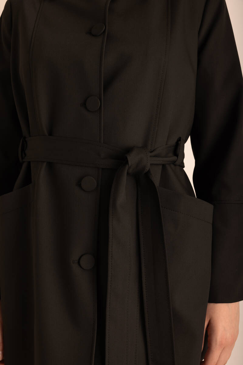 Siyah Kemerli Önden Düğmeli Dokuma Kap