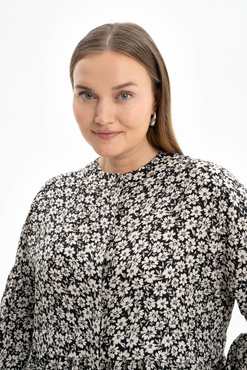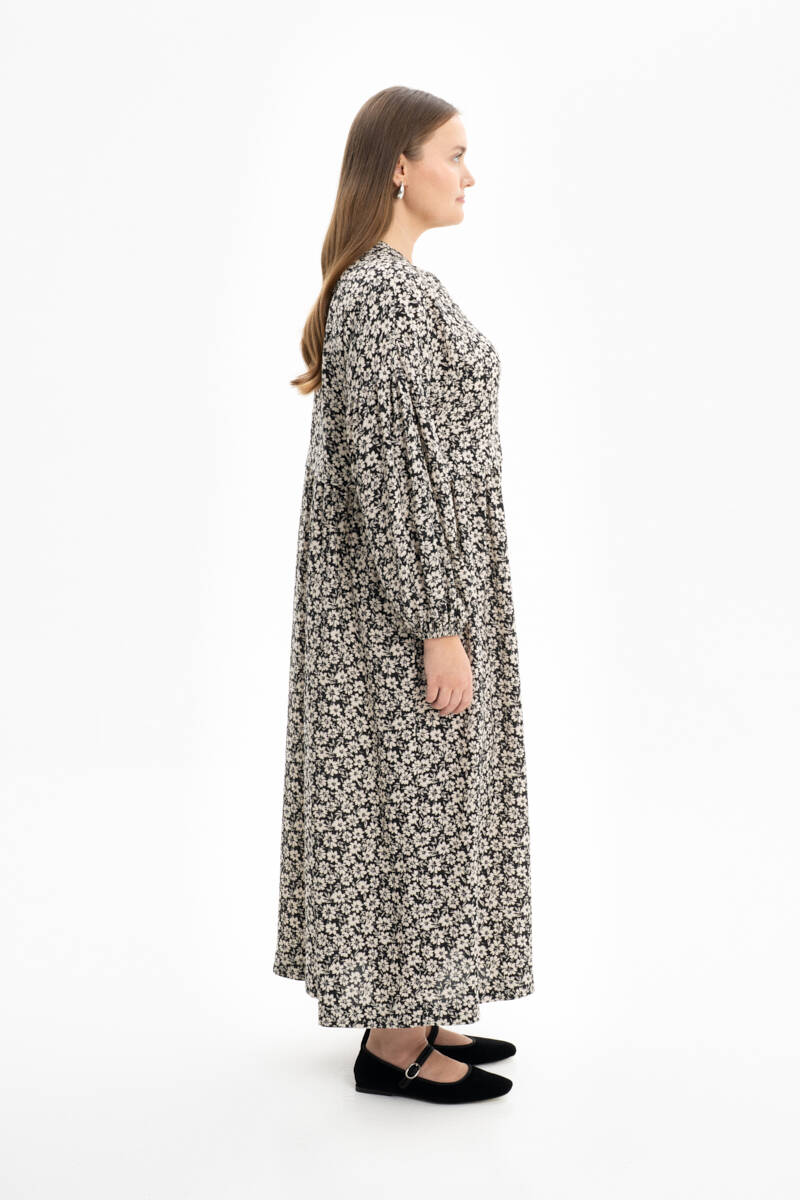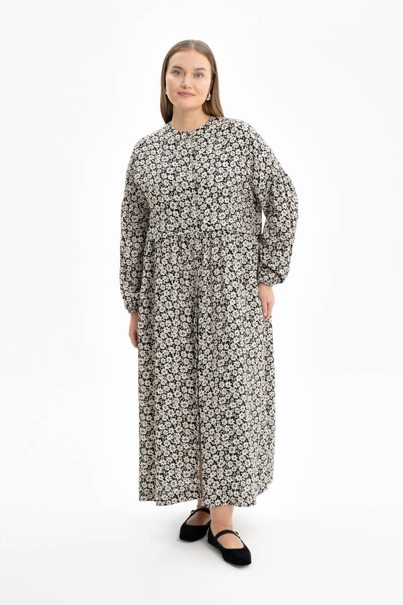 Siyah Desenli Pile Detaylı Elbise
