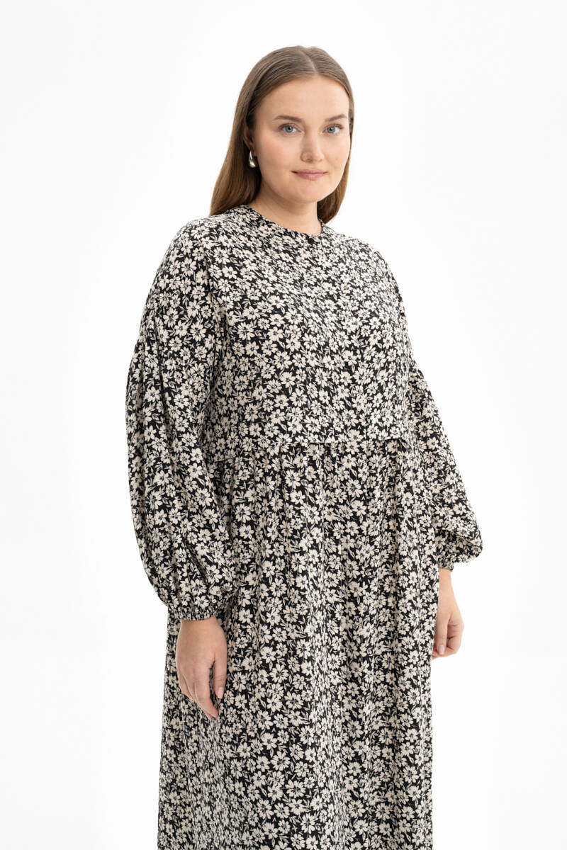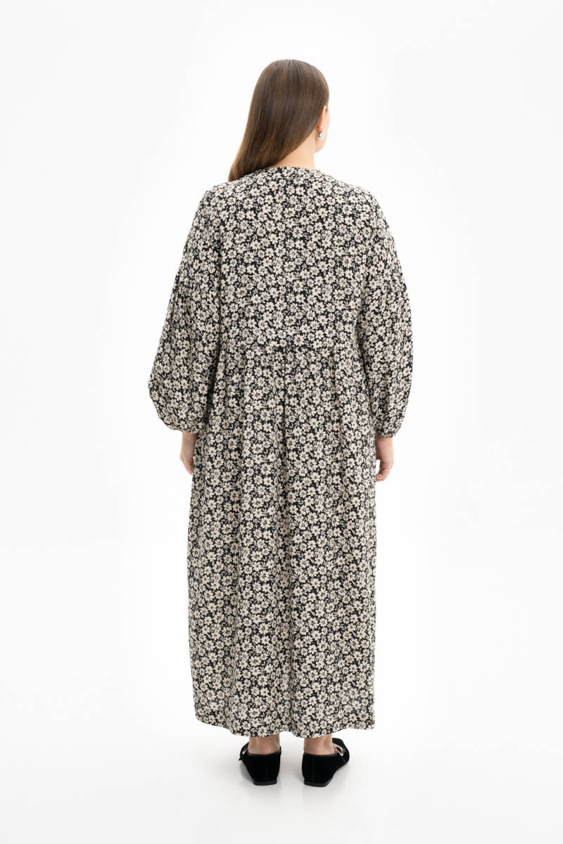 Siyah Kendinden Desenli Balon Kol Elbise