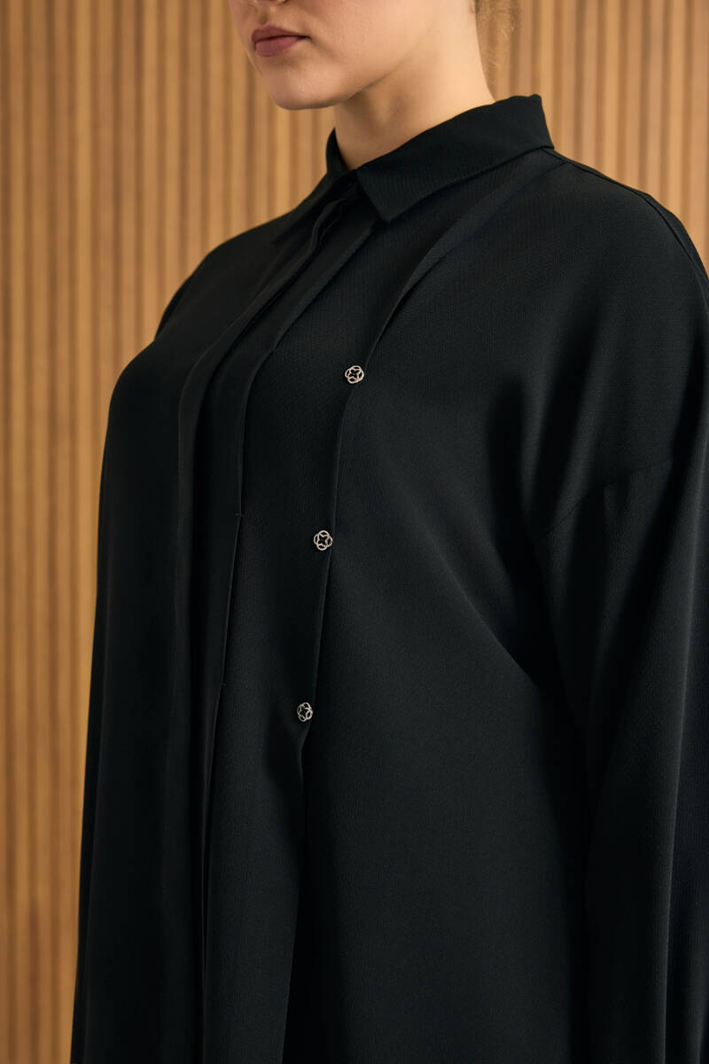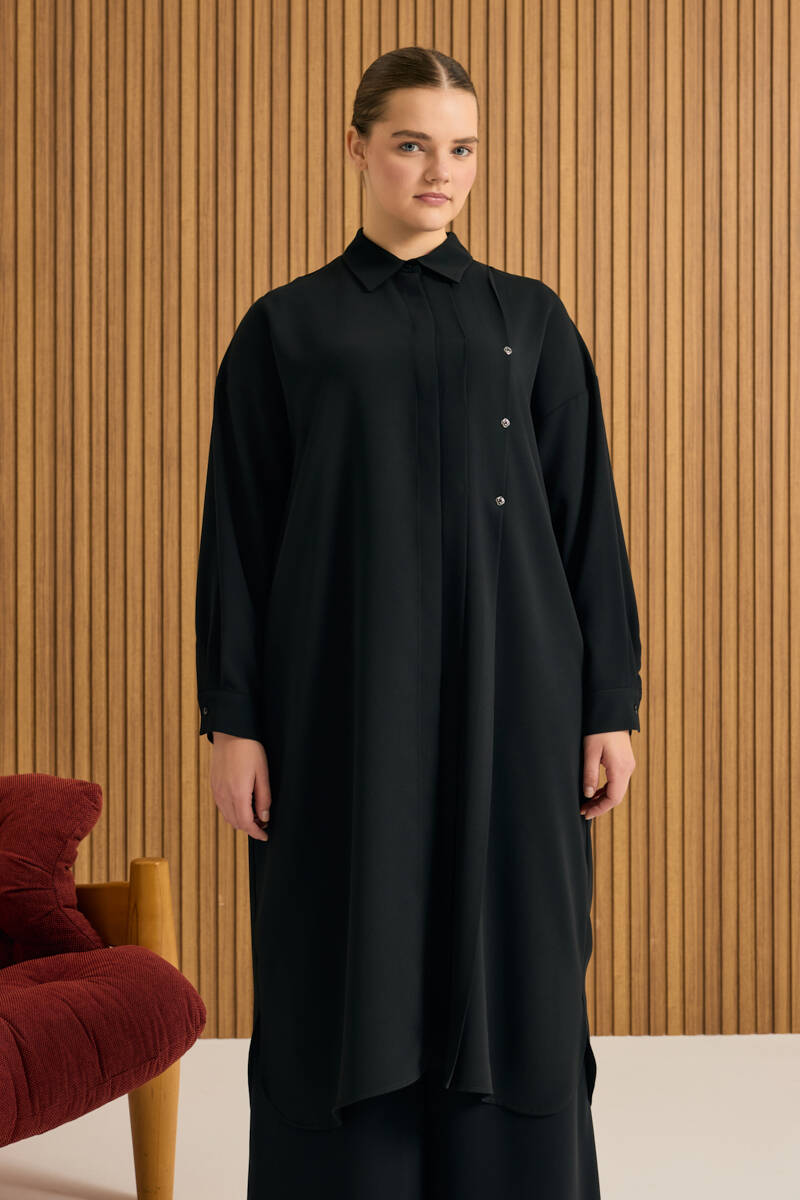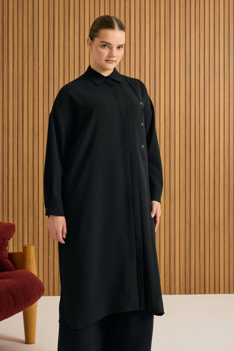 Siyah Yakası Fermuarlı Keten Tencel Tunik