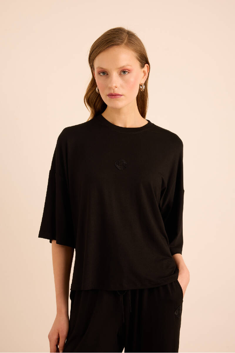Siyah Koza Nakış Logolu Basic T-Shırt
