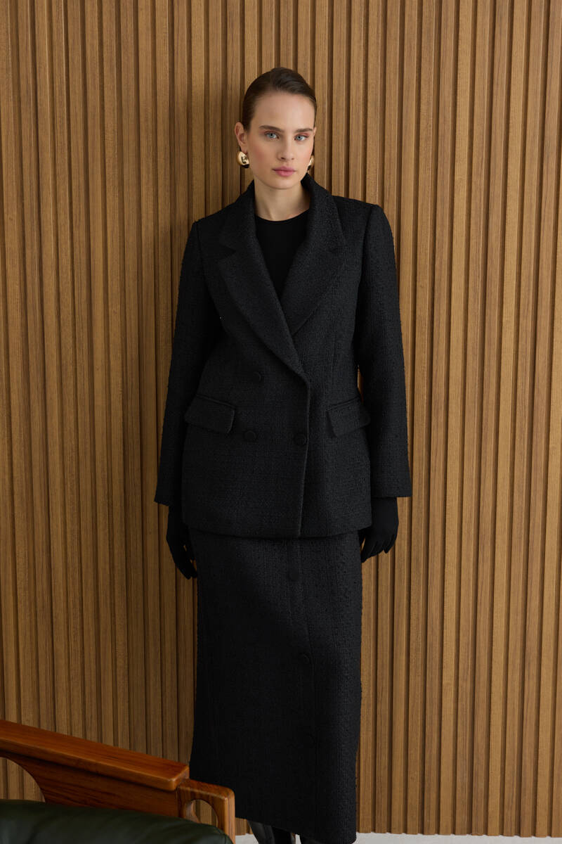 Siyah Önden Düğmeli Tweed Kumaş Etek