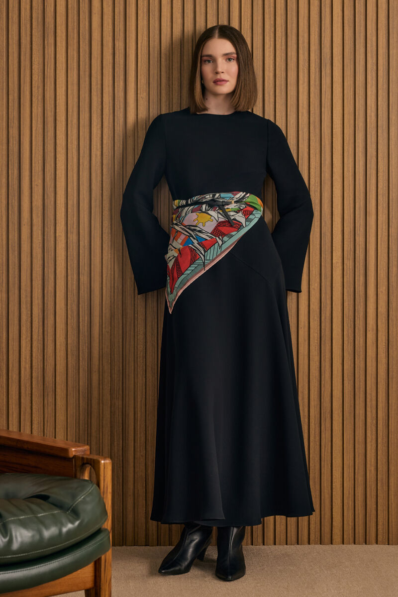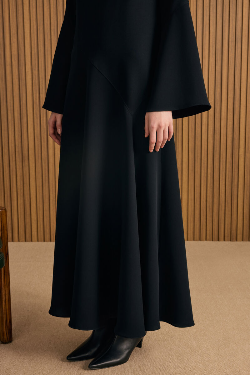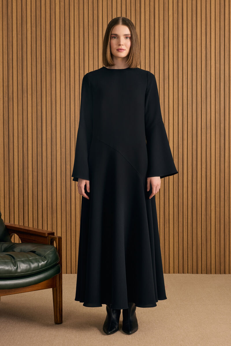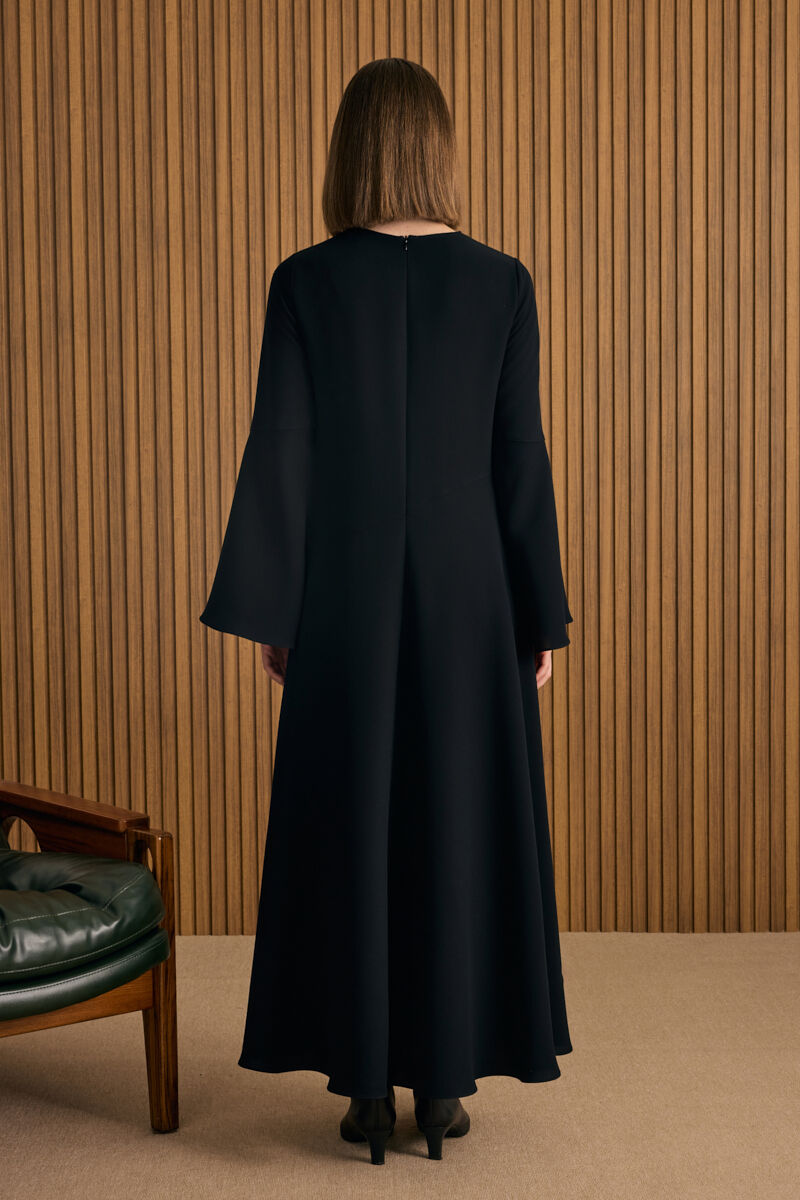 Siyah Etek Ucu Kontrast Nakış Detaylı Elbise